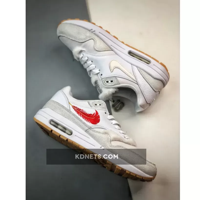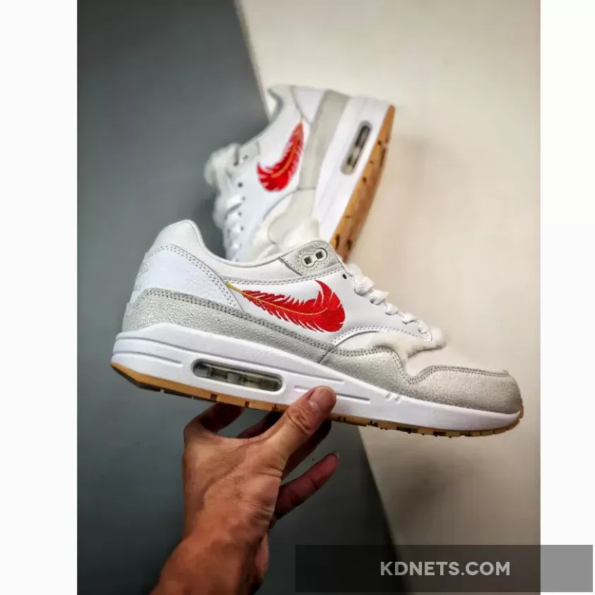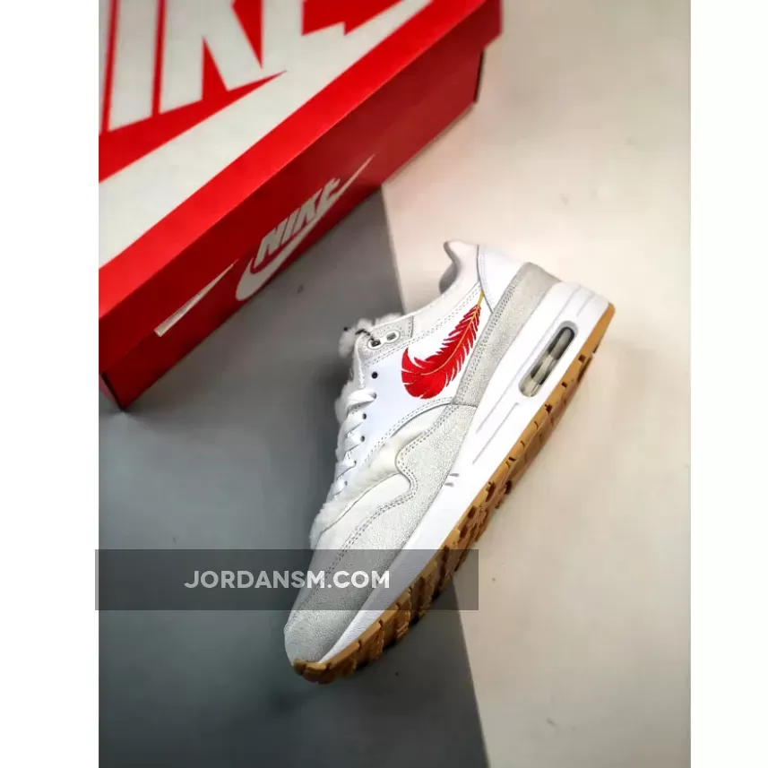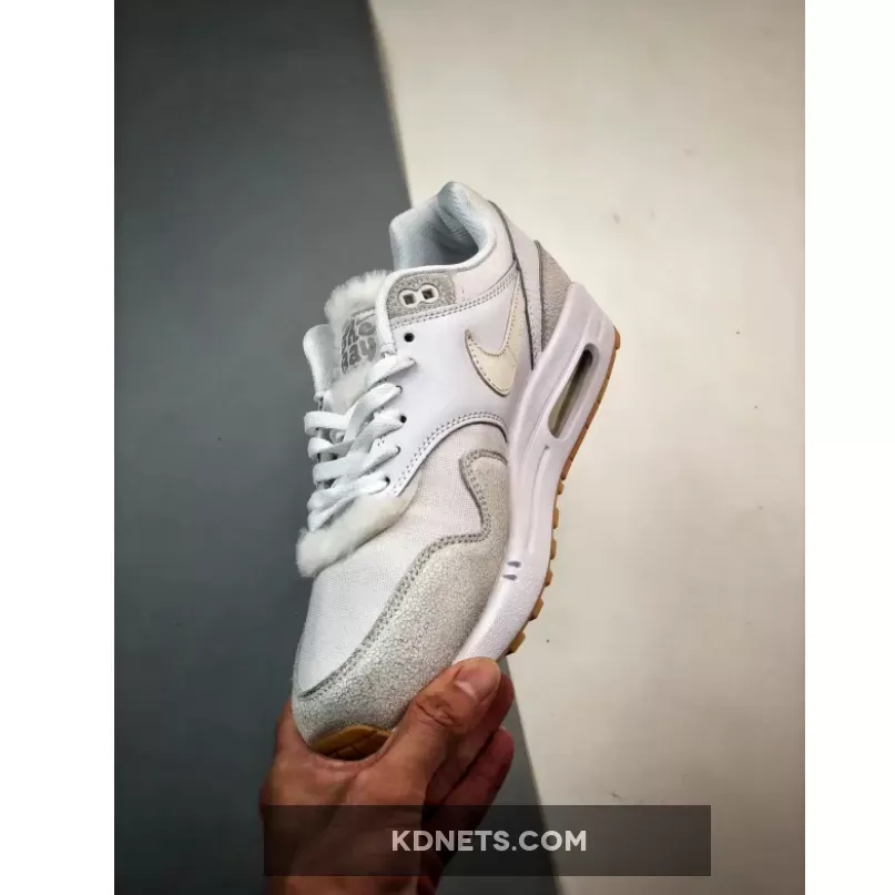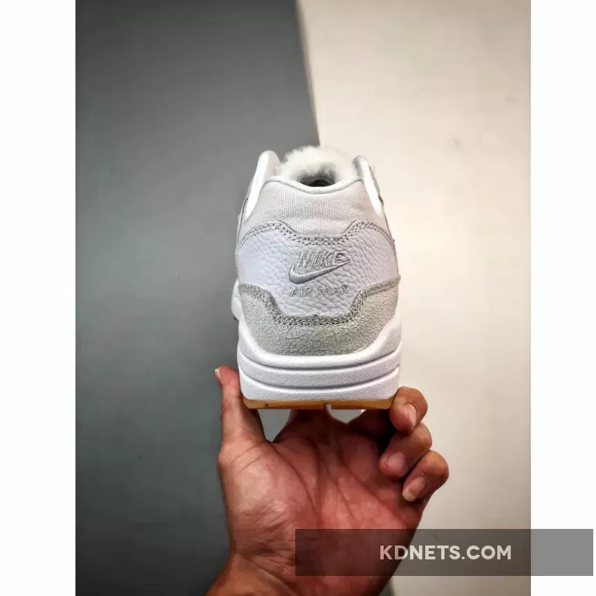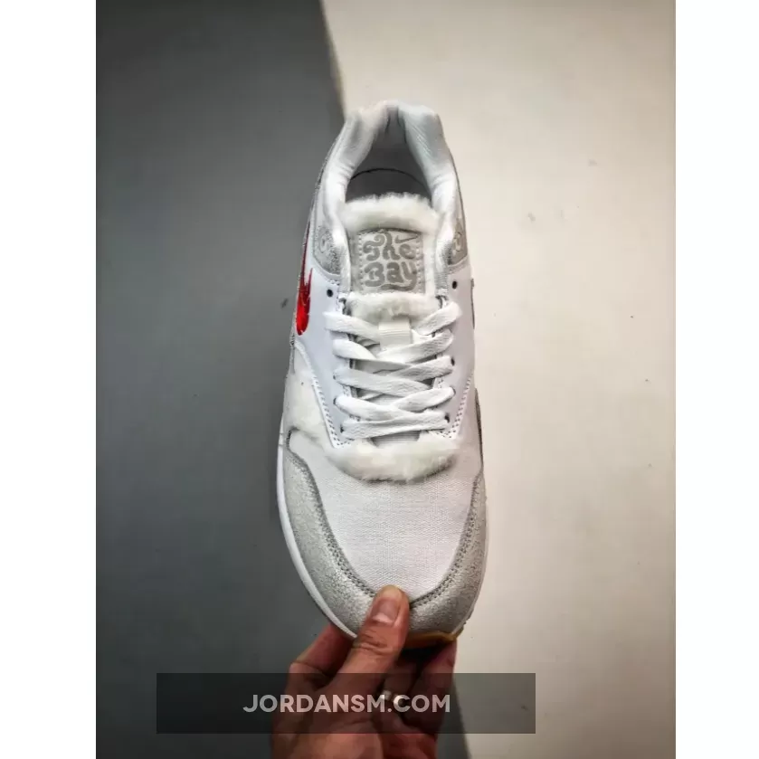 the Nike Air Max 1 “The Bay” features a predominately white leather construction paired with grey suede overlays on the toe, mudguard, and top lacestay.