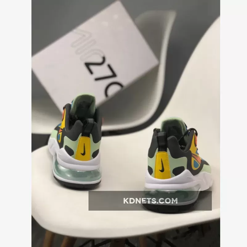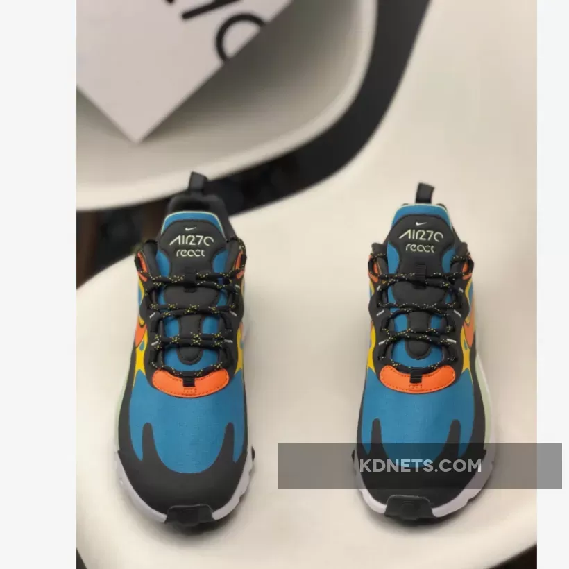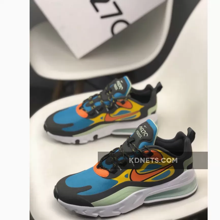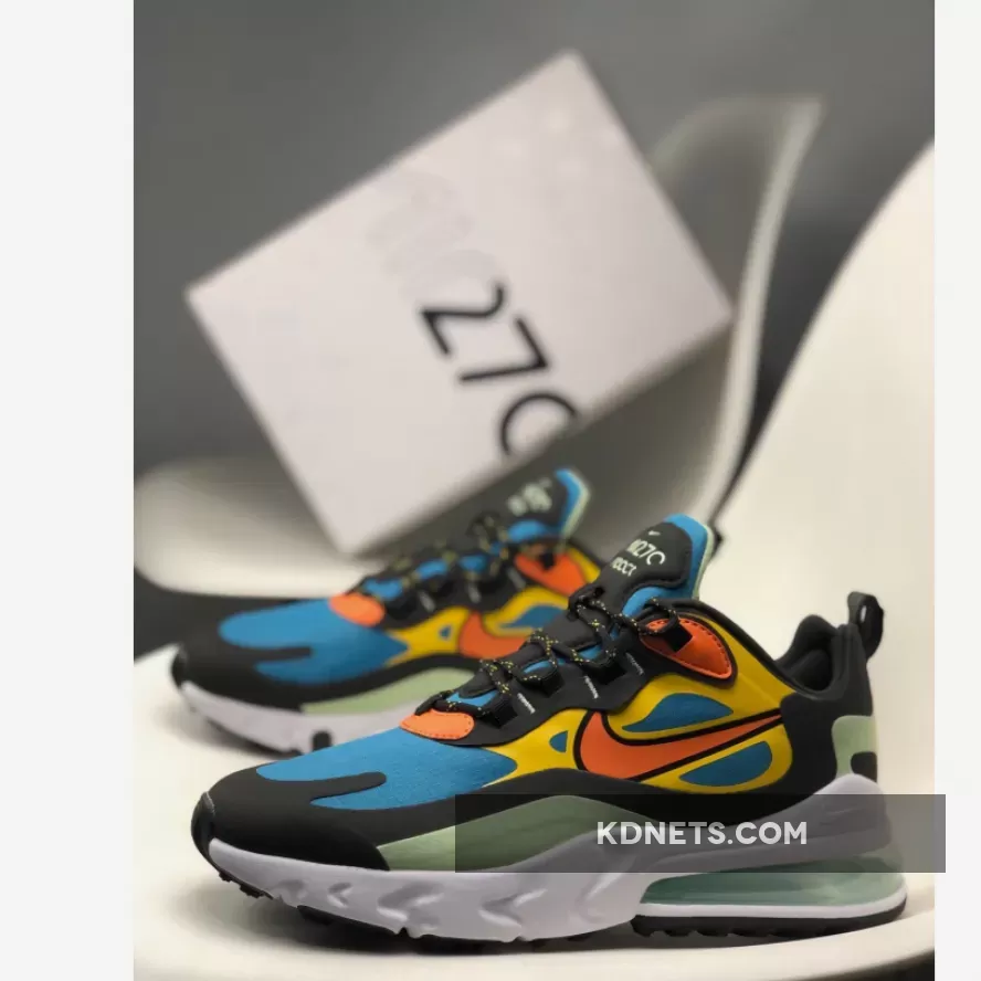 Dressed in a Green Abyss, Black, Laser Orange, and Starfish color scheme. This Nike Air Max 270 React features a Blue base with tones of Orange and Mint Green contrasting accents.