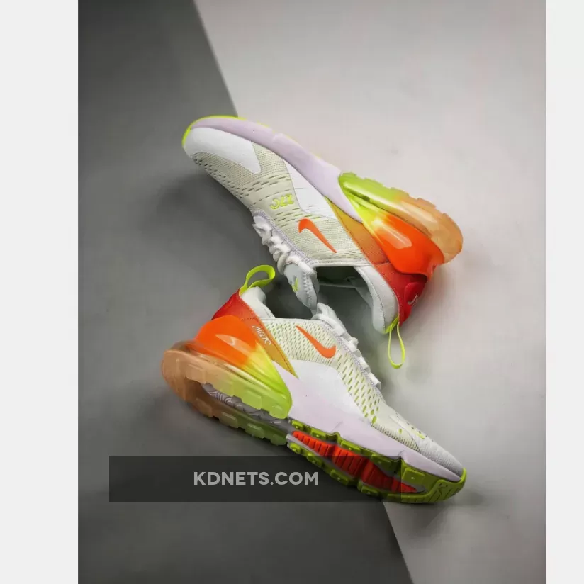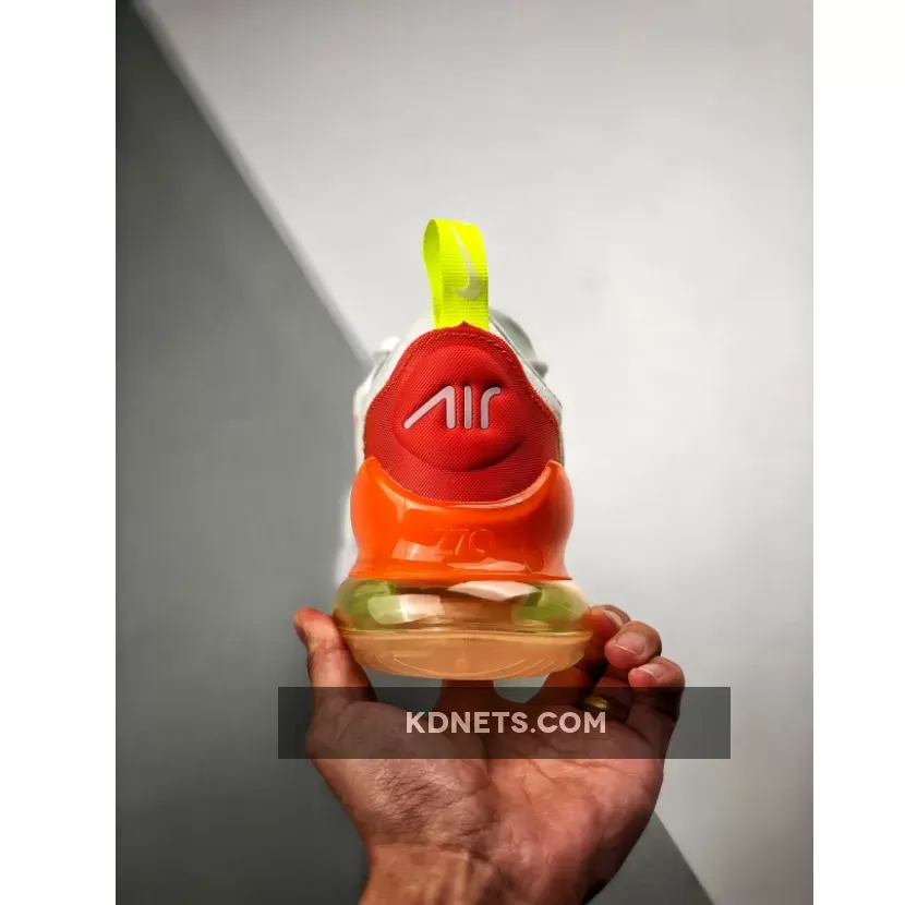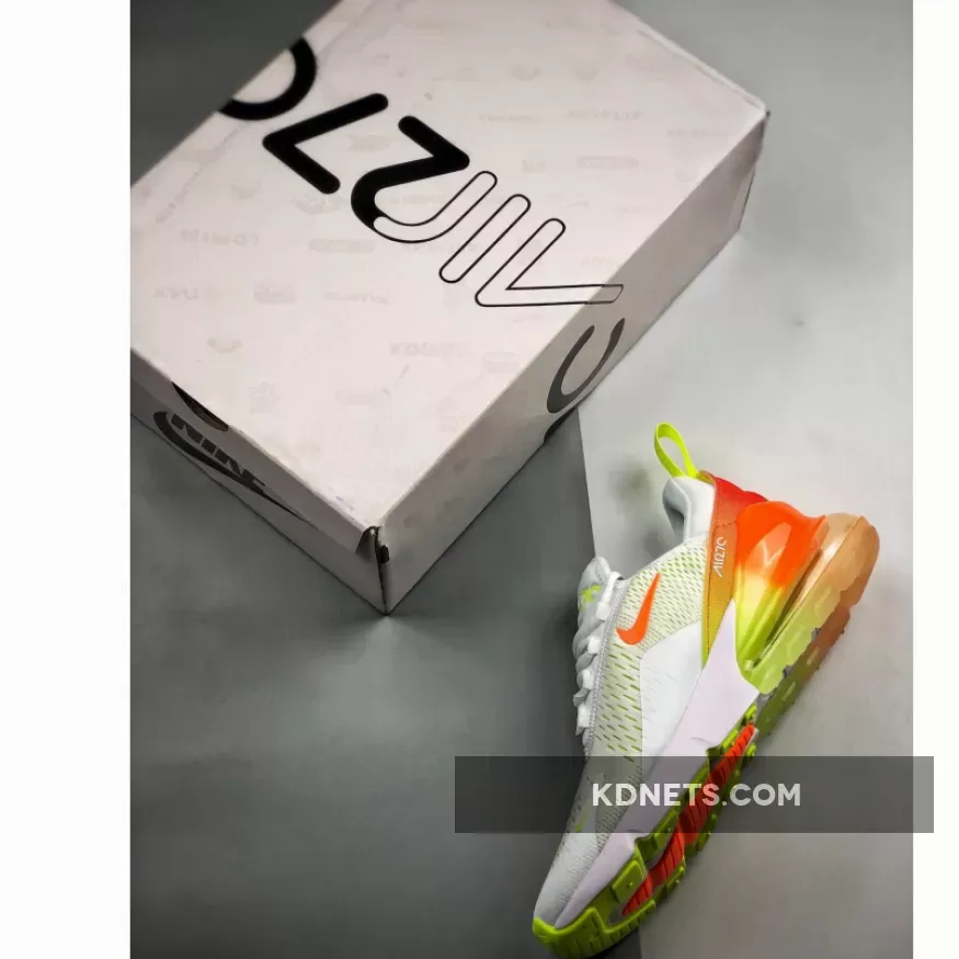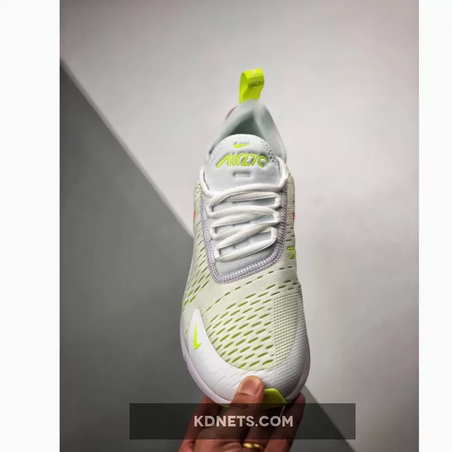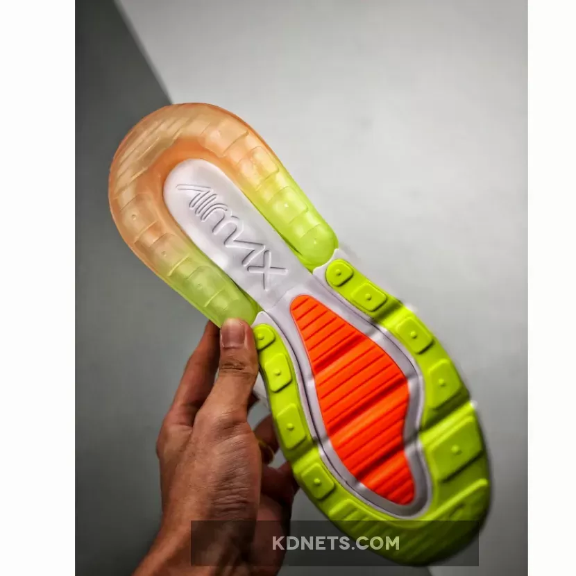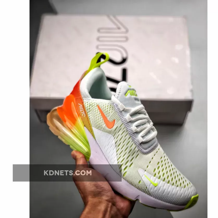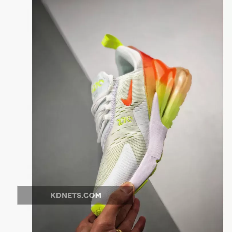 This offering features a White mesh upper with Volt accents on the underlays. Volt continues on the tongue, pull tab, and outsole along with a gradient Air Max 270 heel unit that fades into Orange completing the summer vibe.