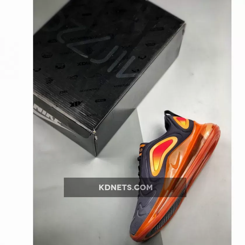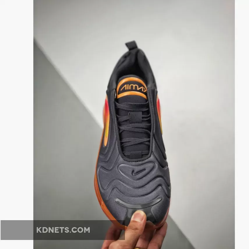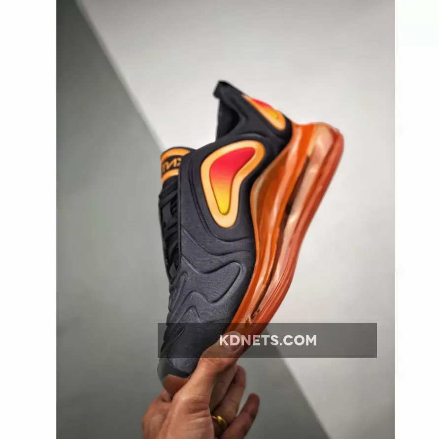 Dressed in a Black, Fuel Orange, Orange Pulse, and Yellow Pulse color scheme. This Nike Air Max 720 features a Black upper covered in Orange hues with hints of Yellow contrasted in a gradient effect on the overlays.