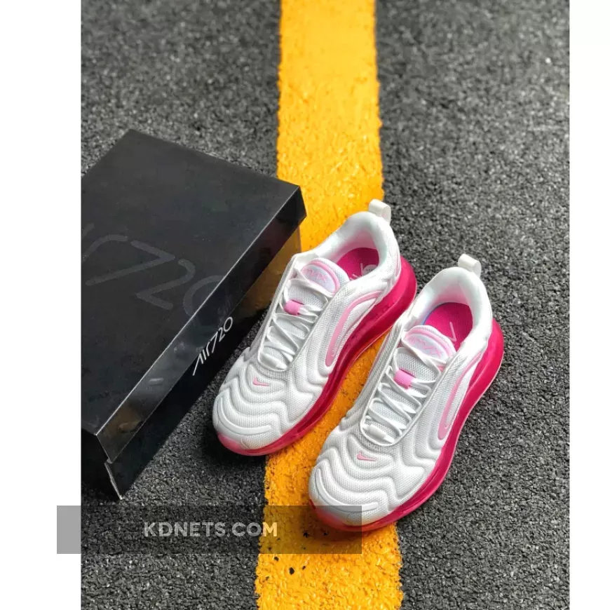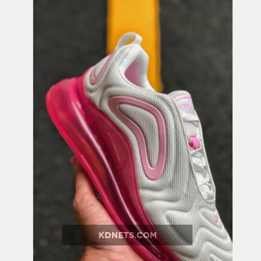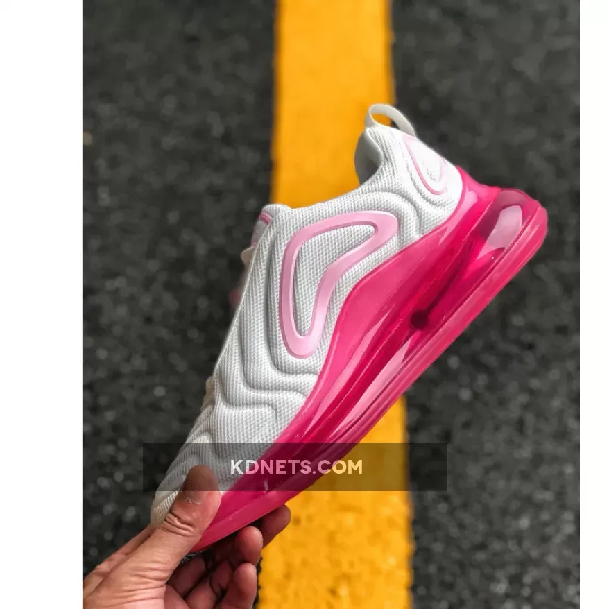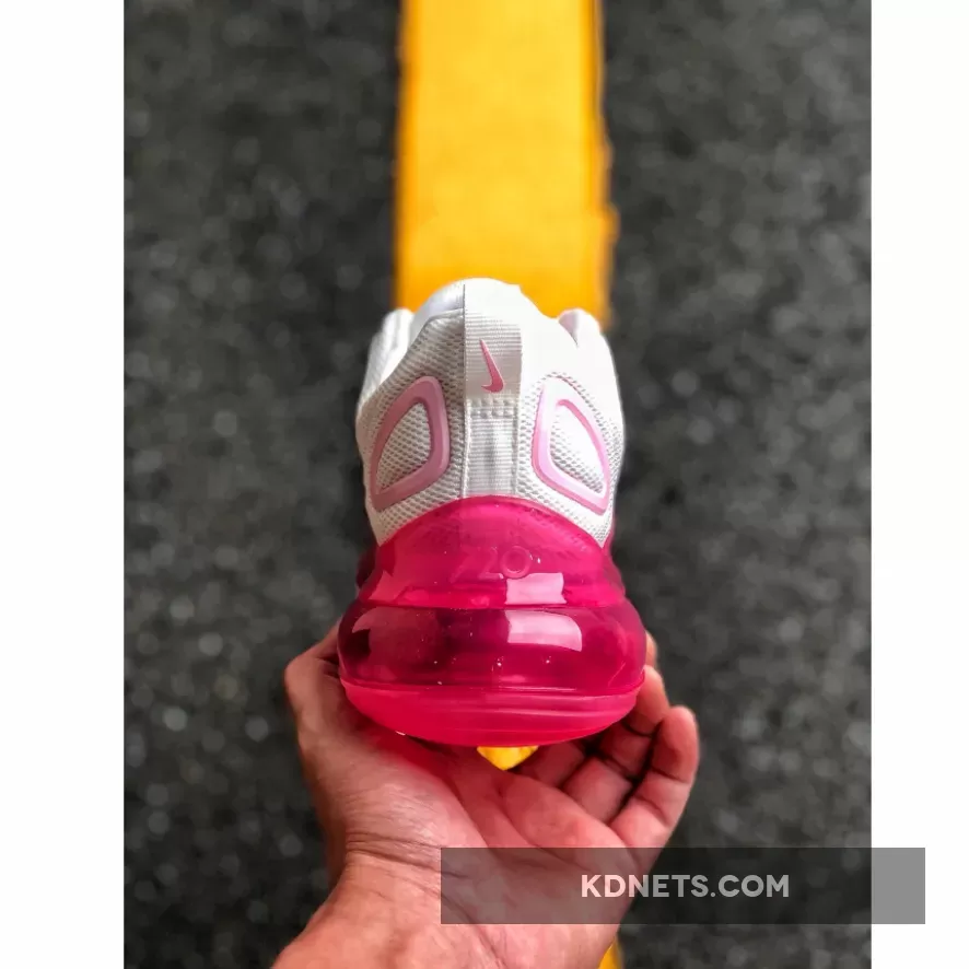 Dressed in a White, Pink Rise, and Laser Fuchsia color scheme. This Nike Air Max 720 features a White mesh upper paired with a lighter tone of Pink on the plastic overlays and darker tone on its full-length Max Air sole unit.
