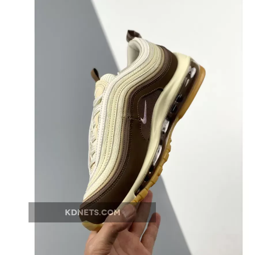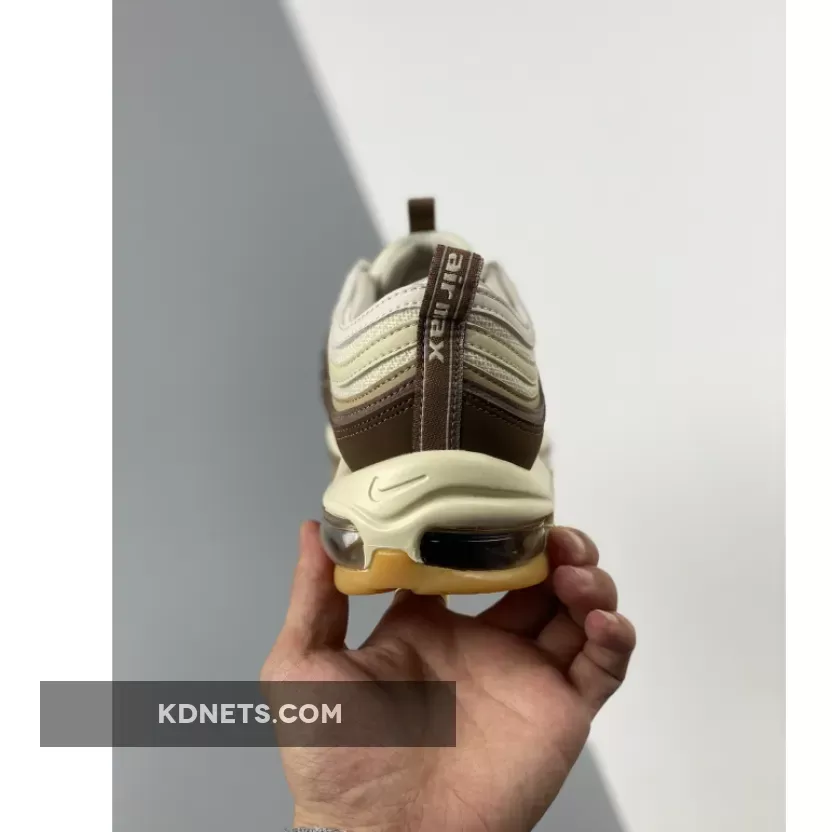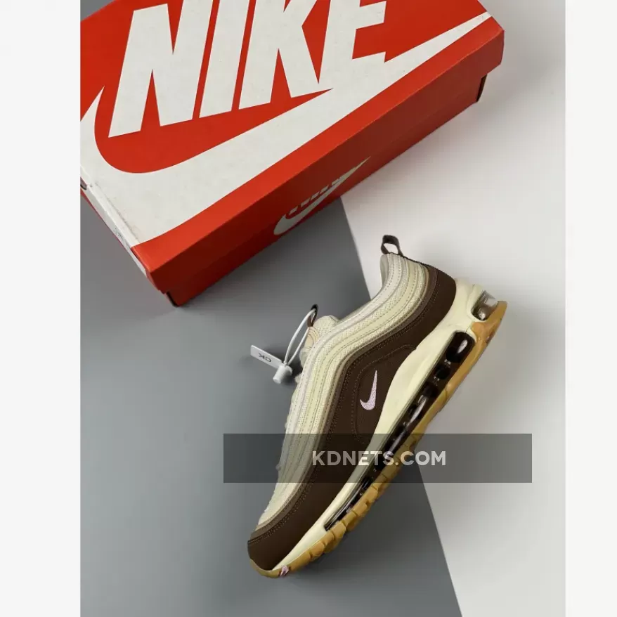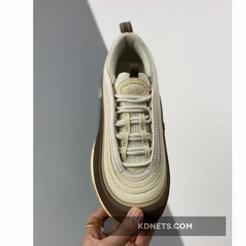 Apparently, the tongue area is fashioned with the off-white hemp canvas materials. These tongue flaps are embellished with swoosh branding tags made with cream white hues and a small brown pull tab attached to the lining. The center white uppers are then surrounded by brown suede mudguards in the form of characteristic foliated designs of Air Max 97 silhouette.