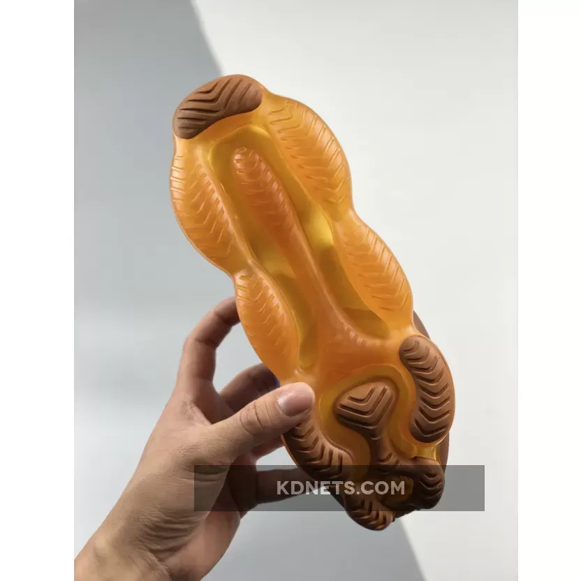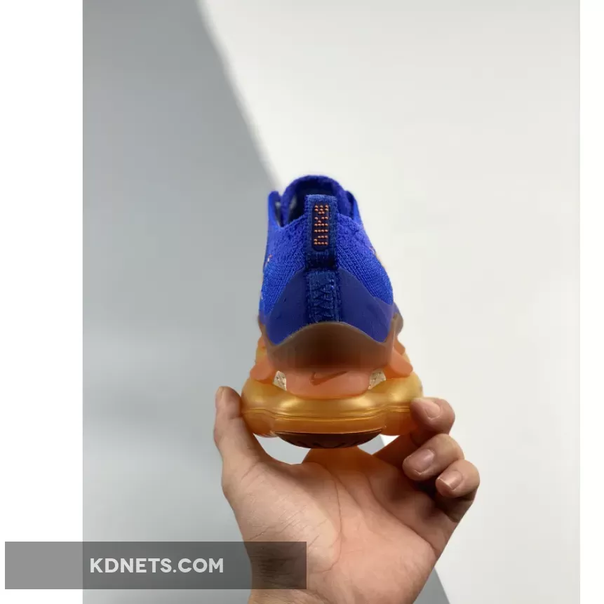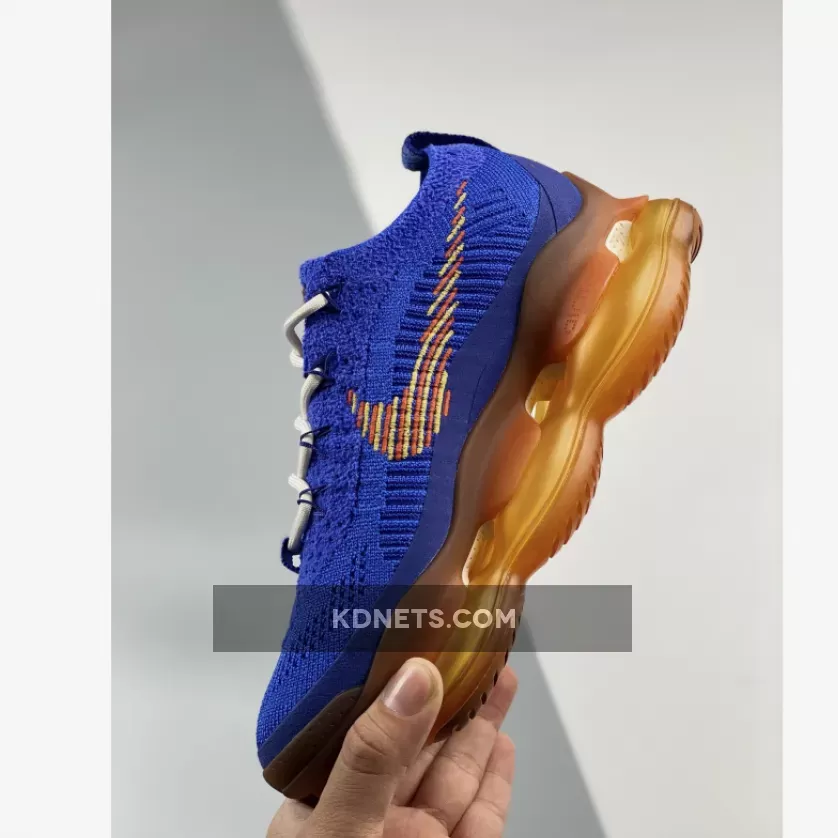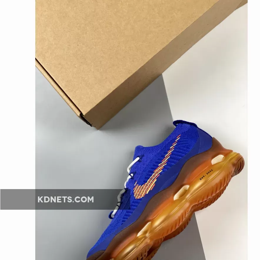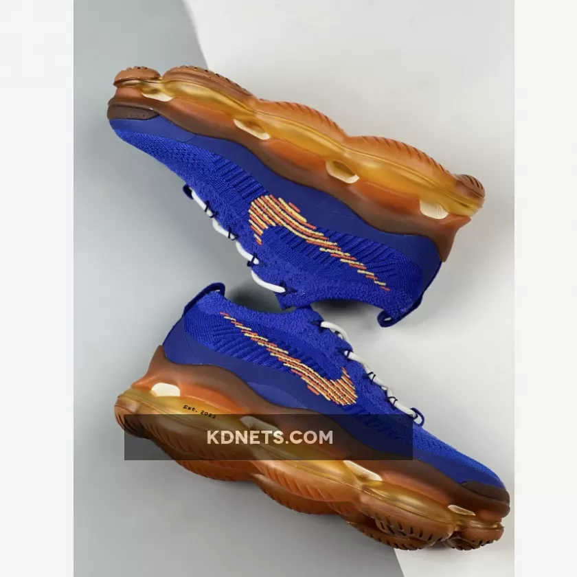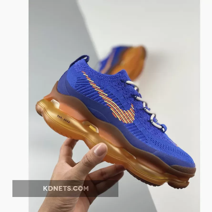 The Nike Air Max Scorpion “M. Frank Rudy” sports a predominately “Racer Blue” and “Game Royal” woven upper accented with contrasting “Safety Orange” and “Team Gold” on the profile Swooshes and tongue branding.