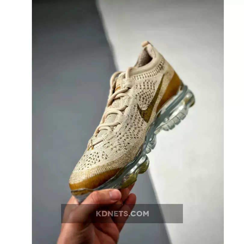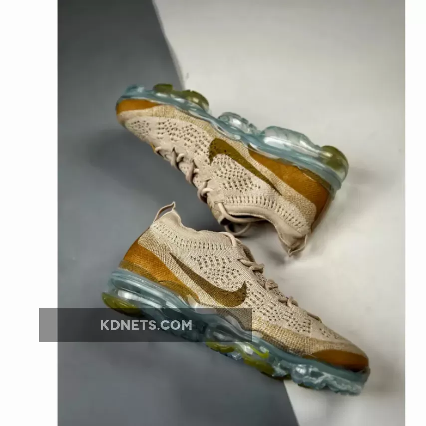 The all-new Nike Air VaporMax 2023 Flyknit continues to pop in new different colorways as today we take a look at one of the best pairs yet which comes covered in a versatile tan hue. This newest addition to the growing Nike VaporMax line gets covered in a lightweight and breathable Flyknit construction all over the upper in tan with olive Swooshes on the side panels and a brown/gold-like hue noted on the toe and and heel reinforcements. Additional details include Dynamic Flywire cables for lockdown and support, VaporMax branding on the tongues and heels, and a blue-tinted full-length VaporMax sole unit down below.