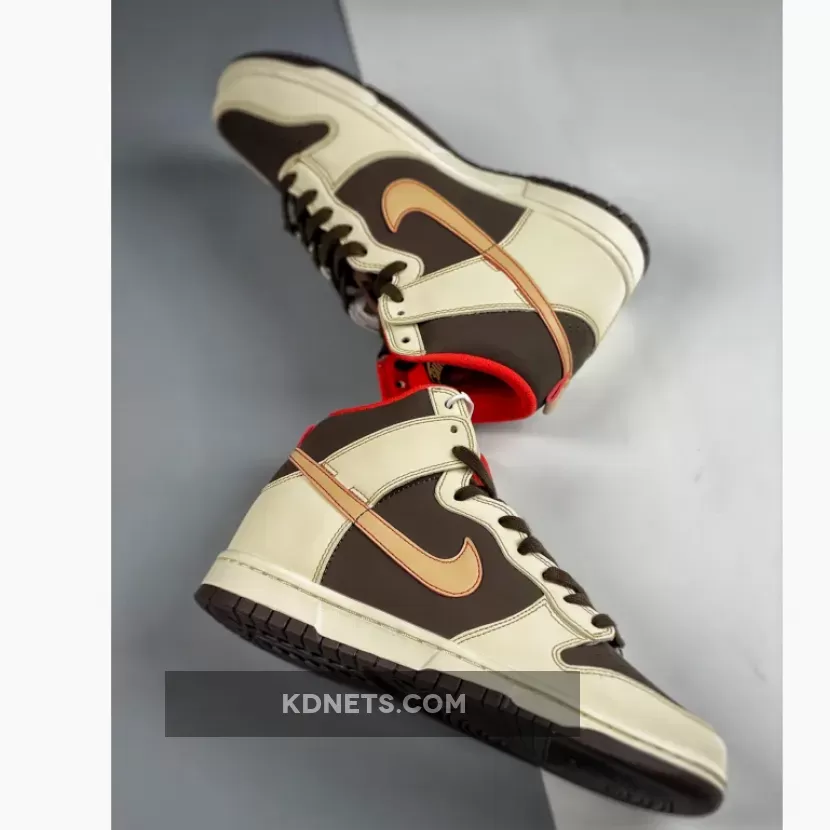 The Nike Dunk High showcases a striking color palette of Baroque Brown, Sesame, Coconut Milk, and Mystic Red. Its design encompasses premium nubuck in Brown, covering the toe box, quarter panels, and collars, while overlays sport Sesame hues. Hints of a bold red hue poke out through the interior liners, heel tabs and the exposed stitchings on the checks, and these match up with the Nike and Cactus Jack branding that have been seen on Scott’s previous Air Jordan 1 offerings. Completing the look are Coconut Milk Swooshes, branded tongue labels, Brown mesh tongues, and a rubber outsole with a Nike Basketball motif stamped on the insoles.