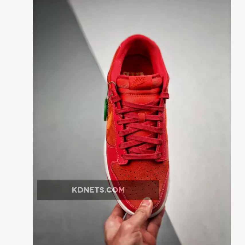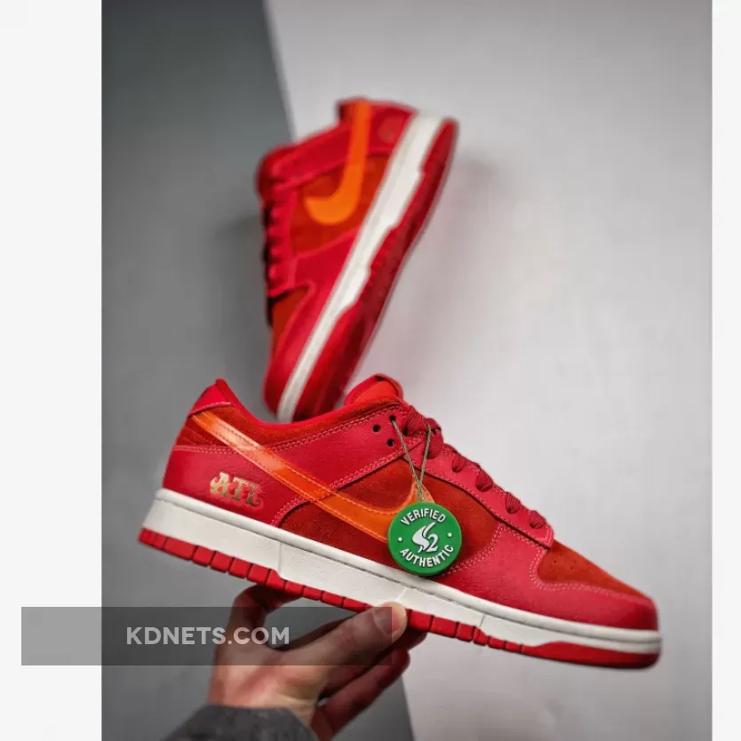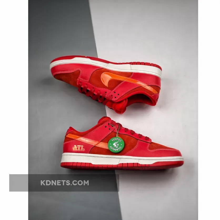 This offering of the Nike Dunk Low sports a Crimson Red base constructed in a mix of suede and leather materials with mesh tongues and lining. The Nike Dunk Low is constructed with a mix of leather and suede materials along with mesh tongues and lining. The suede highlights the entire upper and the overlays, while the Swoosh features an orange tint and is made of patent leather. Golden “ATL” branding luxuriously accents the heel counters and insoles, completing the design atop white and red sole units.