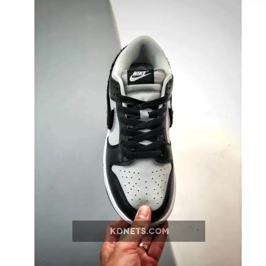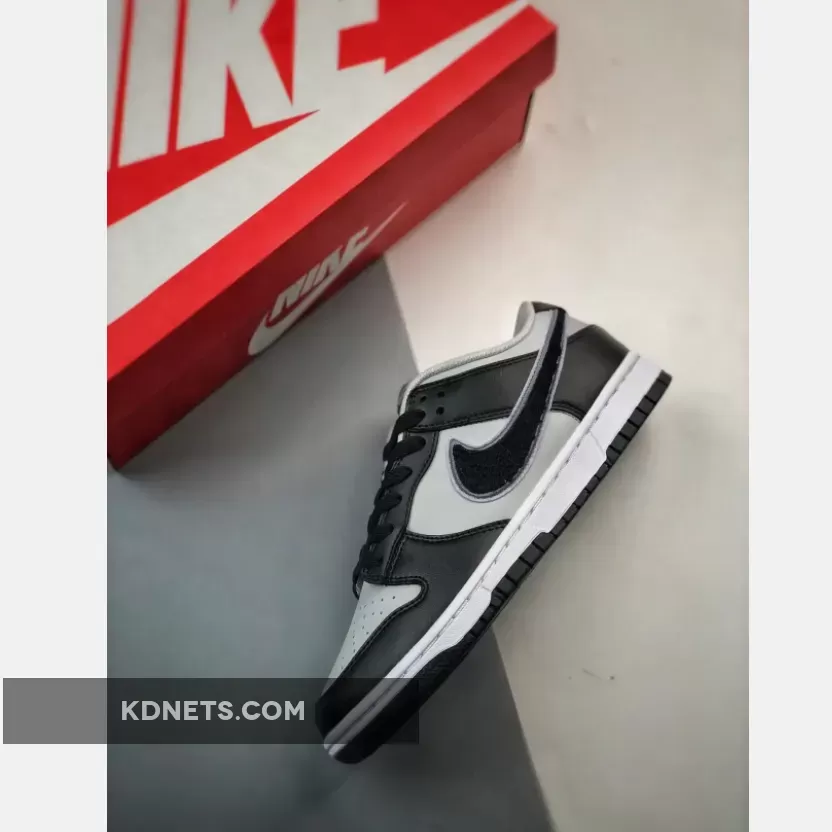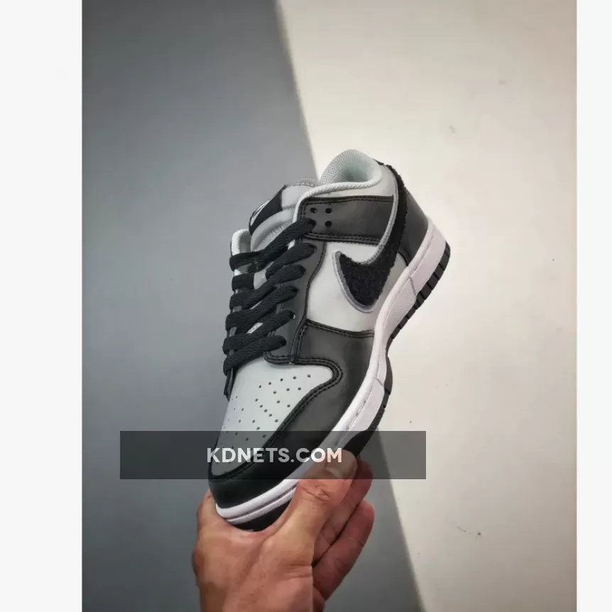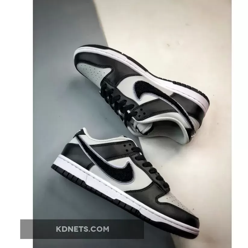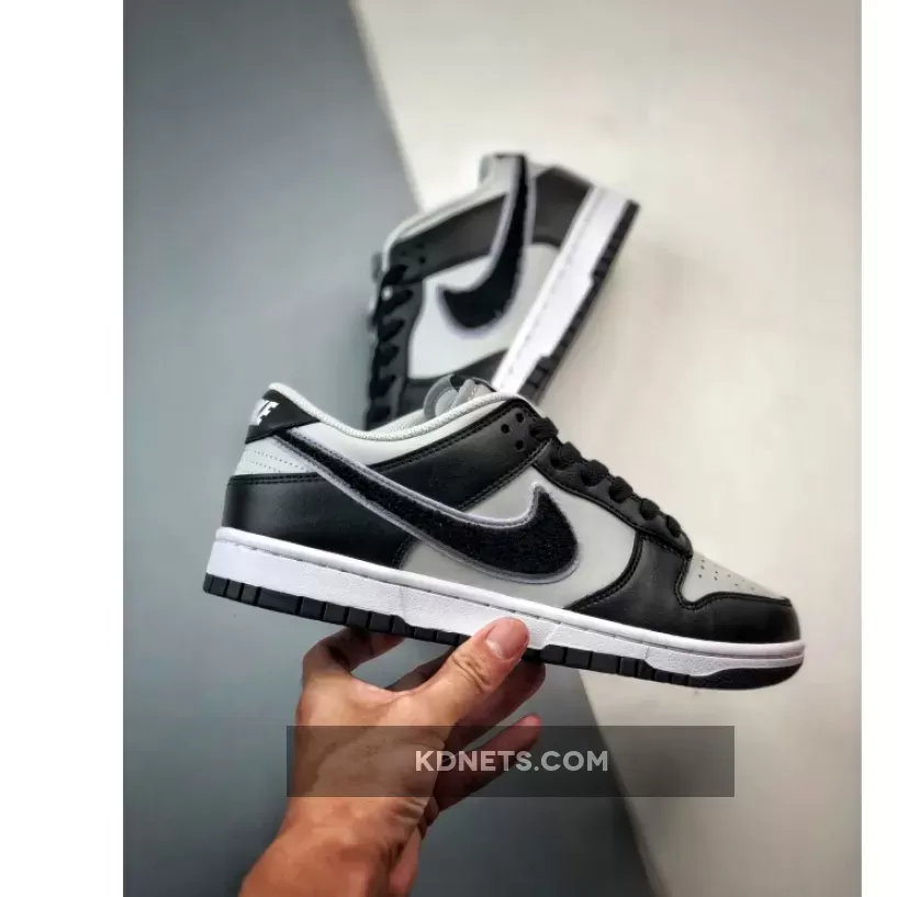 The Peter Moore-designed Nike Dunk has featured a lot of materials and looks in its 37 years of existence, from snakeskin to leopard print to a wear-away design. The latest Dunk comes with a unique chenille Swoosh that hasn’t been seen on a Dunk in a long time. Meet the Nike Dunk Low Chenille Swoosh Grey Black.