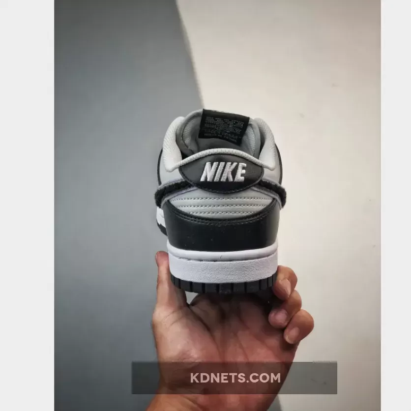 This Dunk Low has a classic two-toned palette. Its leather upper has a light grey base and black overlays.