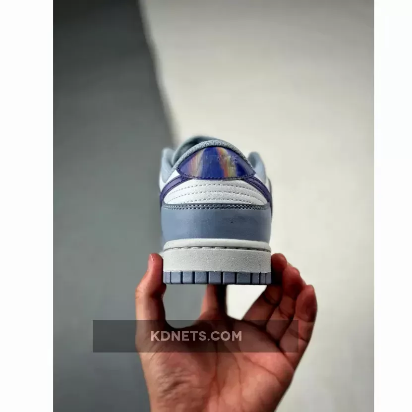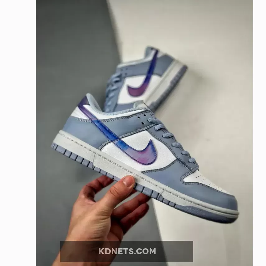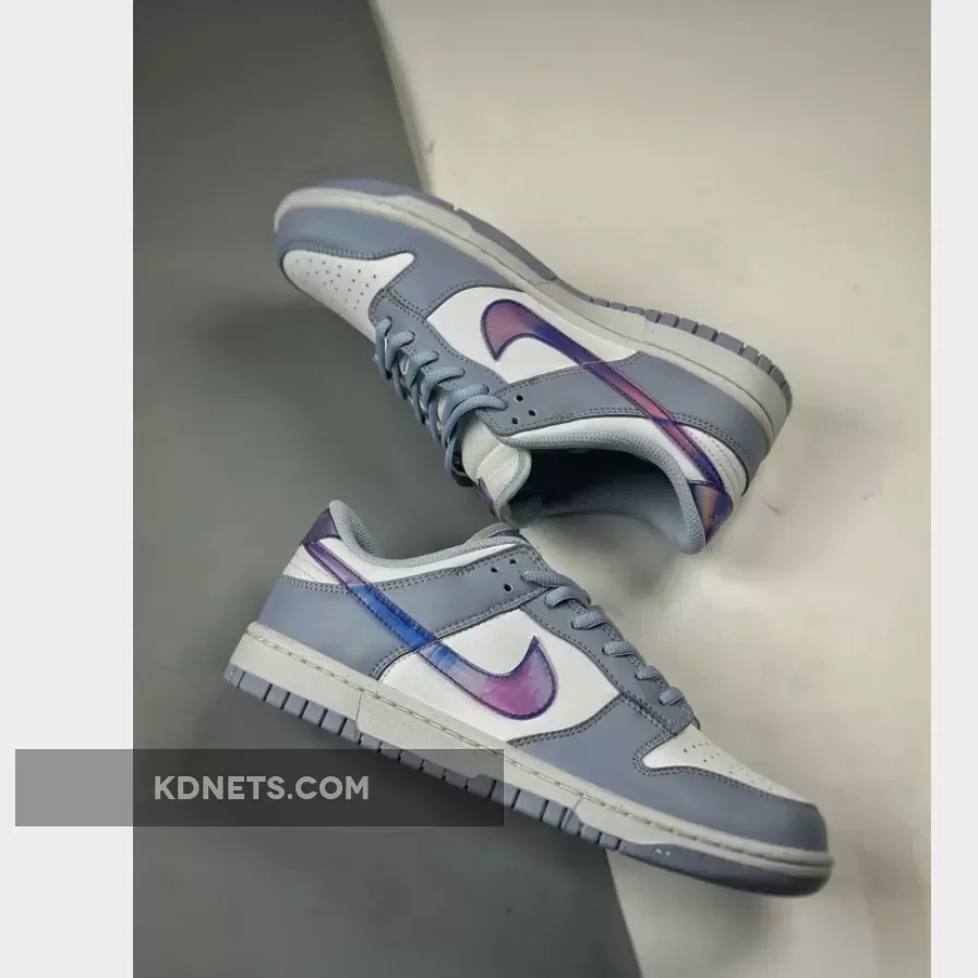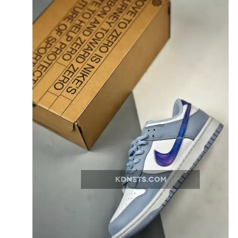 This grade-school colorway of the Nike Dunk Low is given a leather upper consisting of a White base and contrasted by the Muted Blue overlays. More Blue hits land on the laces as well as the mesh tongues and lining. The sneaker is is highlighted by the iridescent hits on the Swooshes, tongues, and heels. A Nike Grind two-tone rubber outsole and insoles housing Nike’s pinwheel logo complete the look.