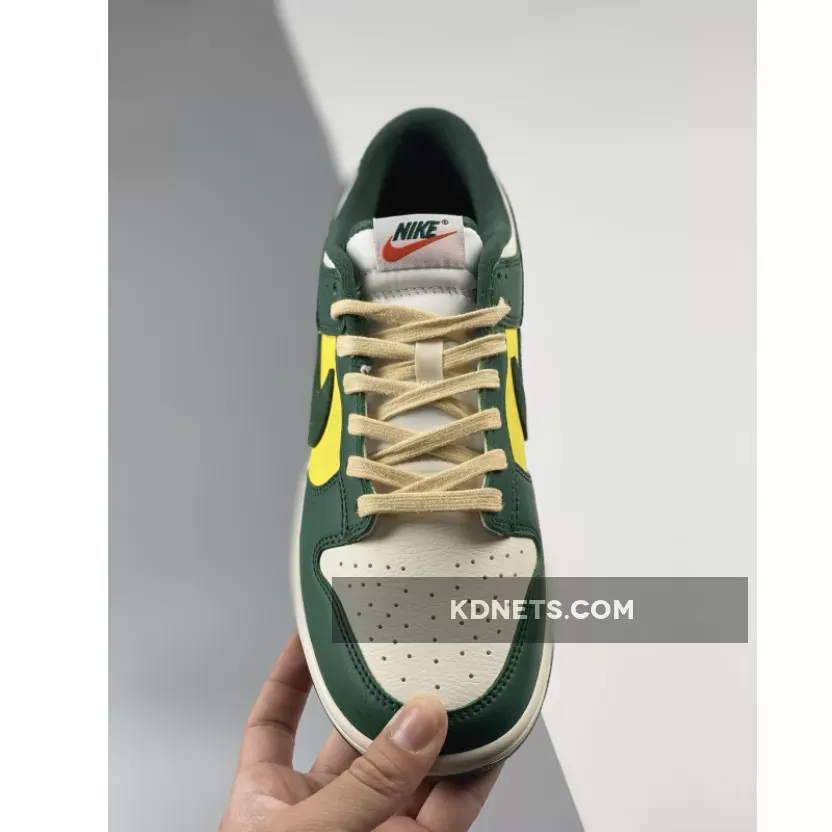 Coming with a mixture of tumbled leather and suede, the sneaker comes dressed in shades of noble green, sail, yellow, and a vintage tan hue throughout the entire upper. the Nike Dunk Low “Noble Green” makes full use of its titular color, applying it throughout the tumbled leather overlays as well as the suede Swoosh. Wheat laces create an aged effect while a classic white midsole rests atop its signature green shade at the outsole. Retro-branded tongues, “Athletic Company” insoles atop a two-tone rubber sole completes the design.