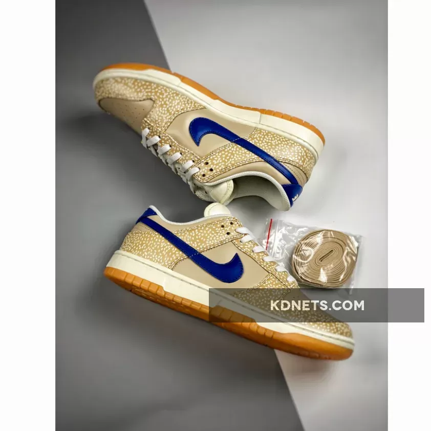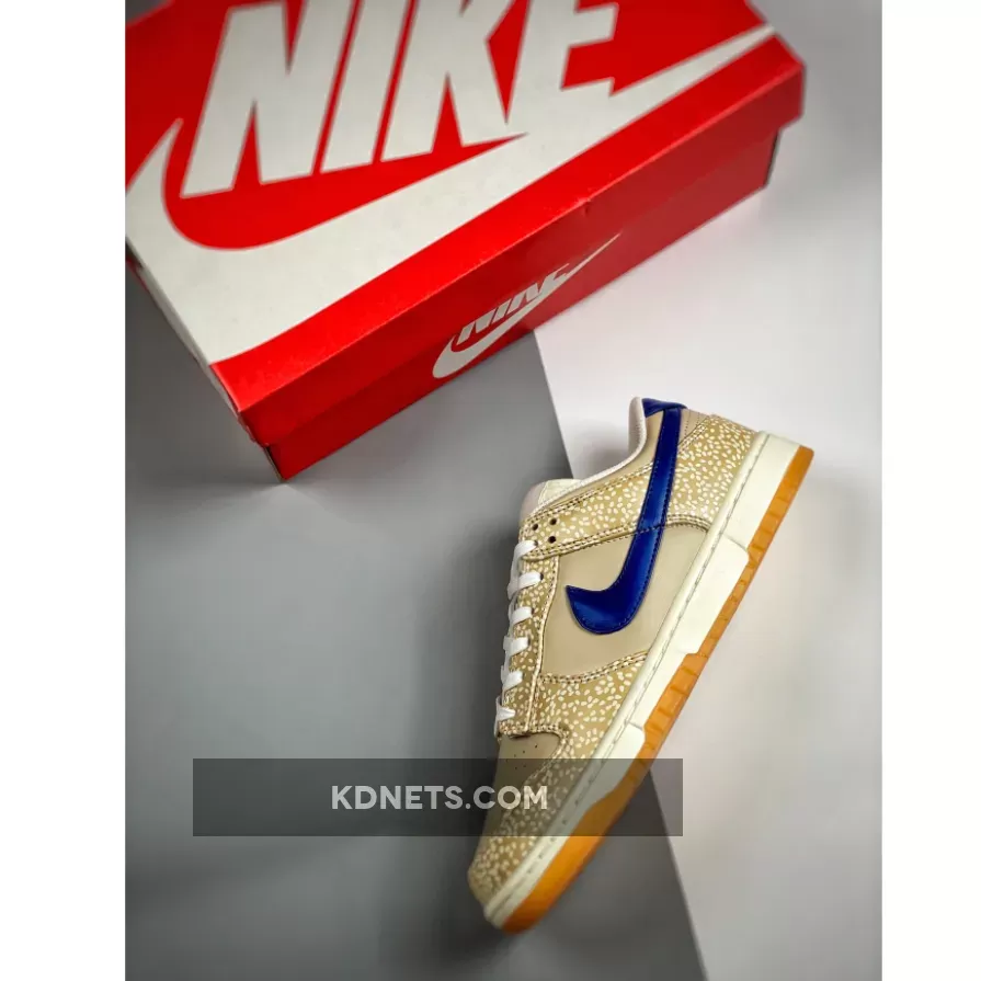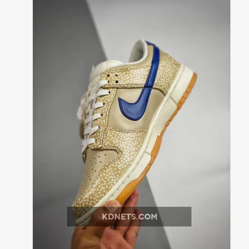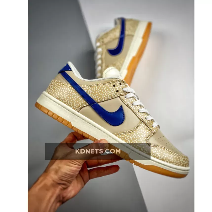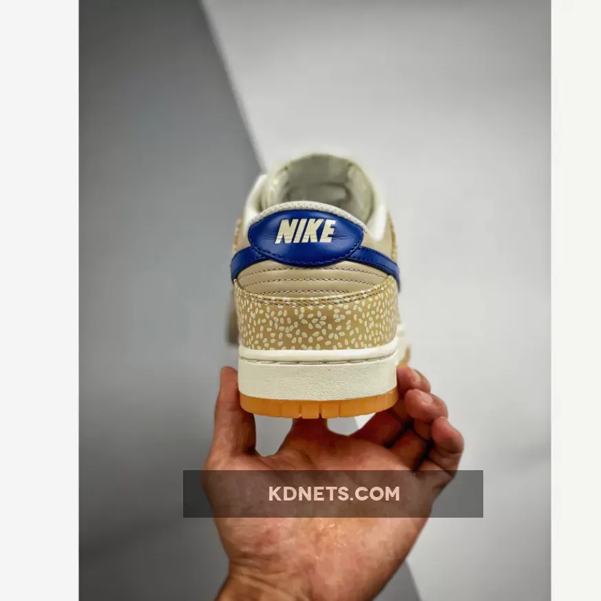 This offering of the Nike Dunk Low features tonal leather uppers detailed with sesame seeds used on the overlays. Blue heel tabs and a blue Nike Swoosh add pops of contrast before tonal tongue tabs return the pair to its theme. Finally, a white and gum sole unit sits underfoot, complementing the colour palette.