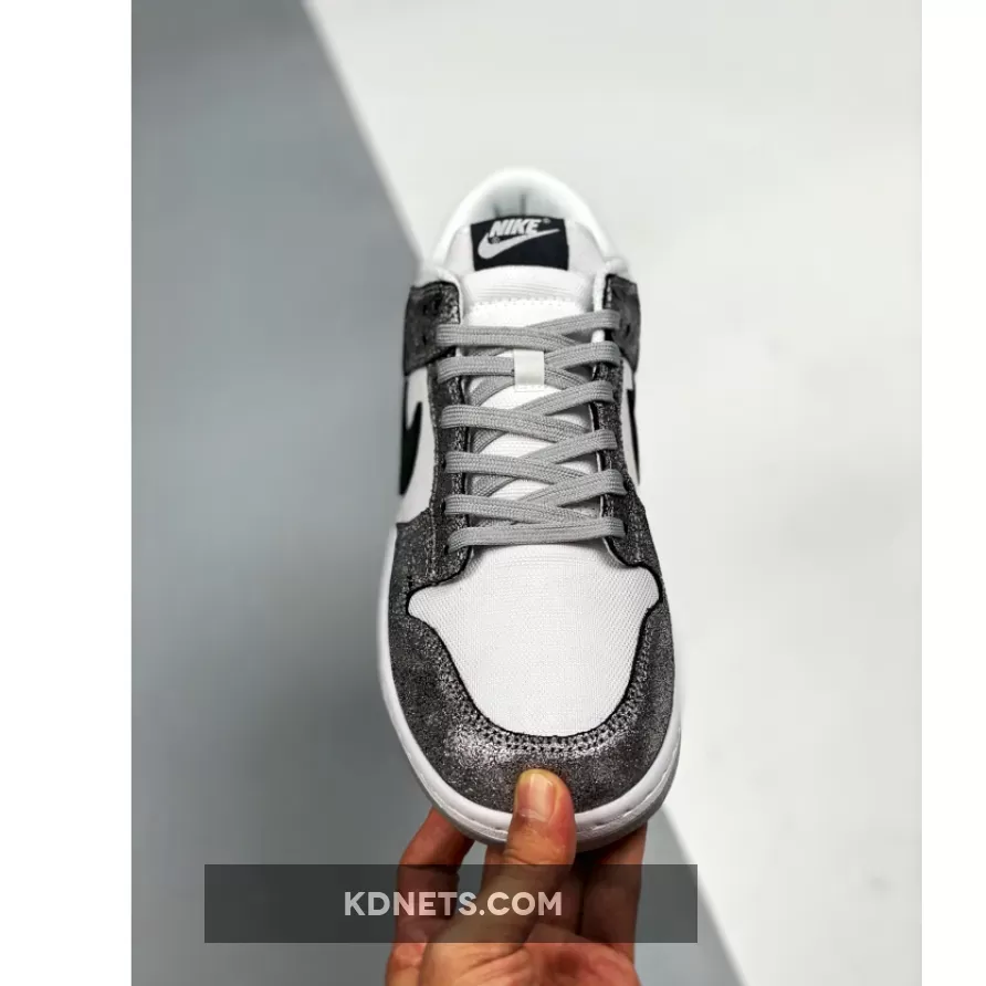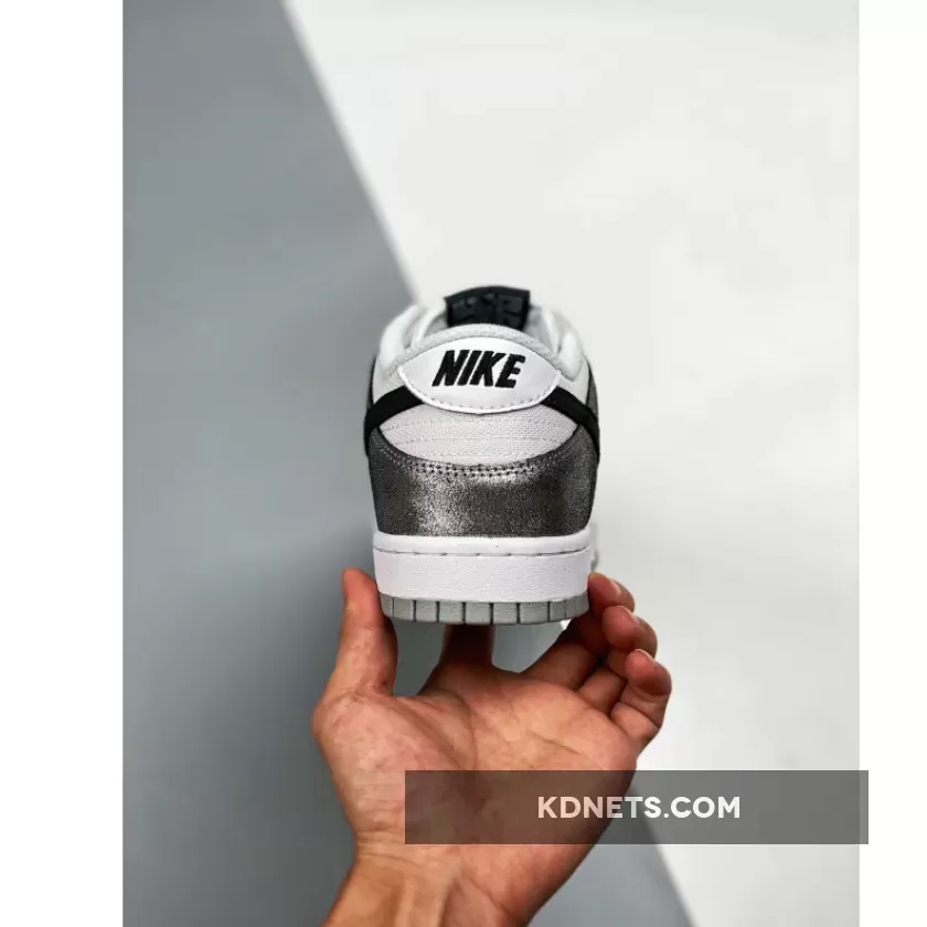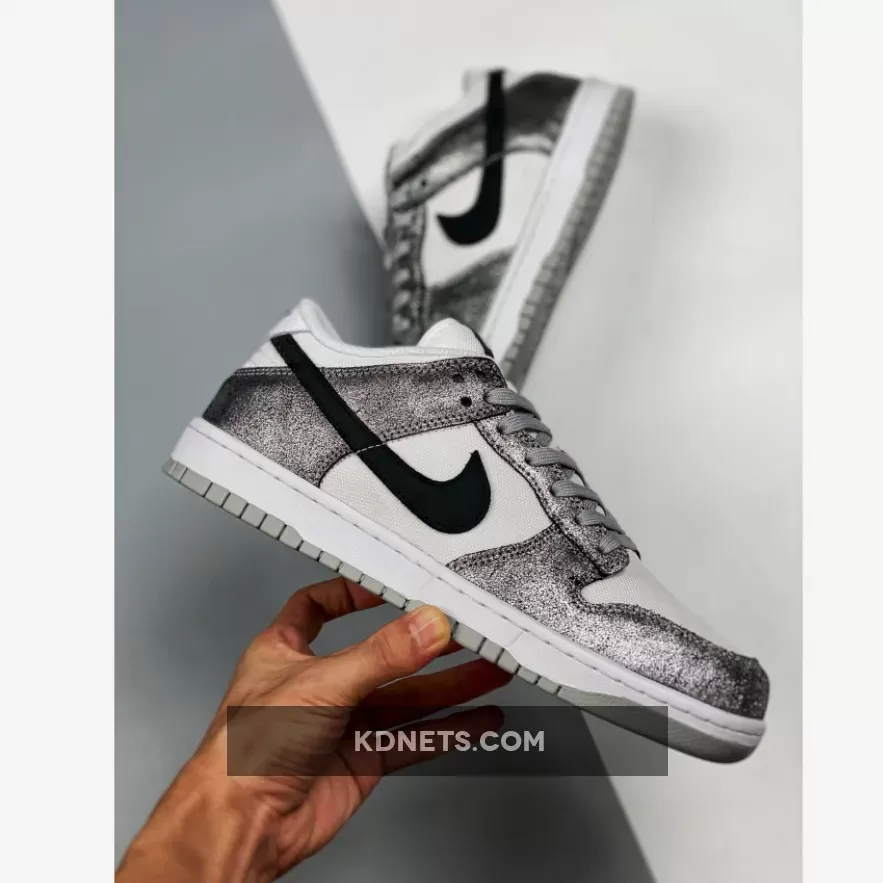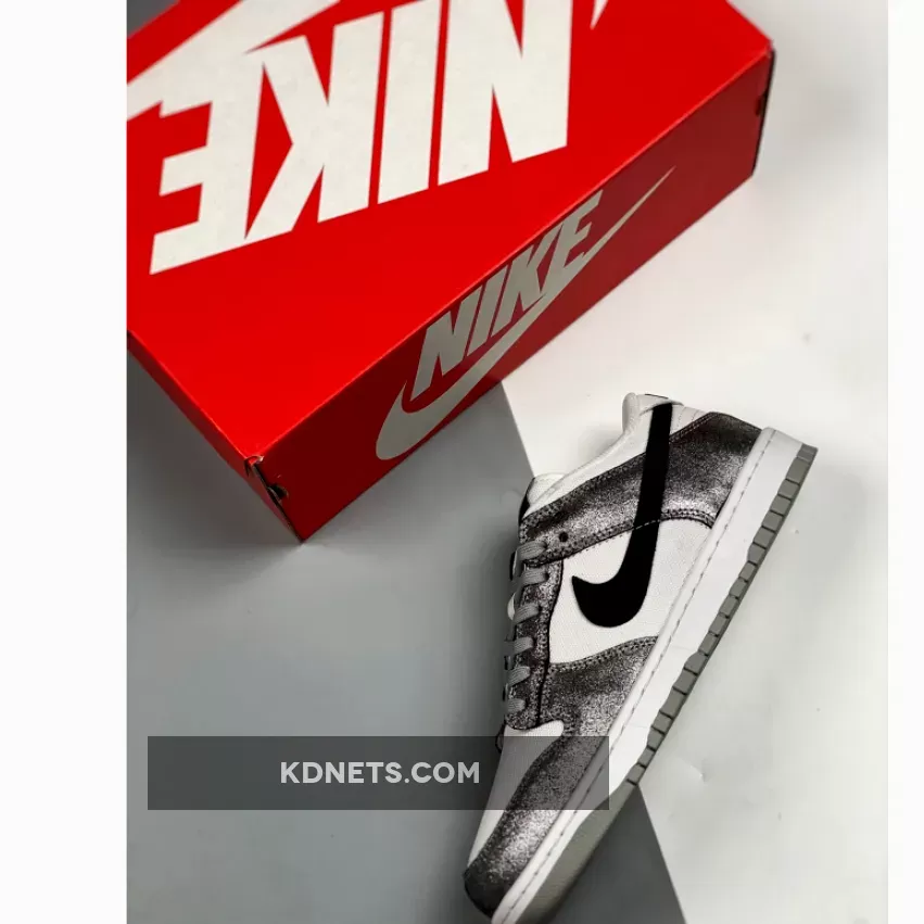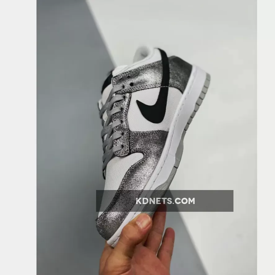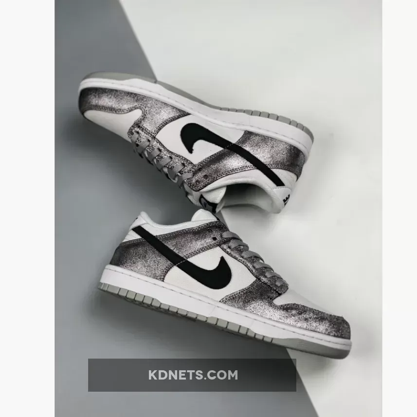 Go ahead and take the spotlight with the Nike Dunk Low Shimmer. These dynamic shoes start with an understated white canvas-like mesh base. Contrasting it are textured silver leather overlays covering the toe, mudguard, eye stays, heel and ankle areas. Hints of black in the Nike Swoosh, heel tab and tongue brandings round off the dazzling monochromatic palette. Slip these on and get ready to sparkle in style.
