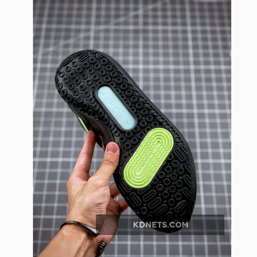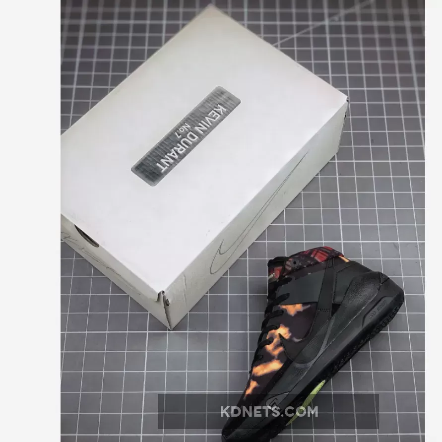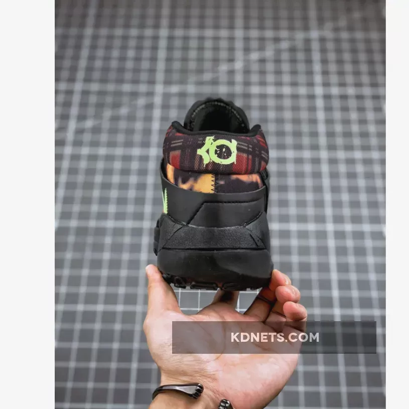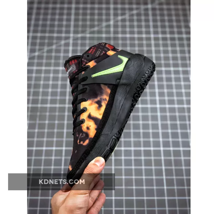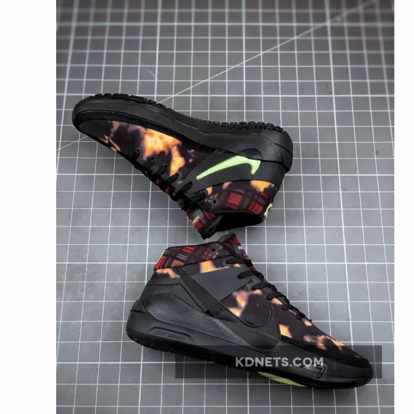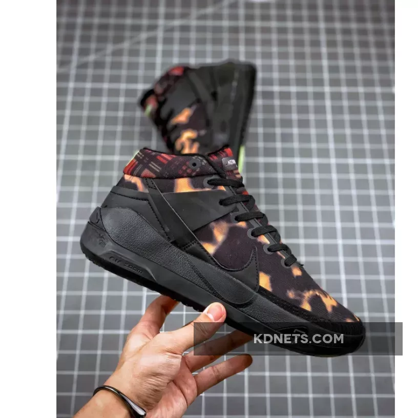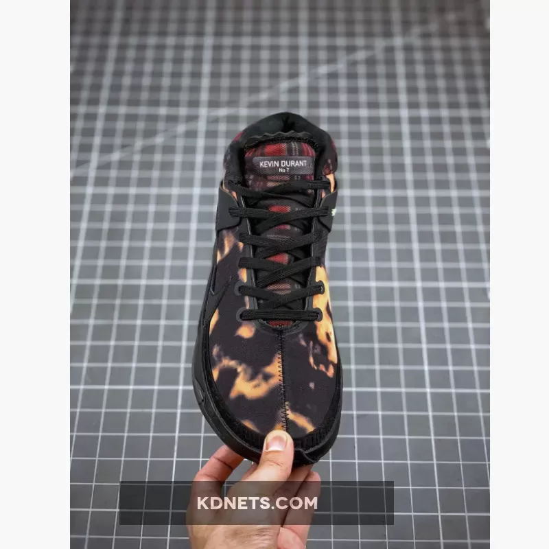 This offering of the Nike KD 13 features a Black-based upper that’s fully covered in a bleached pattern with plaid material covering the tongue and collar.