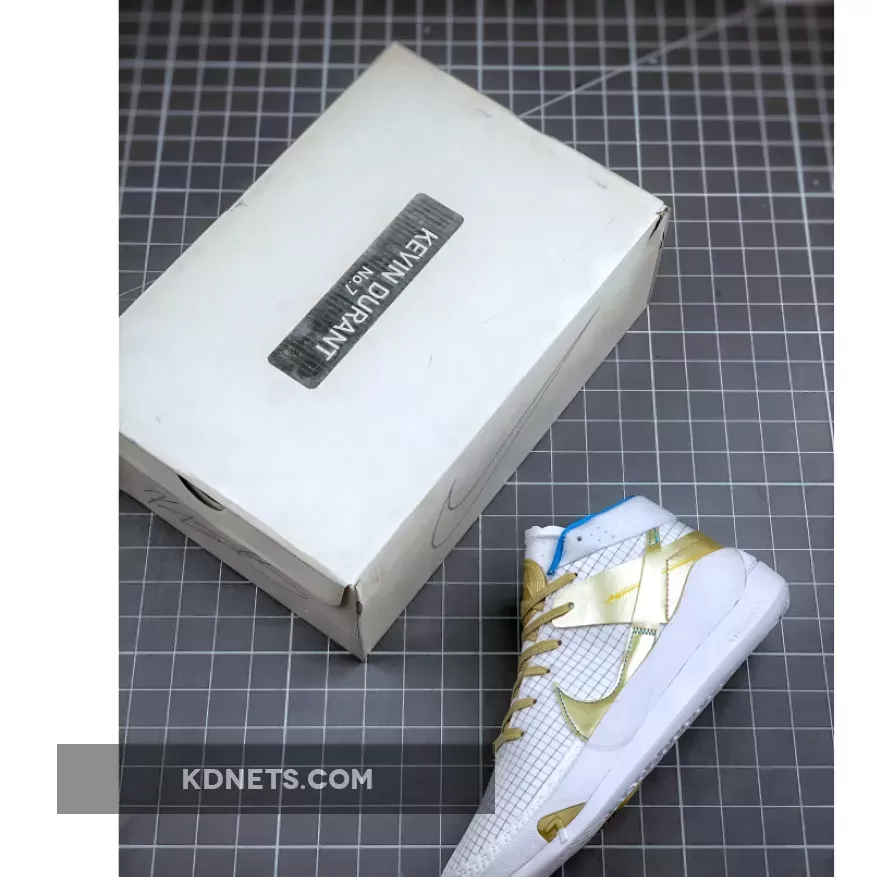 “Love the EYBL KD13s! Unique grid pattern and metallic gold accents pop against crisp white backdrop. Comfortable fit and responsive cushioning aces!”