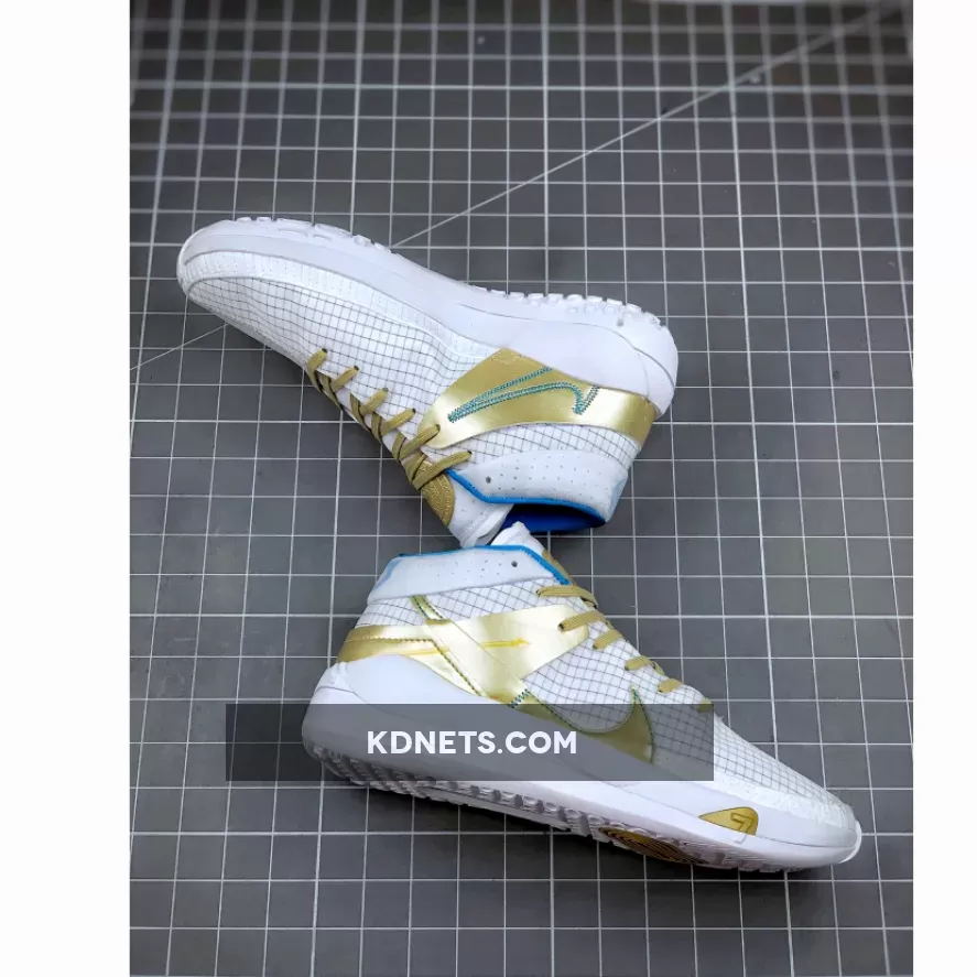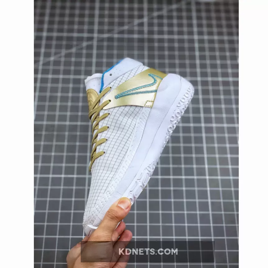 Aptly dubbed Nike KD 13 “EYBL,” this offering features a white upper detailed with a gold grid pattern. The metallic golden hue follows onto the Swoosh insignias, mid panels, and laces. Elsewhere, contrasting icy blue dresses the sock liner, co-branding on the heels and tongues. This all sits atop a fresh white midsole.