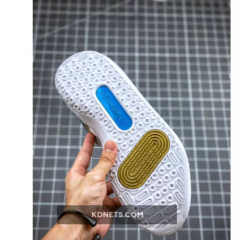 “I’m thoroughly impressed with my new Nike KD 13 ‘EYBL’! The sleek white and metallic gold design is sick, and the comfort is top-notch. Zoom Air unit provides great cushioning and responsiveness during gameplay. Love the unique grid pattern and icy blue accents – a must-have for any baller!”
