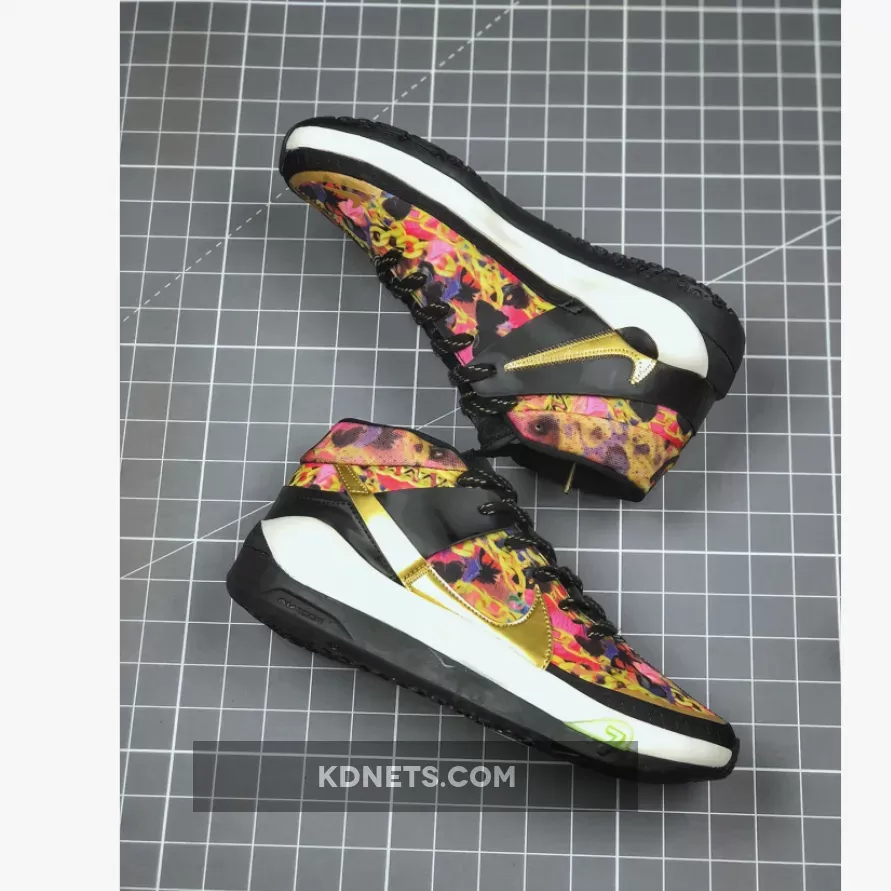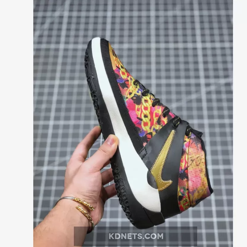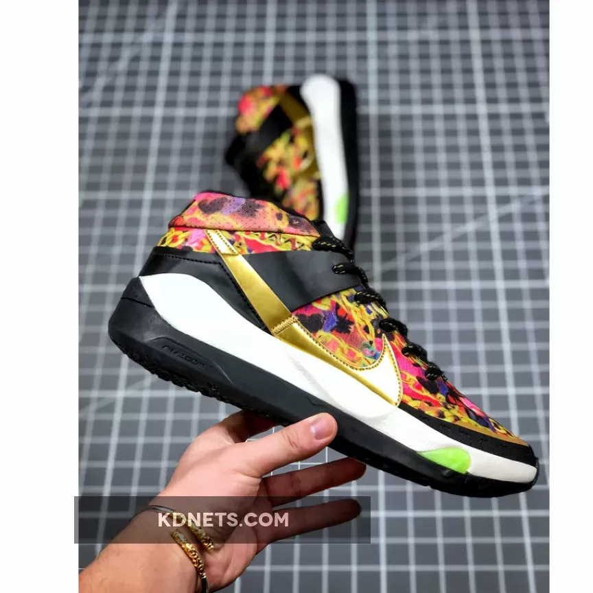 This offering of the Nike KD 13 is inspired by the pump-up playlist that activates Kevin Durant’s clutch mindset. The shoe gives a nod to hip-hop culture and fashion with gold chain and flower graphics on the upper.