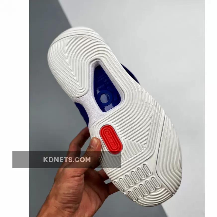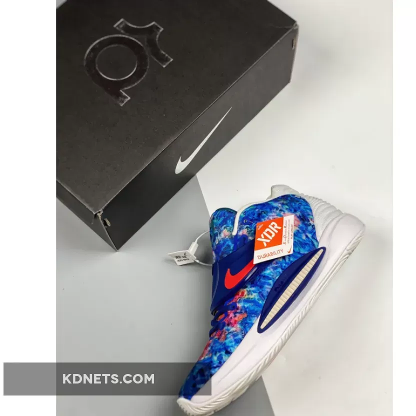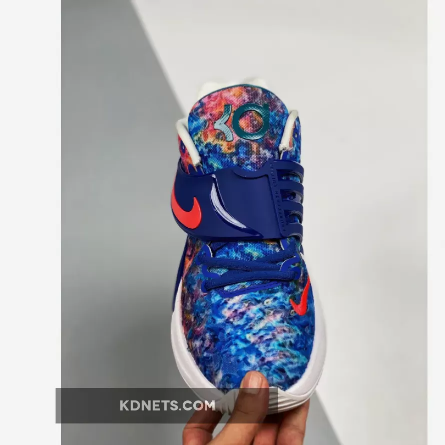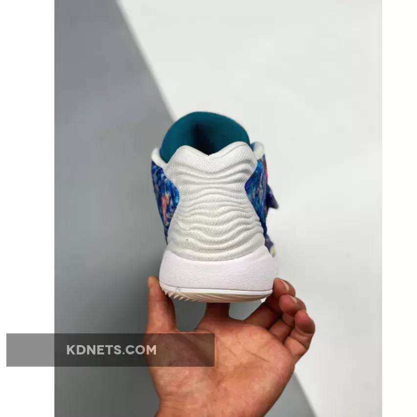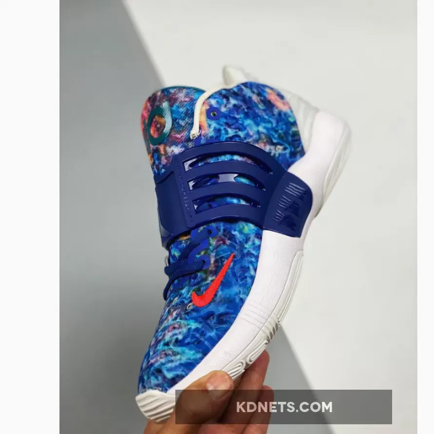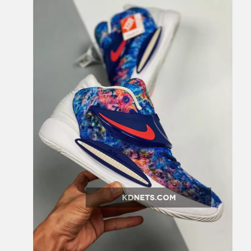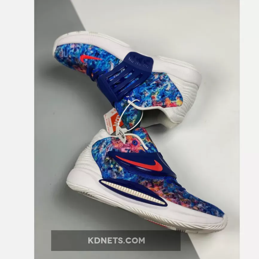 Dressed in a Deep Royal Blue, Pale Coral, and Coconut Milk color scheme. This Nike KD 14 is highlighted with a psychedelic graphic print covering majority of its upper and tongue. Other details includes a Royal Blue cross strap at the midfoot with a Crimson Swoosh to match the embroidered Swoosh on the medial forefoot.