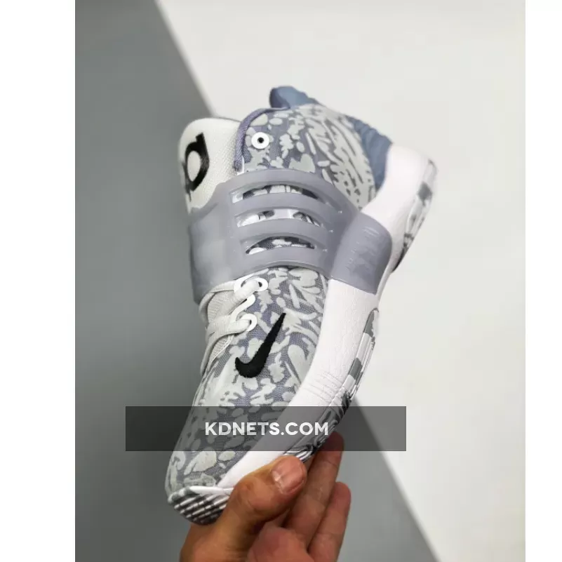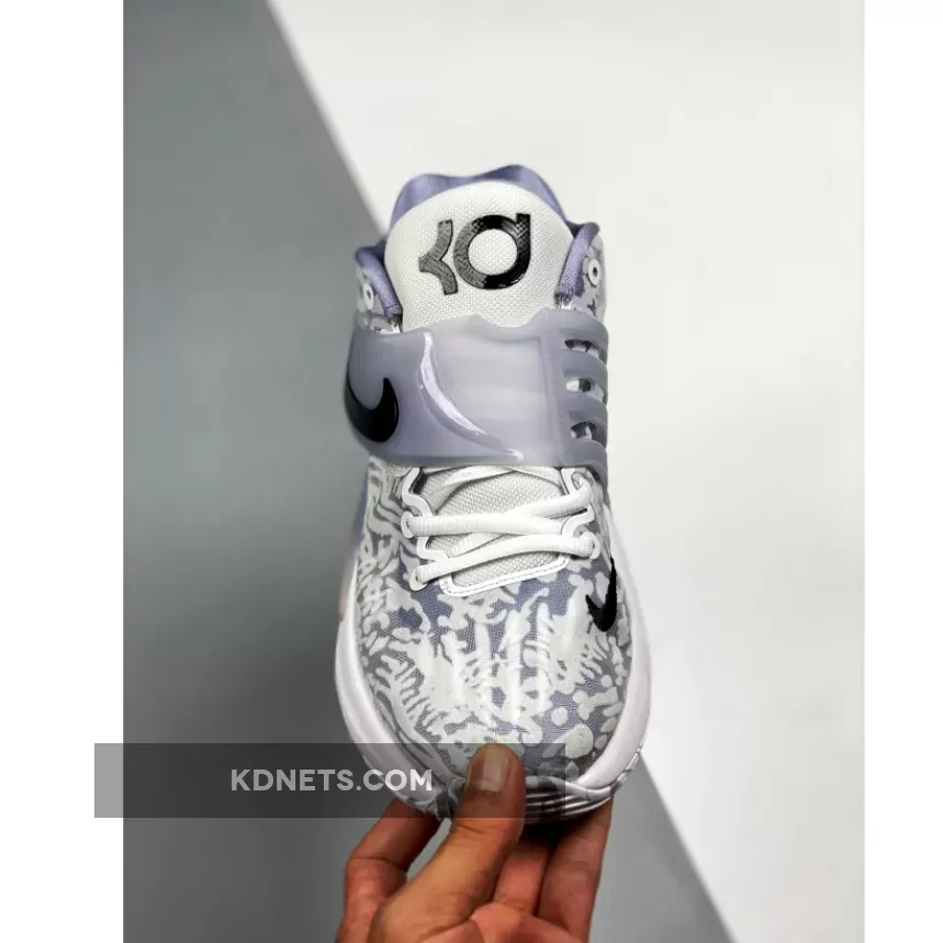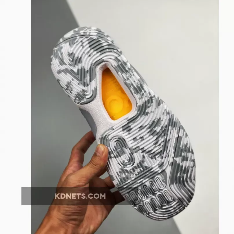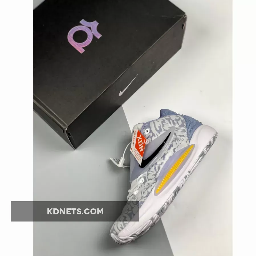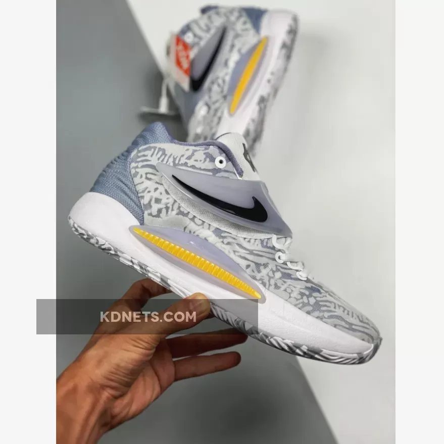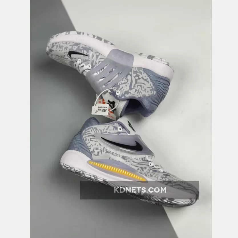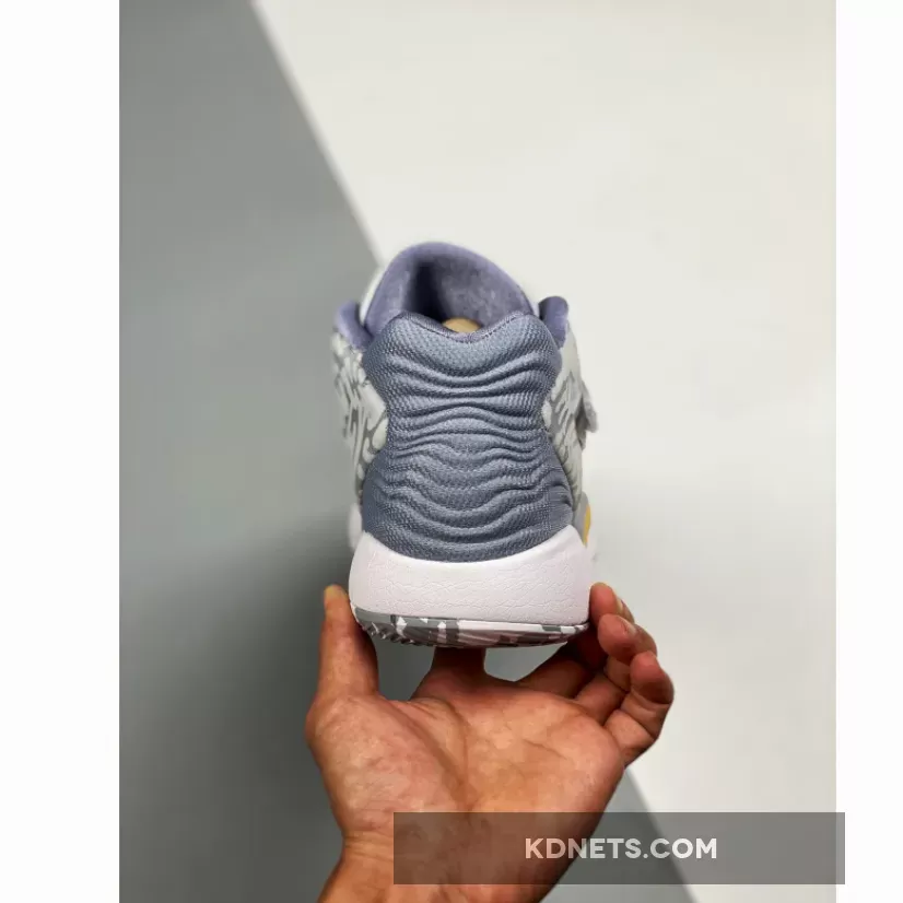 The Nike KD 14 Wolf Gray adopts a mid-top silhouette offered in a white, Wolf Gray, Melon Tint, and black colorway.
