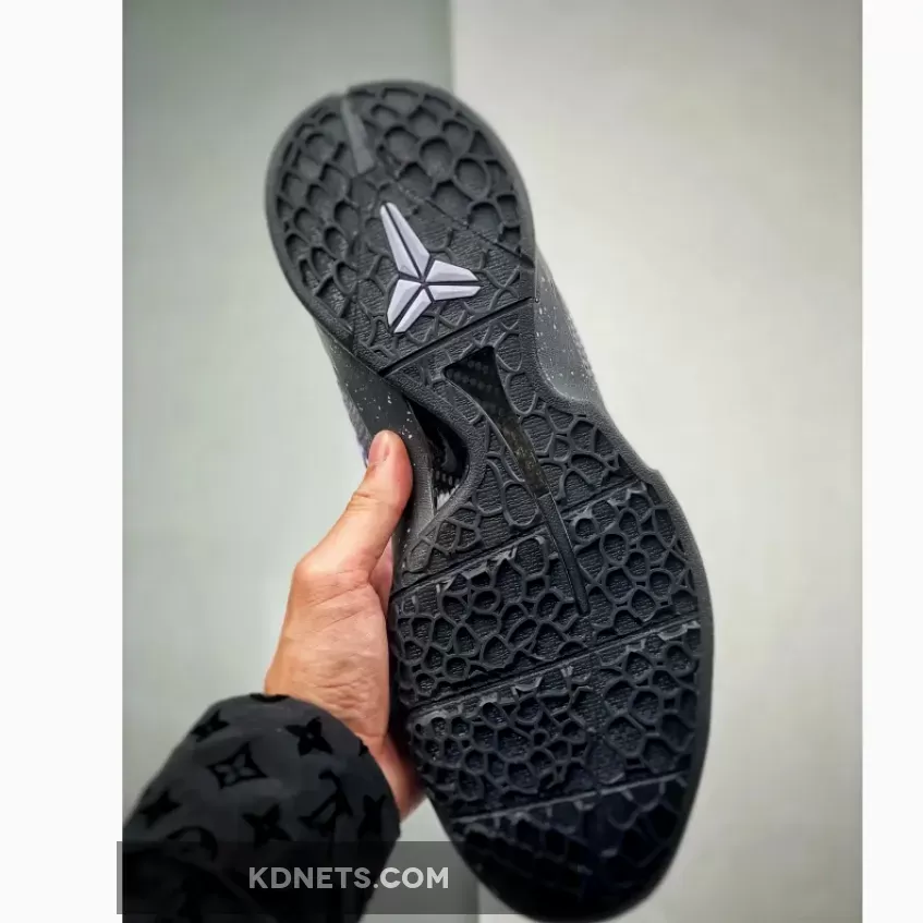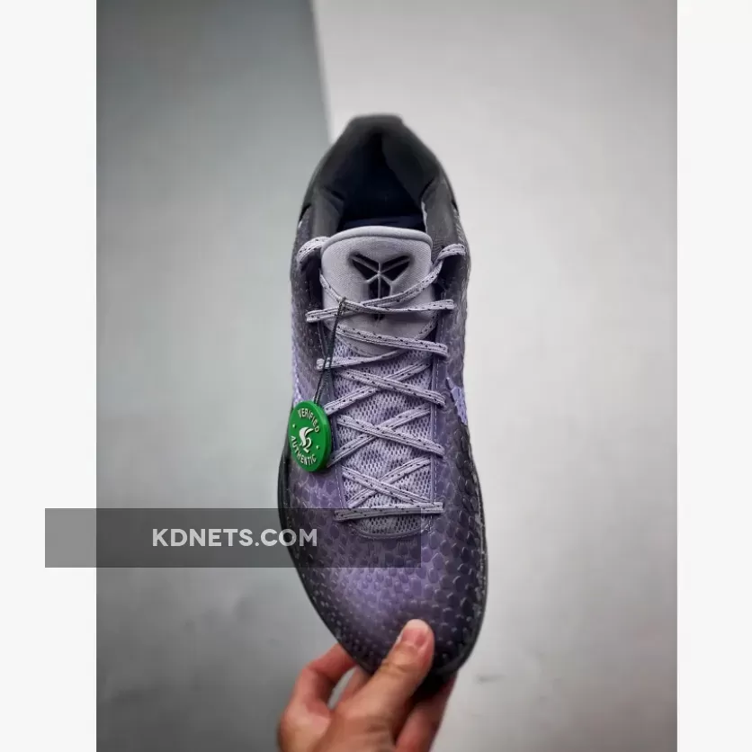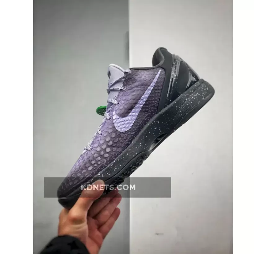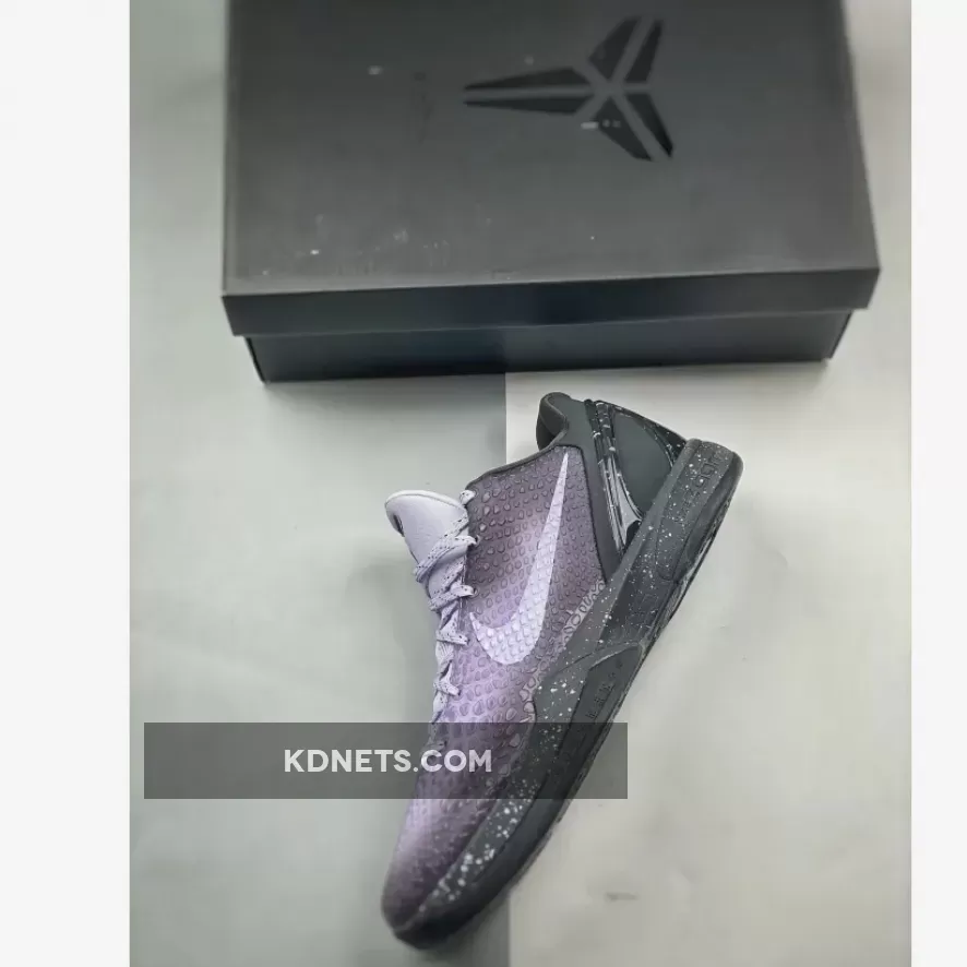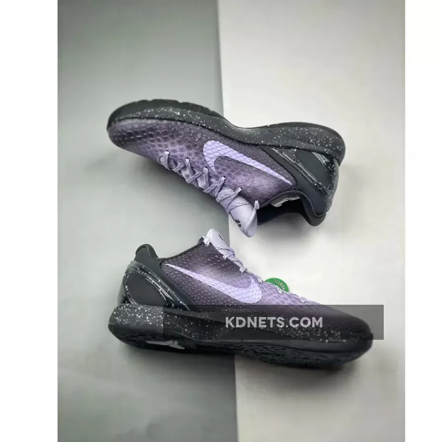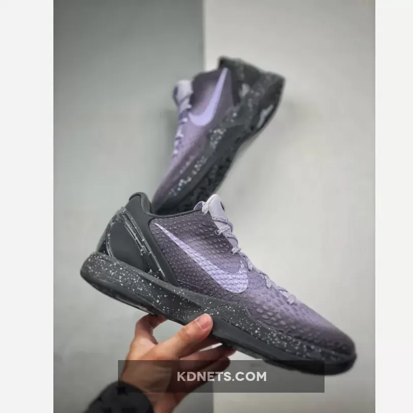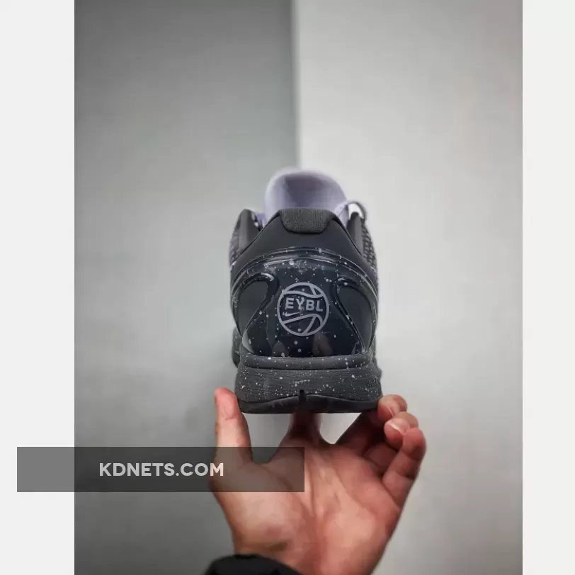 the colorway picks up where the series left off, opting this time for shades of deep purple and black. The latter dyes the entirety of the heel clip and midsole, speckled with splatters of grey all throughout. Above, the Swoosh opts for a white neutral, its scales lightly tinted with the purple that air brushes behind in varying levels of intensity. Kobe’s logo, then, outfits the tongue, placed opposite to the EYBL insignia that dresses the heel in what looks to be reflective paint.