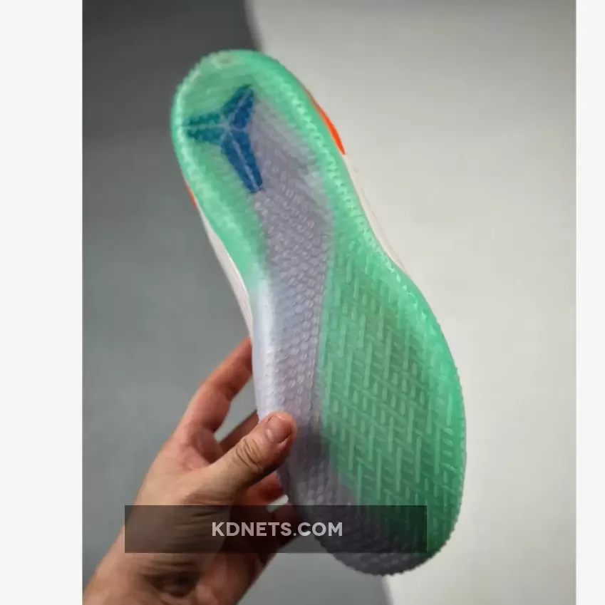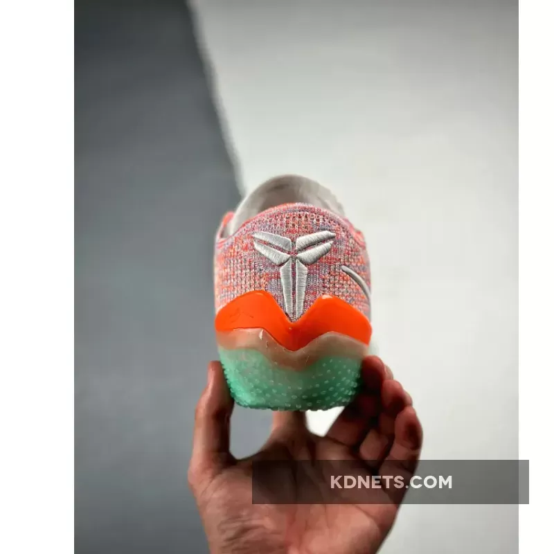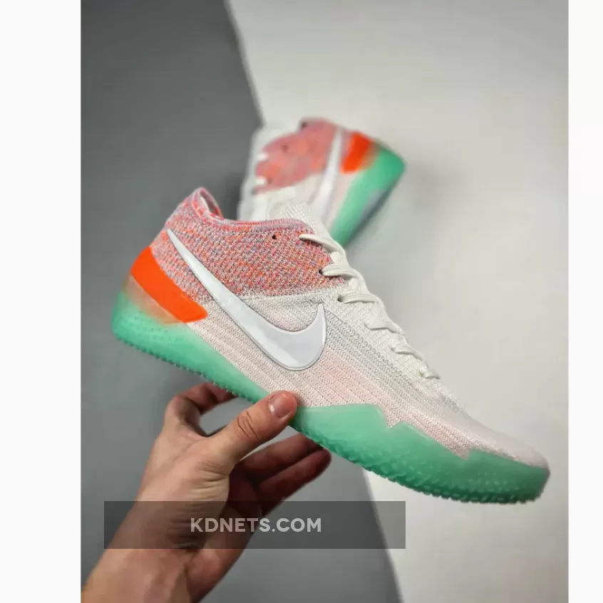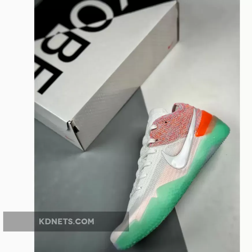 Somewhat reminiscent of the “4KB” Kobe 11 Elite, the low-cut performance model features predominantly white Flyknit construction, with a healthy amount of multicolor detailing extended from collar to heel. Orange finds real estate on the along the heel counter, while a minty green translucent outsole caps off the look.