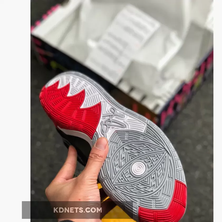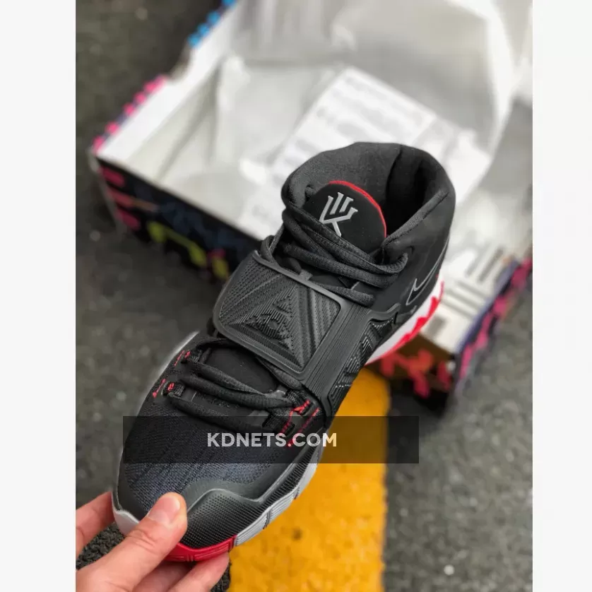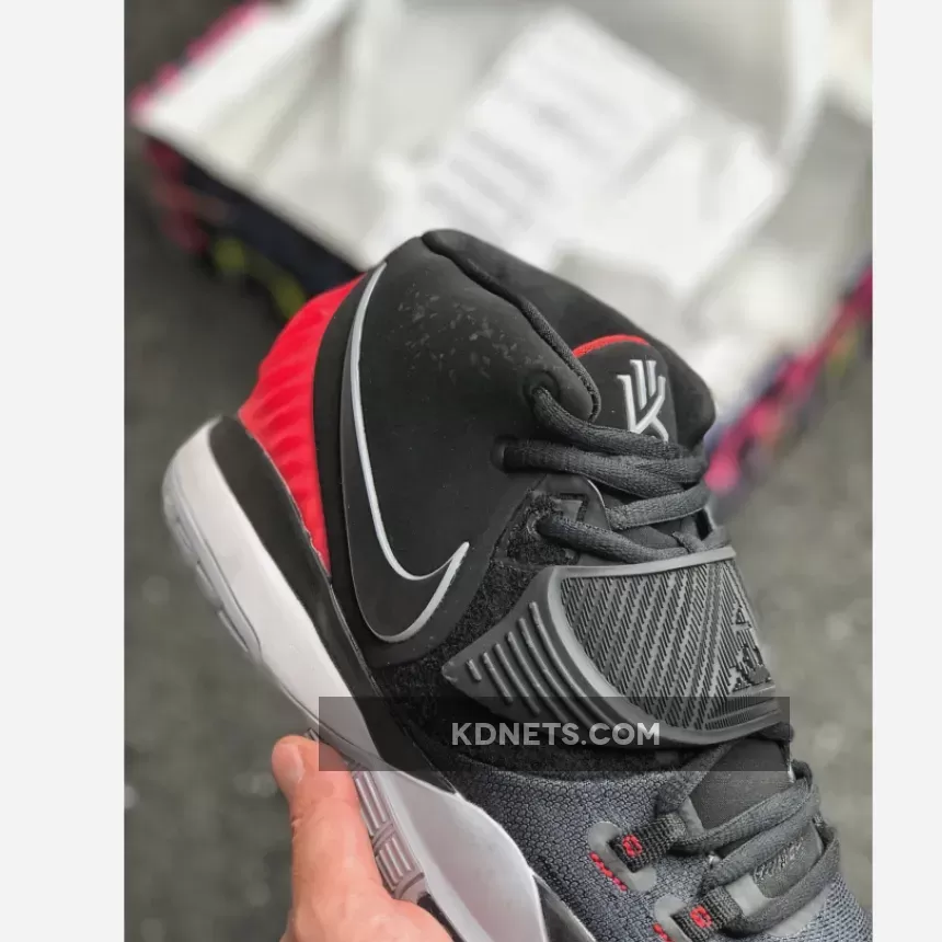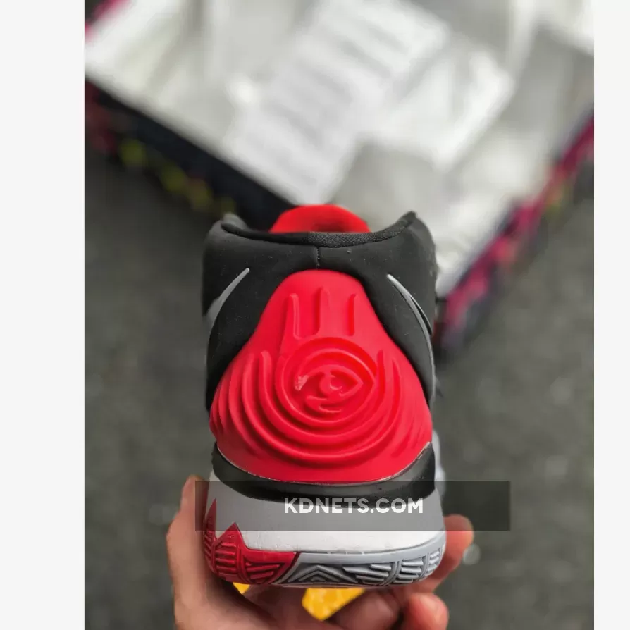 This Nike Kyrie 6 comes with Black mesh on the upper while nubuck covers the heels. Red then lands heel and small stitching on the eyelet.