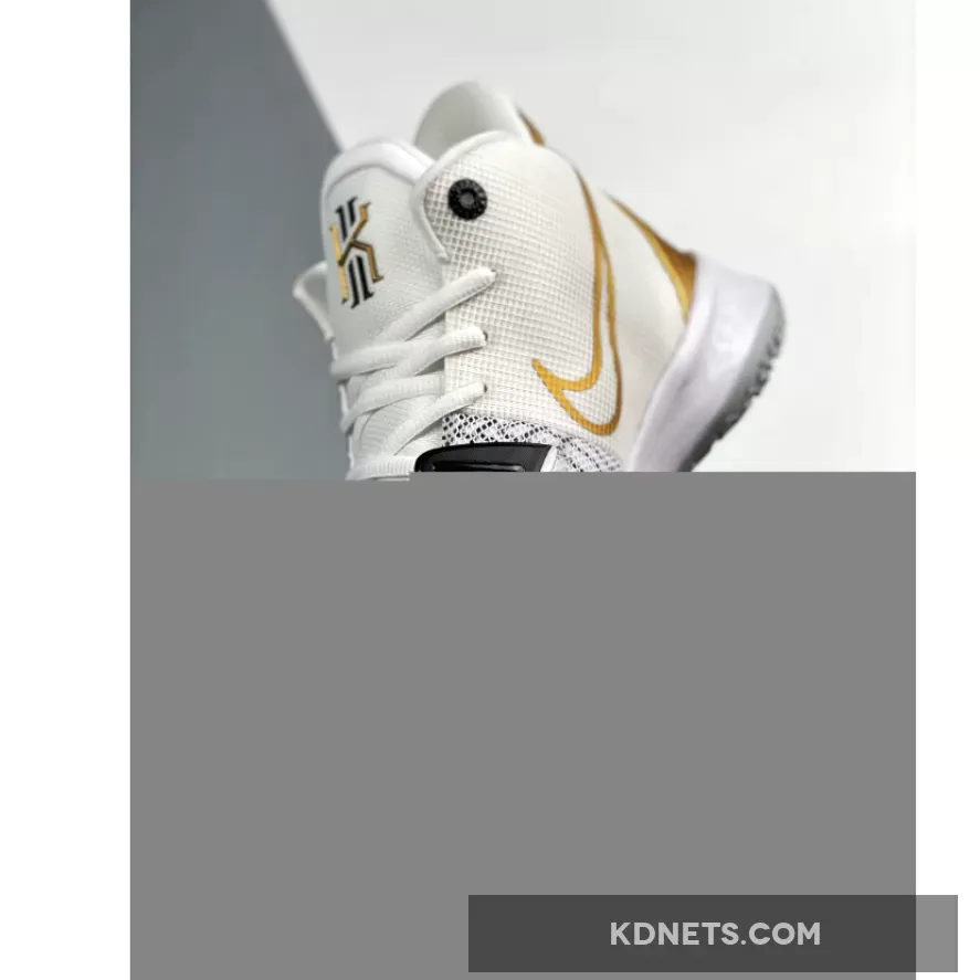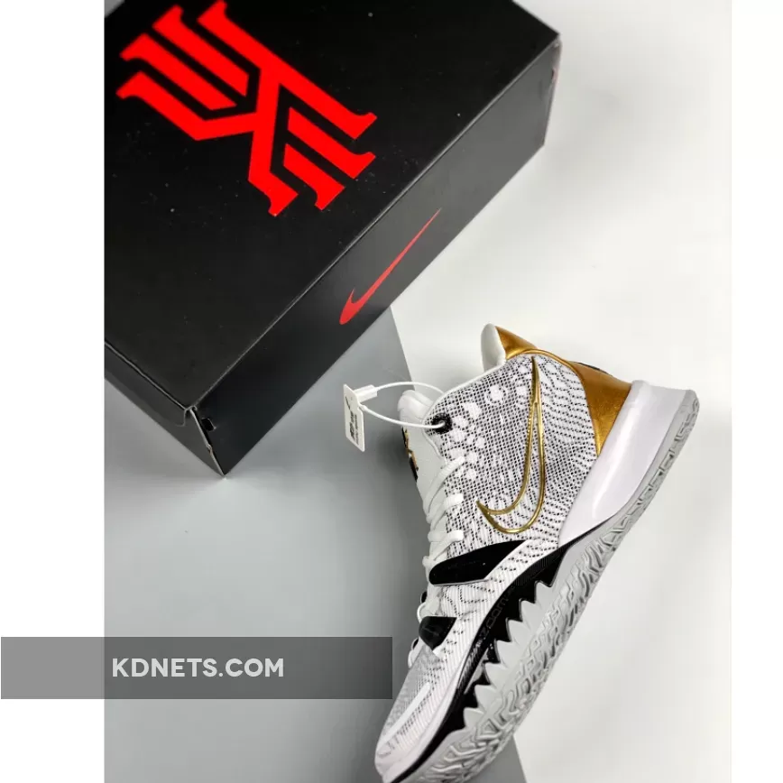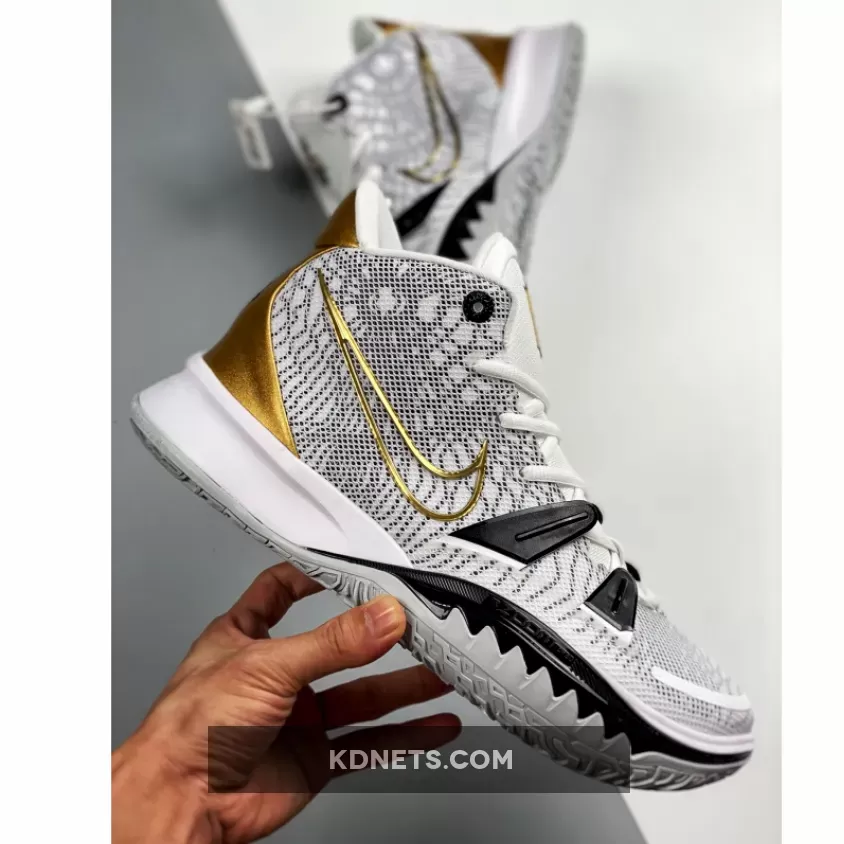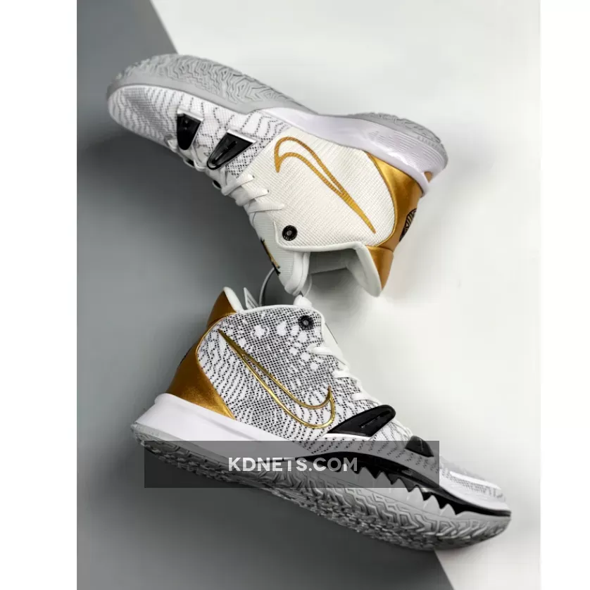 Dressed in an elegant White, Black, and Metallic Gold color scheme. This Nike Kyrie 7 features a White textile upper paired with Black detailing throughout and Metallic Gold covering the Swooshes, tongues, heels, and insole branding. Highlighting the shoe is an NBA ring on the heels to complete the design.