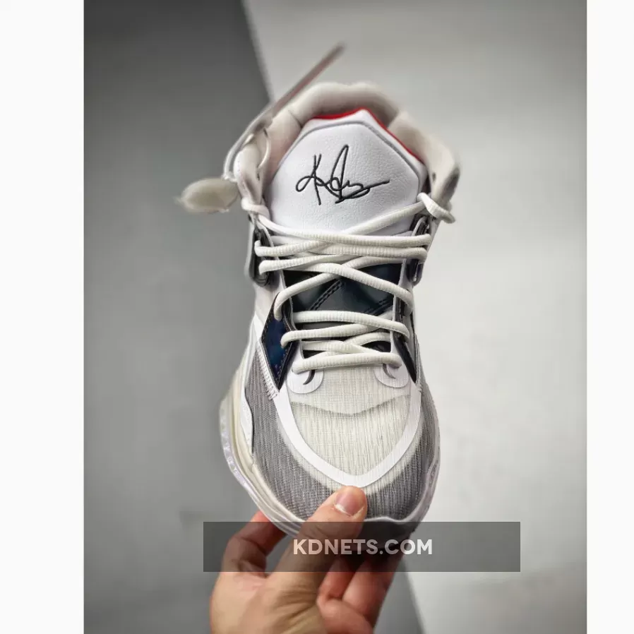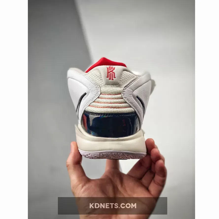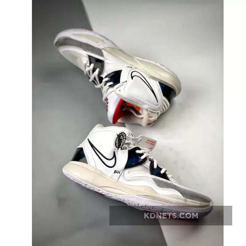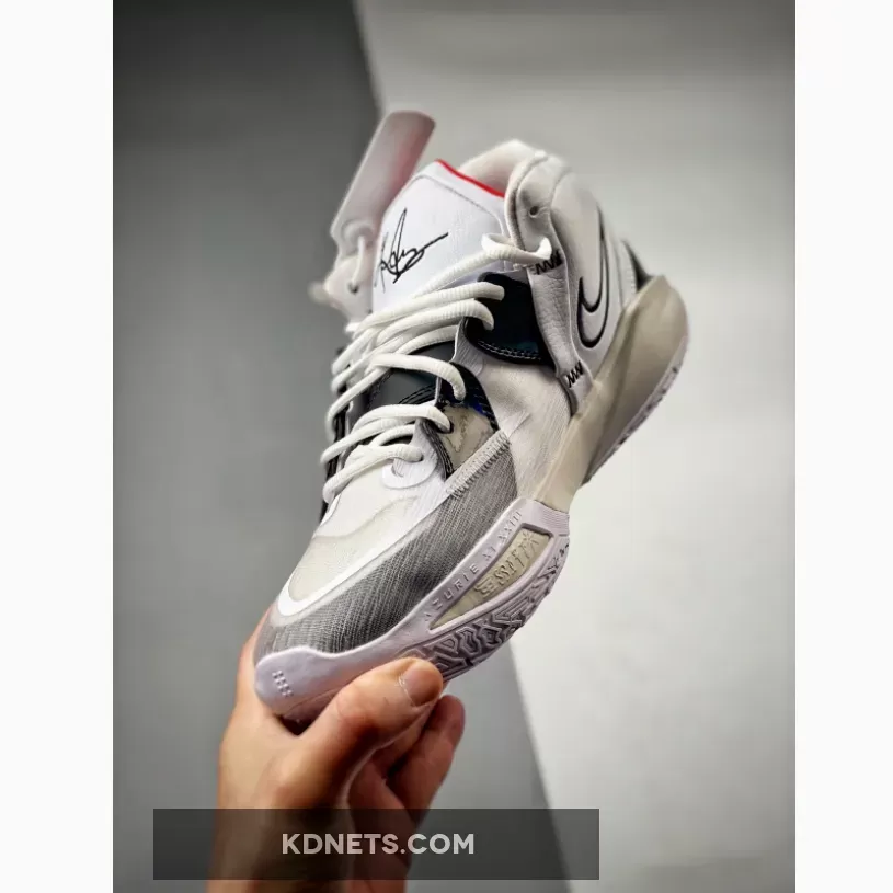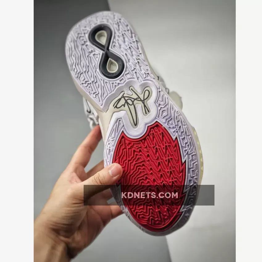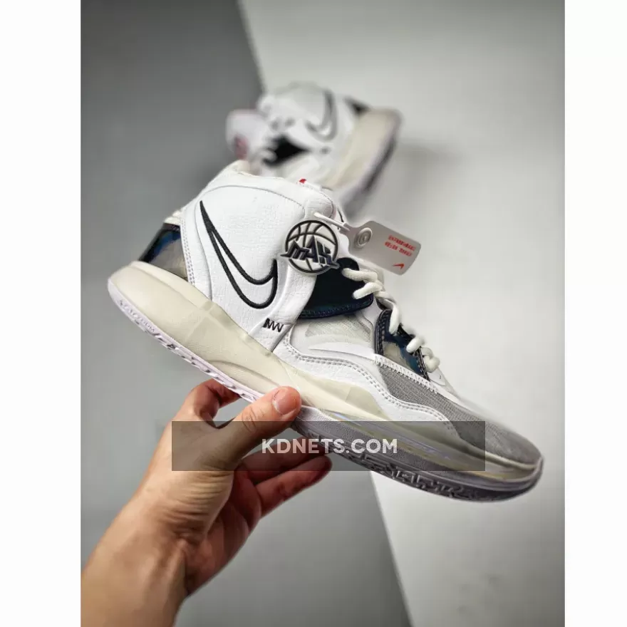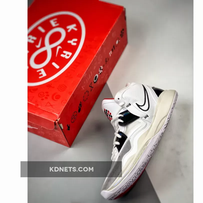 The Nike Kyrie 8 in the Man Machine colorway is done in a predominantly White upper constructed in a mix of mesh and leather. Contrast comes by way of the glossy Black overlays on the lace unit and heel and the Red accents on areas such as the branding, tongue lining and parts of the outsole. Other design details include Kyrie’s signature on the right tongue and Red and Black dots on the left tongue.