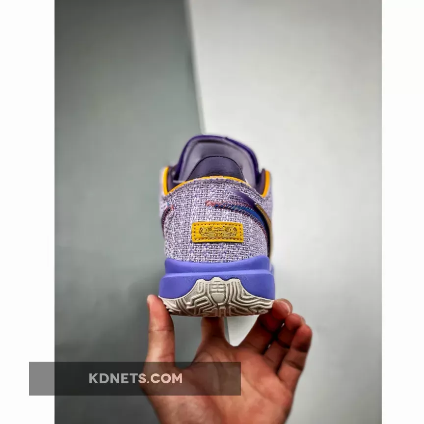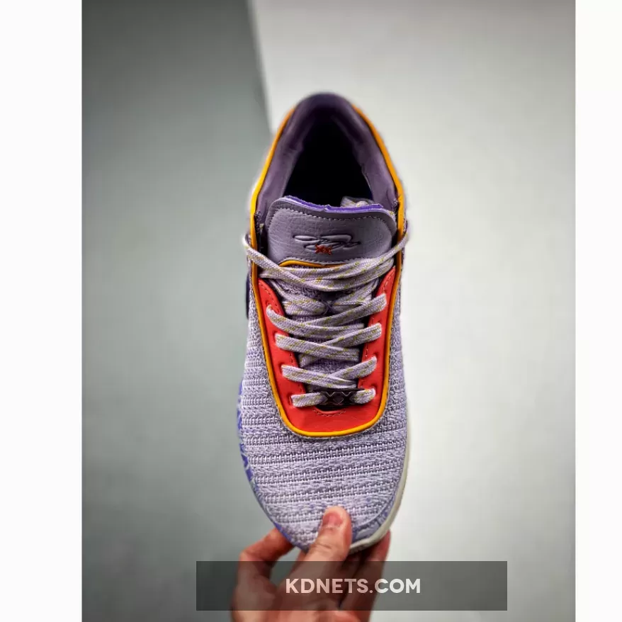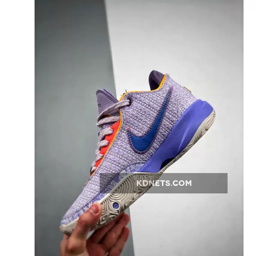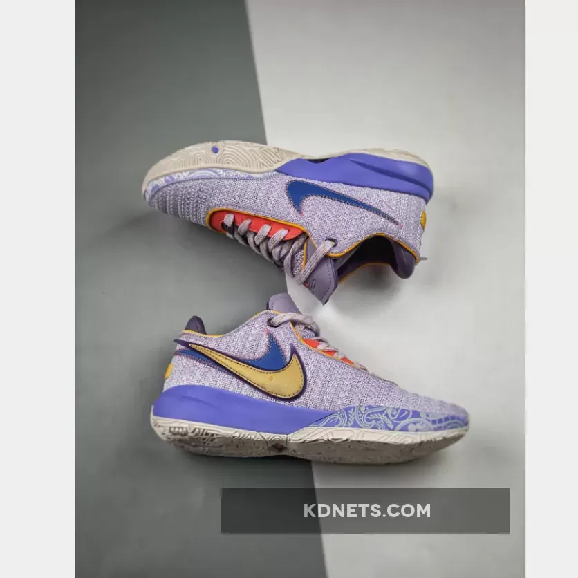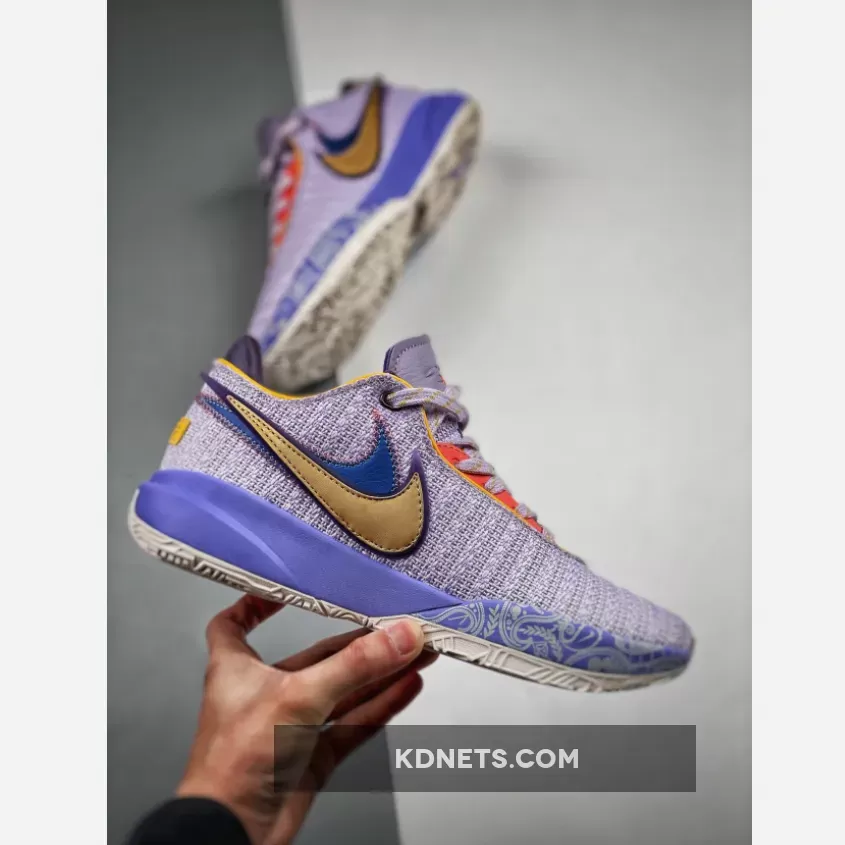 Dressed in a Vivid Purple, Metallic Gold, Black, Cave Purple, Lilac, and Solar Flare color scheme. This offering of the Nike LeBron 20 features a knitted upper with double-stacked Swooshes on the lateral and special “XX” lace dubraes and insole branding. A graphic print decorates the forefoot area of the midsole atop a multidirectional rubber outsole completes the design.