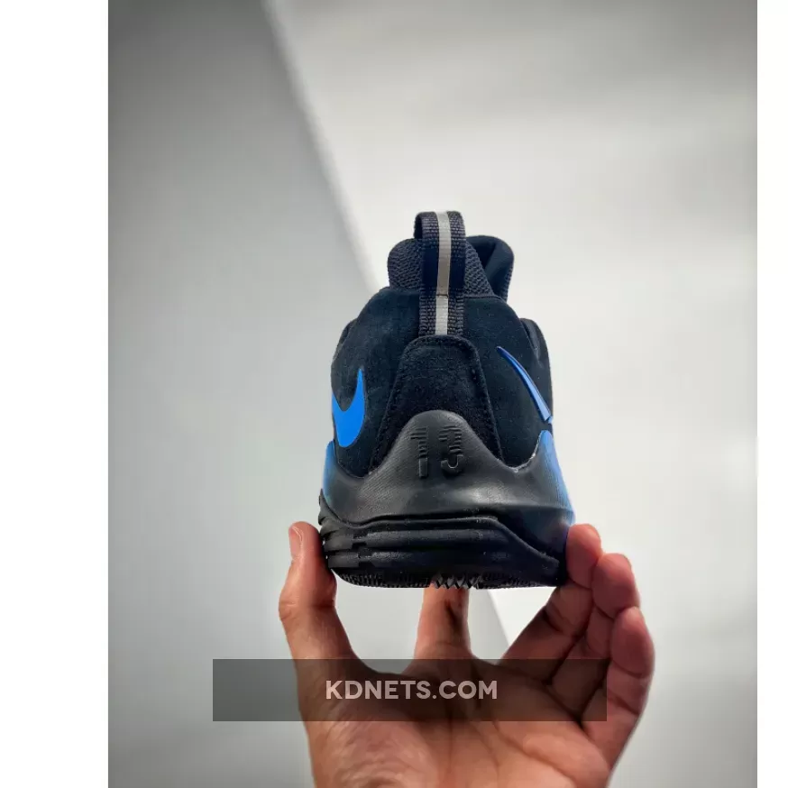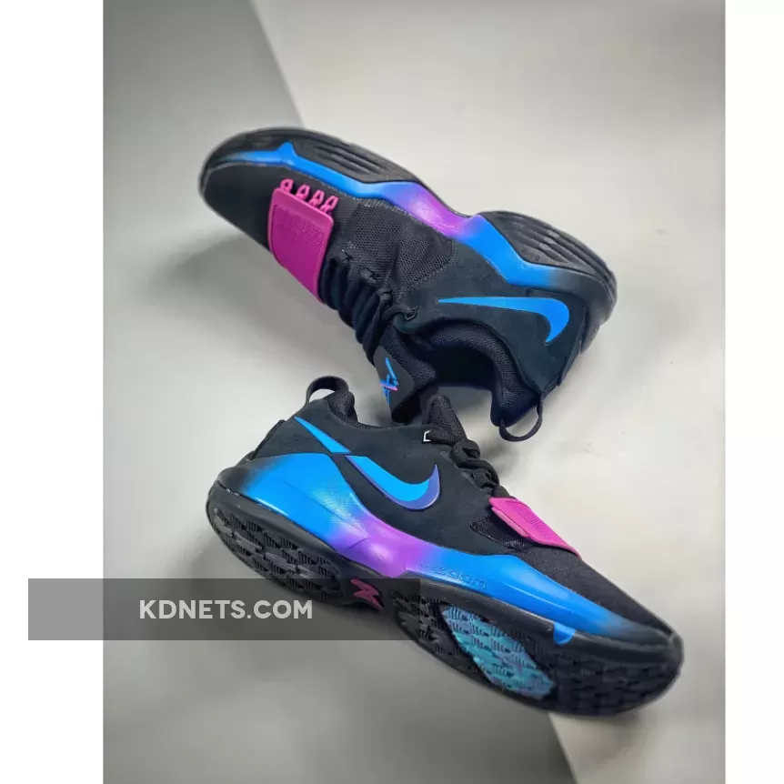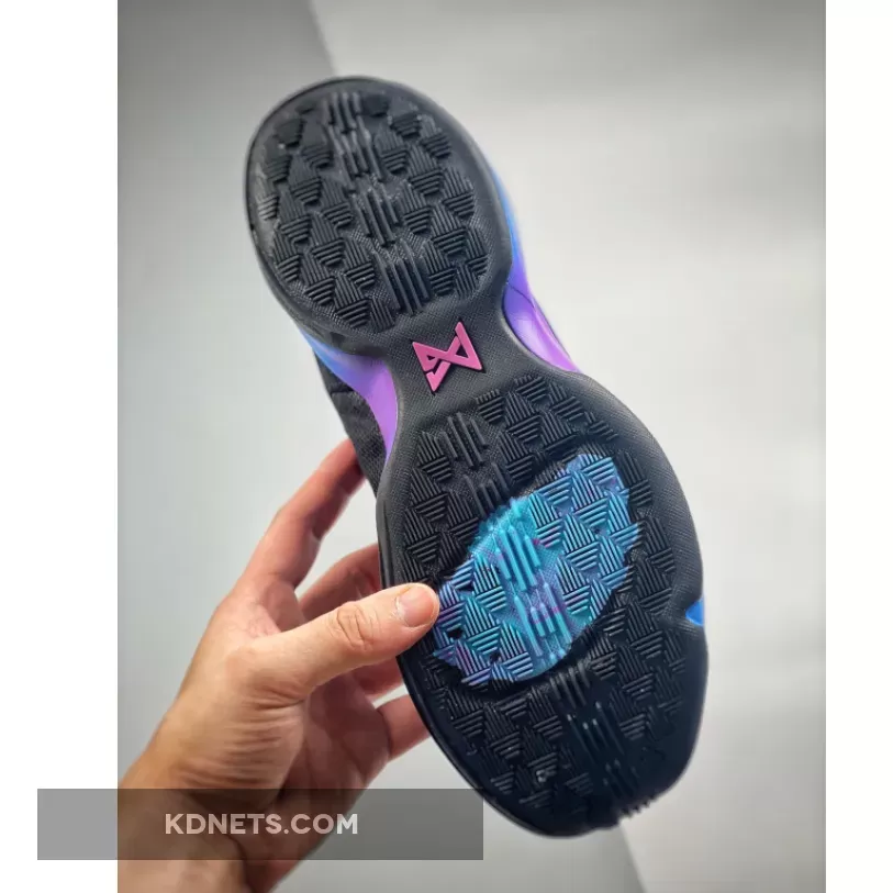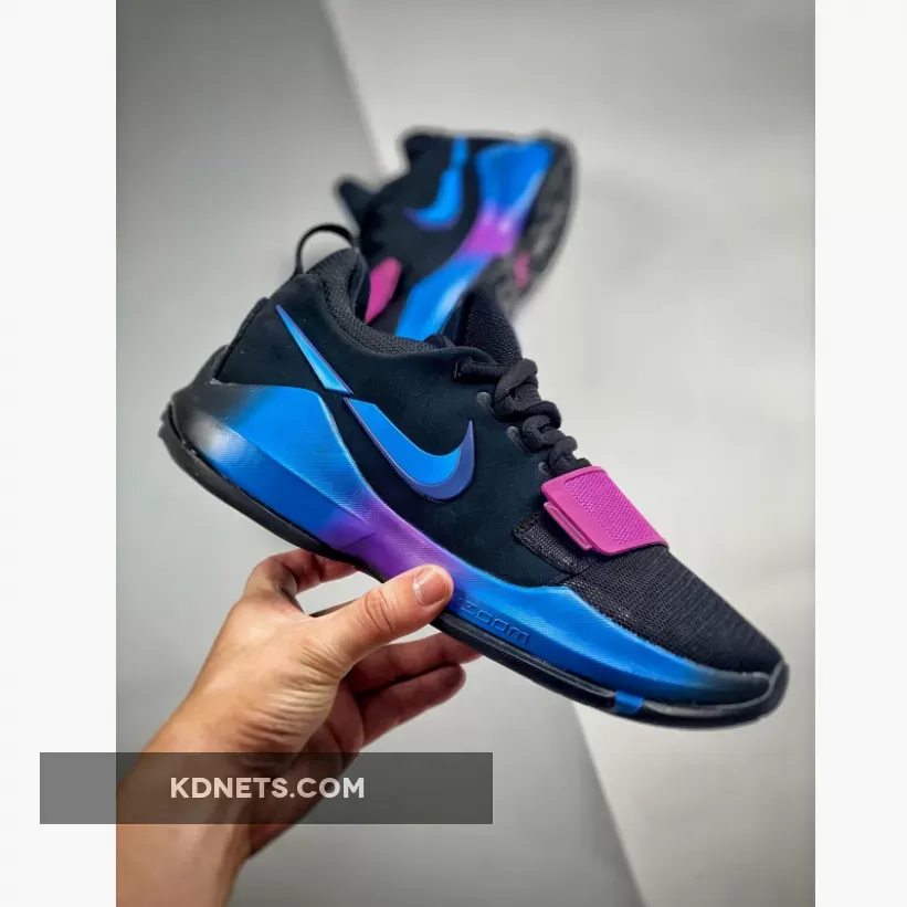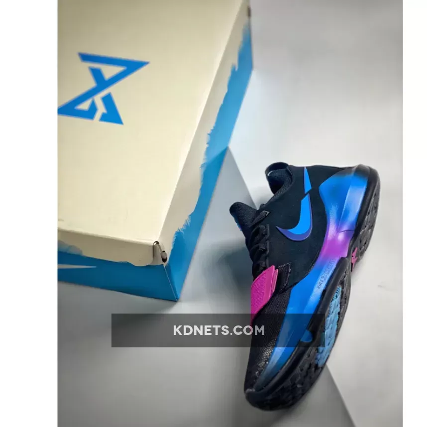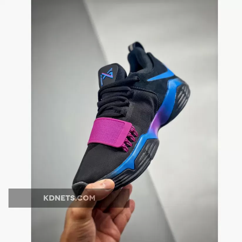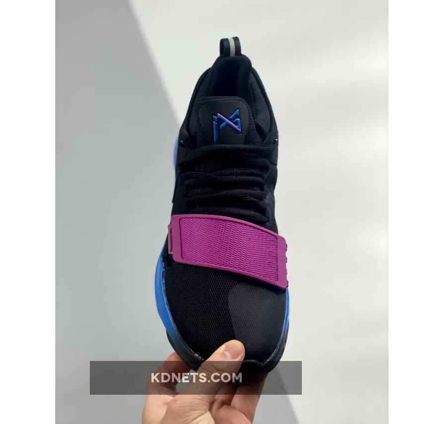 This PG 1 features a predominantly Black upper with shades of blue and purple on the gradient midsole, midfoot strap, tongue logo, and the broken Swoosh logo.