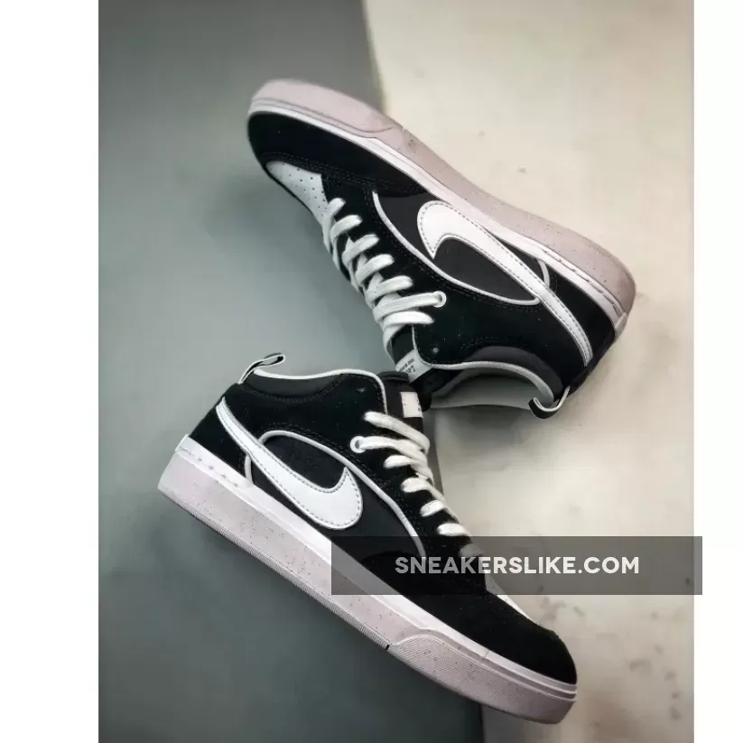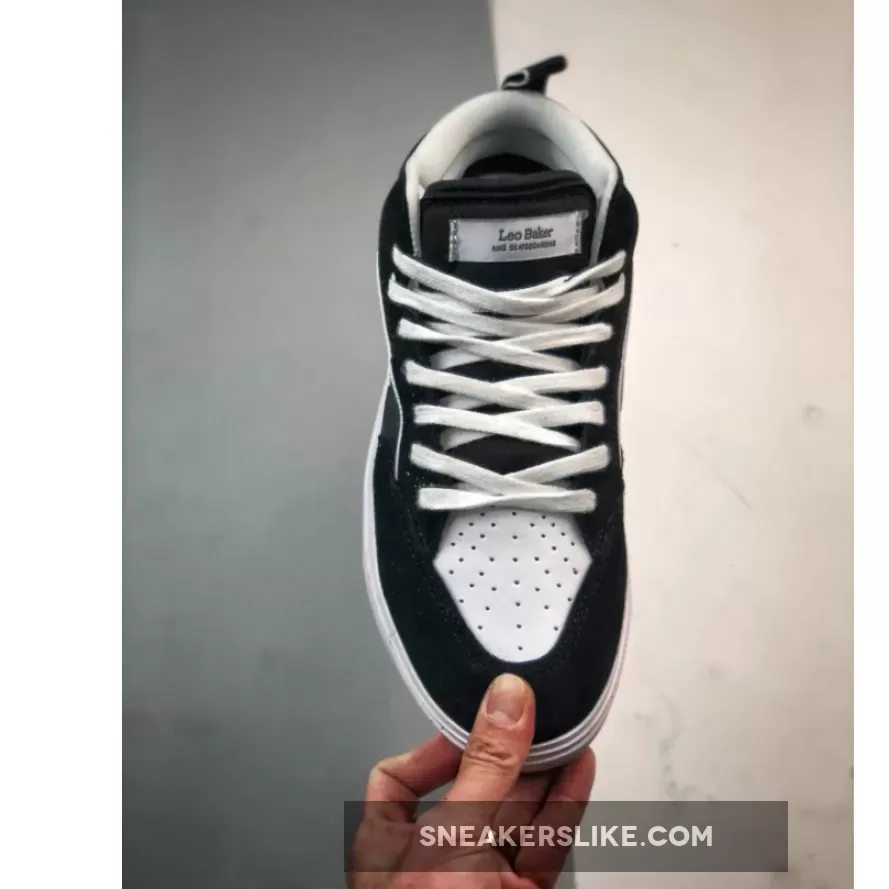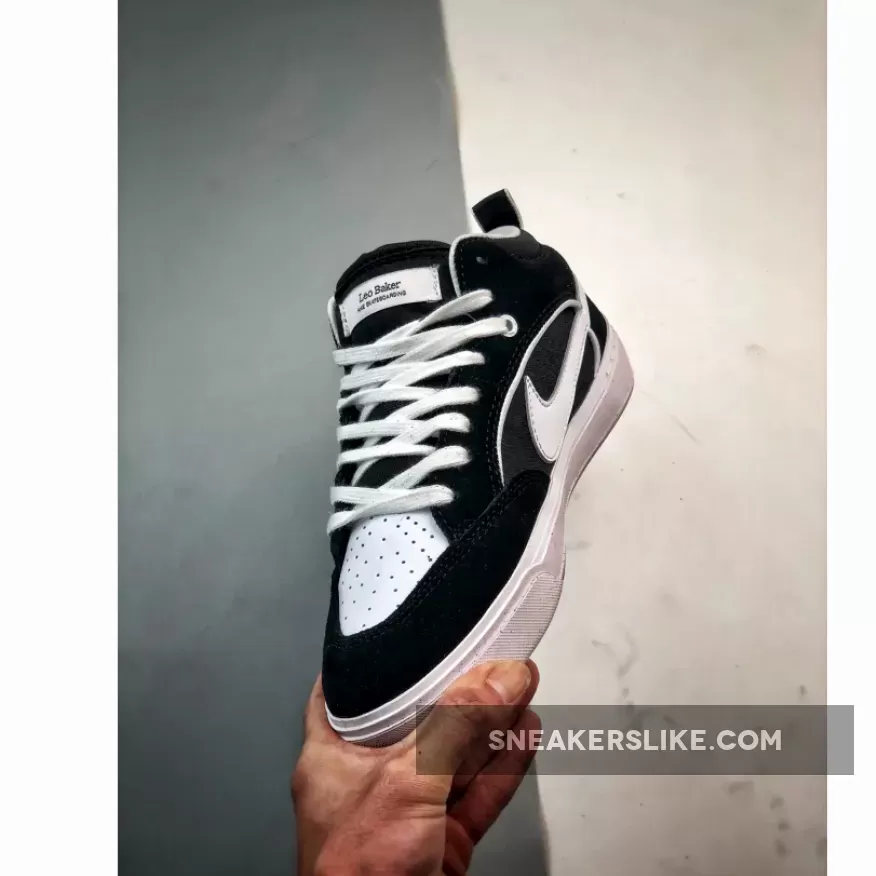 Drawing inspiration from one of their favorite skateboarding shoes, the Nike SB Bruin High, Baker ceates a mid-top sneaker made with leather, suede, and flexible mesh. This iteration has a “Black” suede upper with a perforated toebox in “White” leather. The lateral quarters have a sleek “Leo” monogram underlay that complements the “Leo Baker” branding on the tongue tag and insole. The sneaker is complete with a “White” midsole and gum rubber outsole.