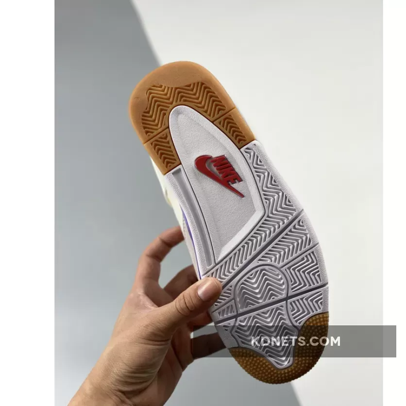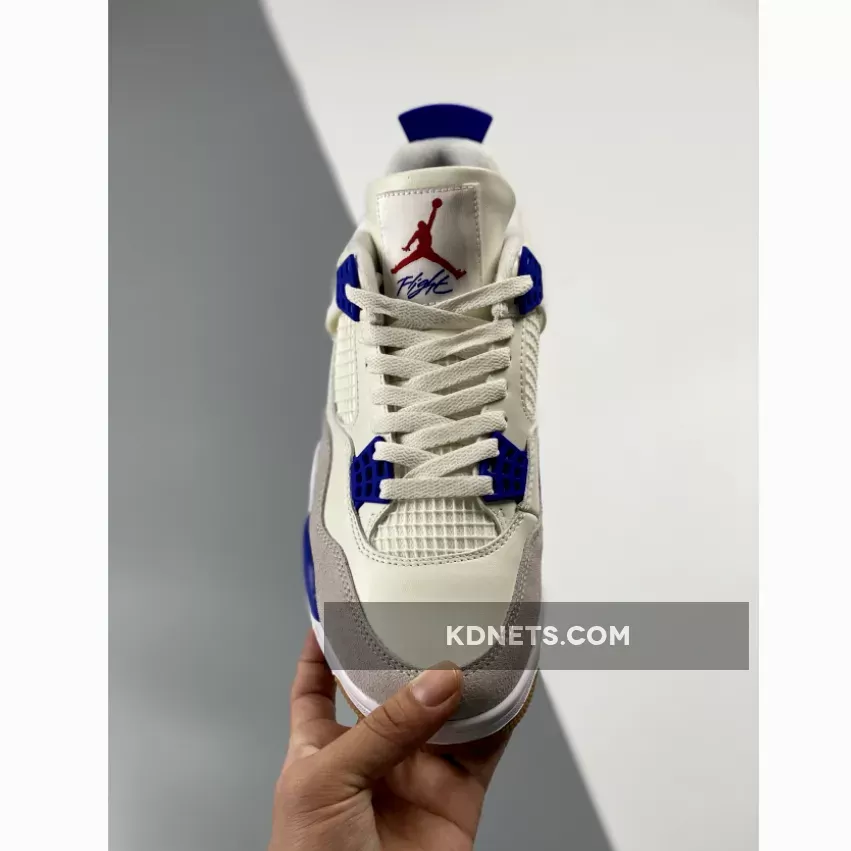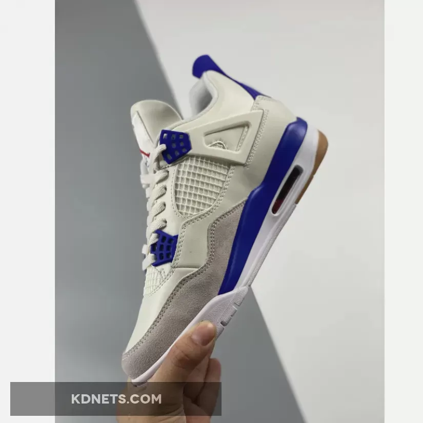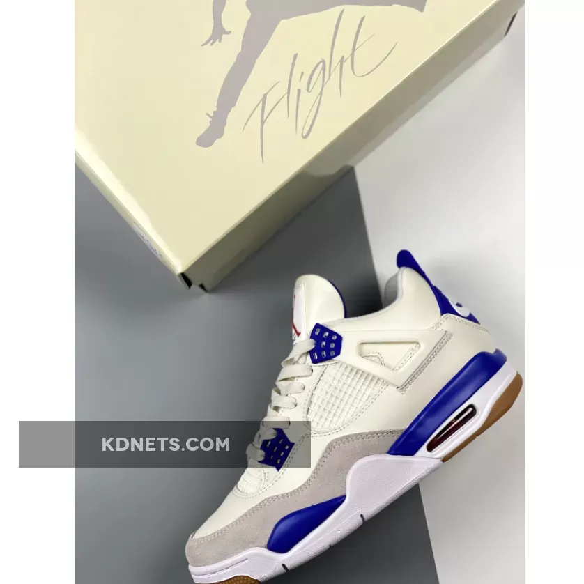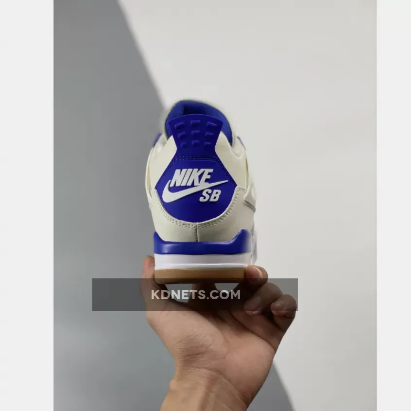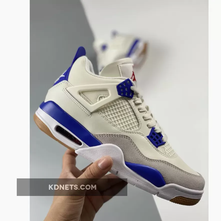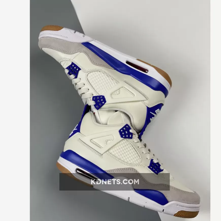 the Nike SB x Air Jordan 4 “Blue/White” is believed to feature premium white leather uppers accented by suede midsoles. Firstly, we get some nice grey suede on the overlays. Secondly, the rest of the upper is covered in white leather. Finally, Co-branding elements come in the form of Jumpman tongue tags, “NIKE SB” at the rear, and printed insoles.