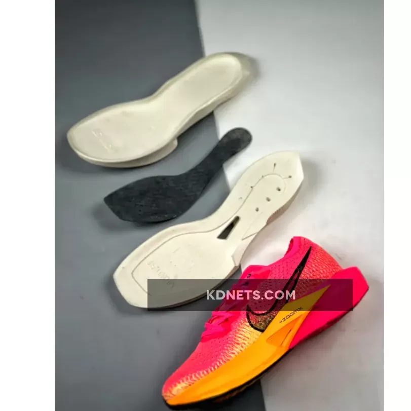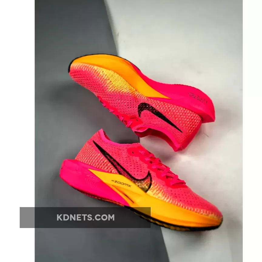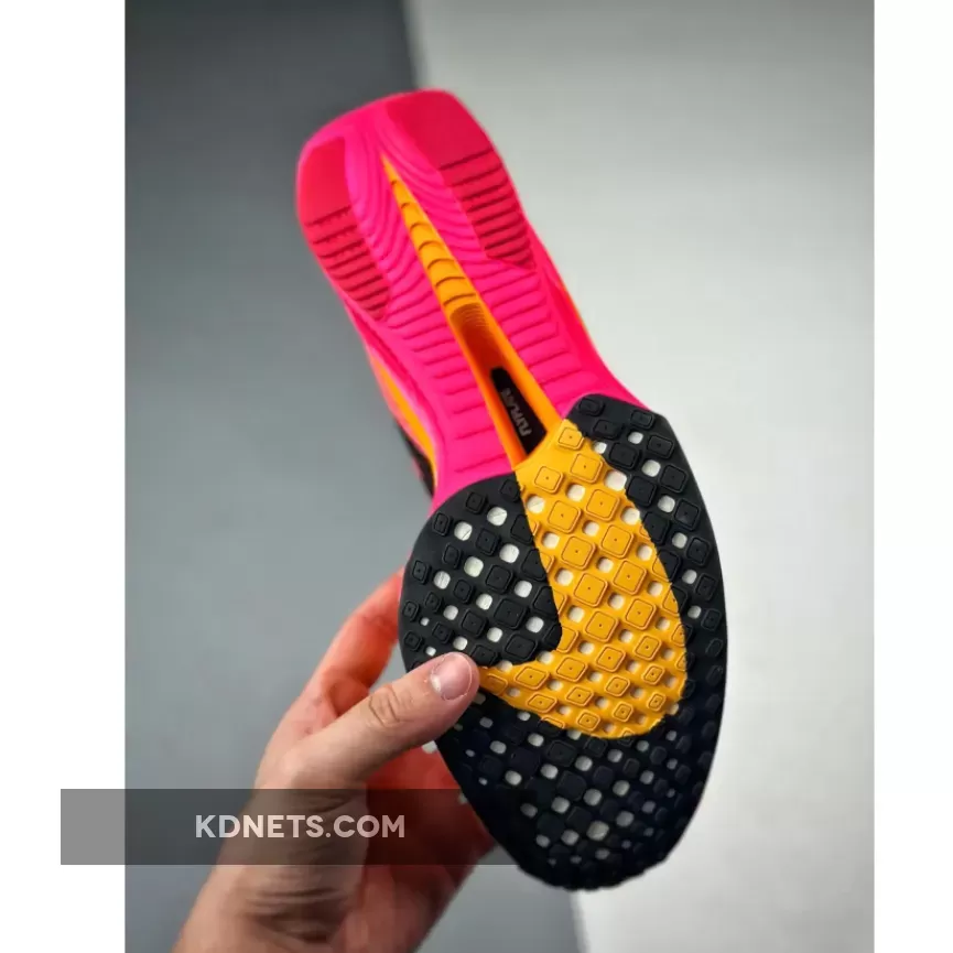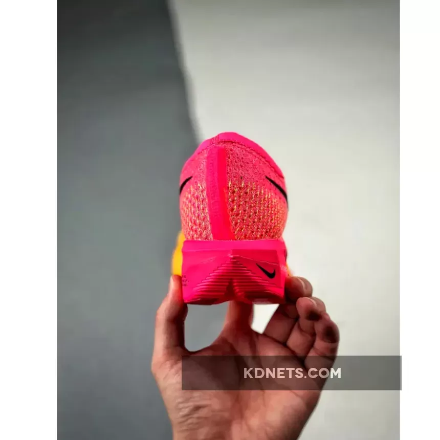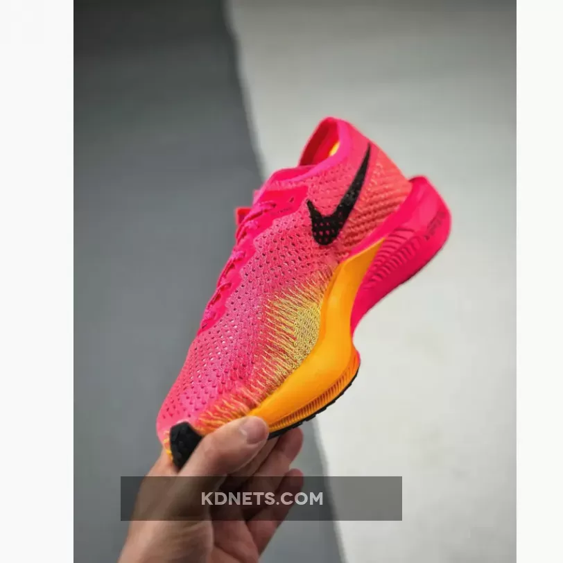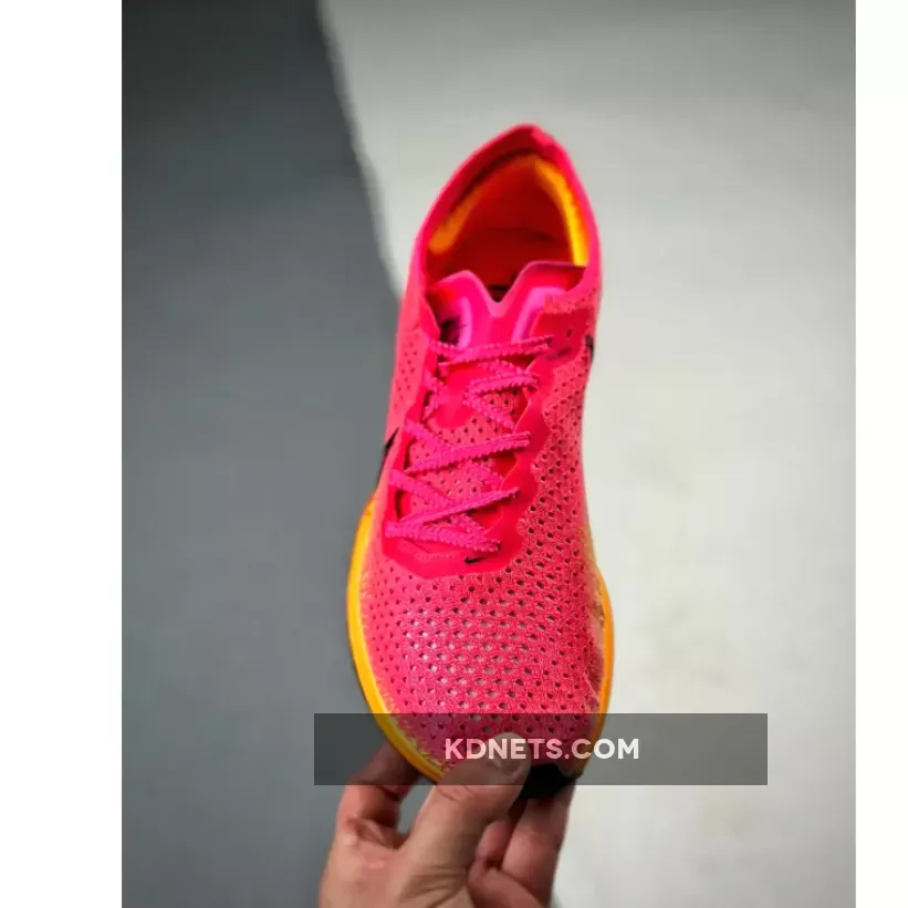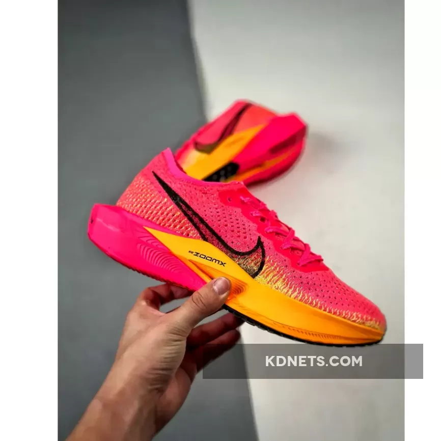 This ZoomX Vaporfly 3 features a daring combination of bold pinks and oranges that are sure to turn heads. The signature profile Swooshes on both the medial and lateral mid-panels are in a burgundy shade.