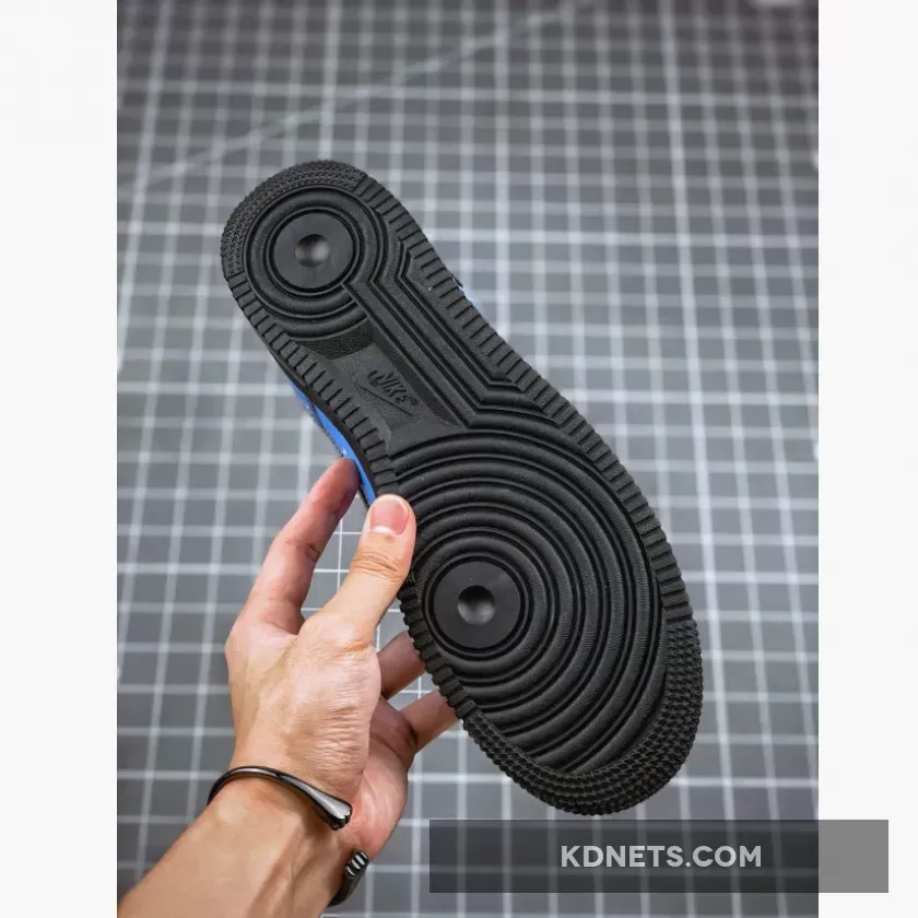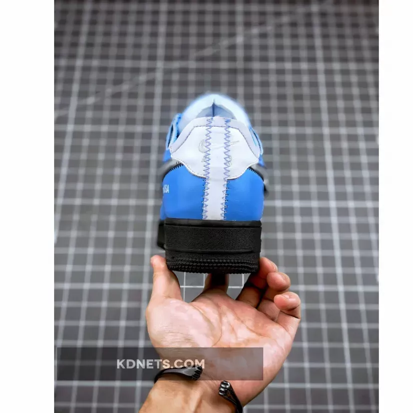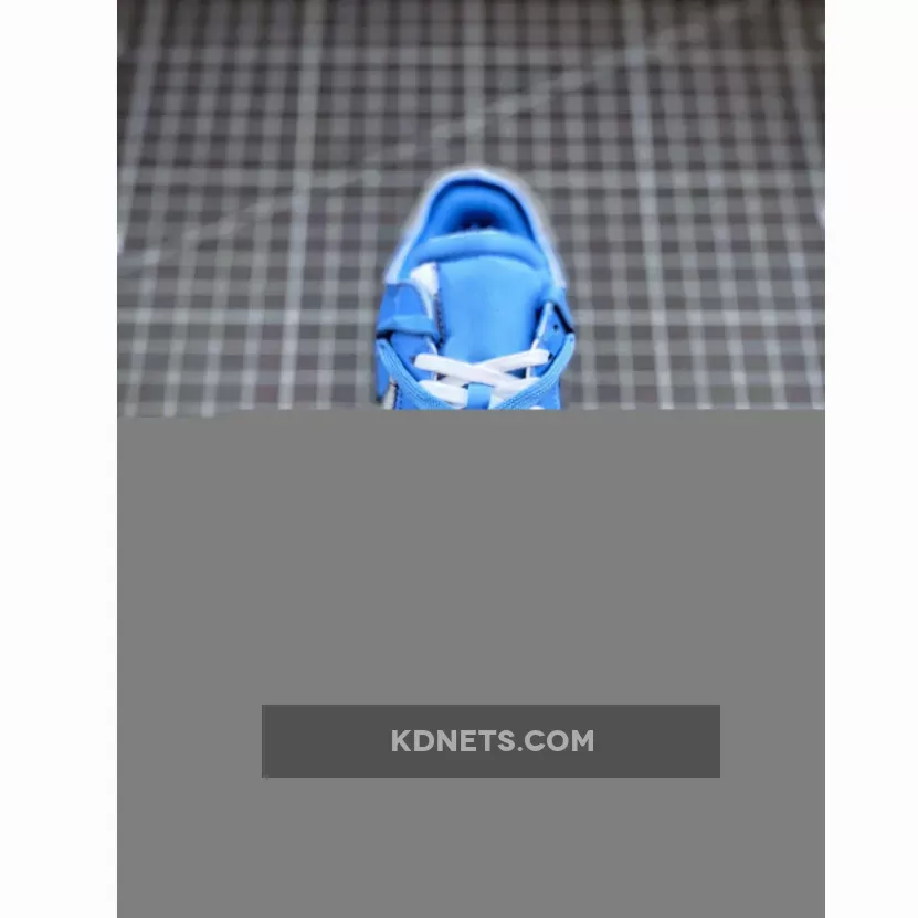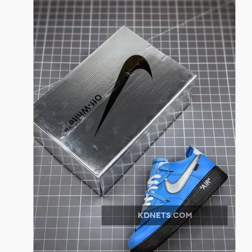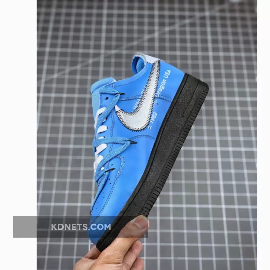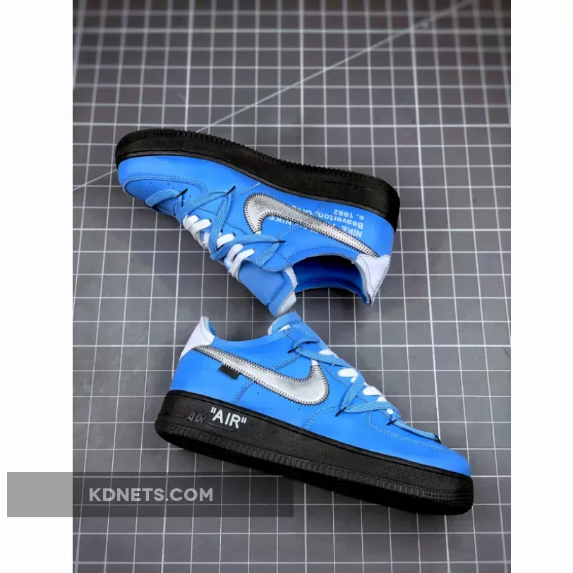 Although the alterations from the standard pair are undeniably distinct, the look is still based around a crisp sky blue leather upper, adorned with metallic silver Swooshes and white Helvetica text on the medial quarter. After that dose of familiarity, however, this model becomes wildly divergent from its predecessor. A doubled-up lacing system with standard white laces over the throat and a set of wide-reaching blue laces secured by black anchors nod to Abloh’s 2019 Dunk Lows. The aforementioned Swoosh may be silver, but it’s surrounded by black thread and a black hangtag in place of the other version’s blue and red accouterments. White leather is placed on the heel tab and heel strip, and for a finishing touch midsoles are done up in black with a white “AIR” hit.