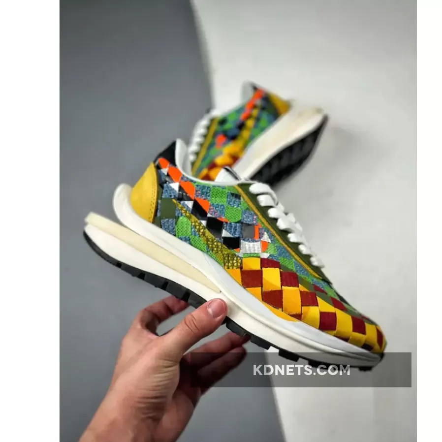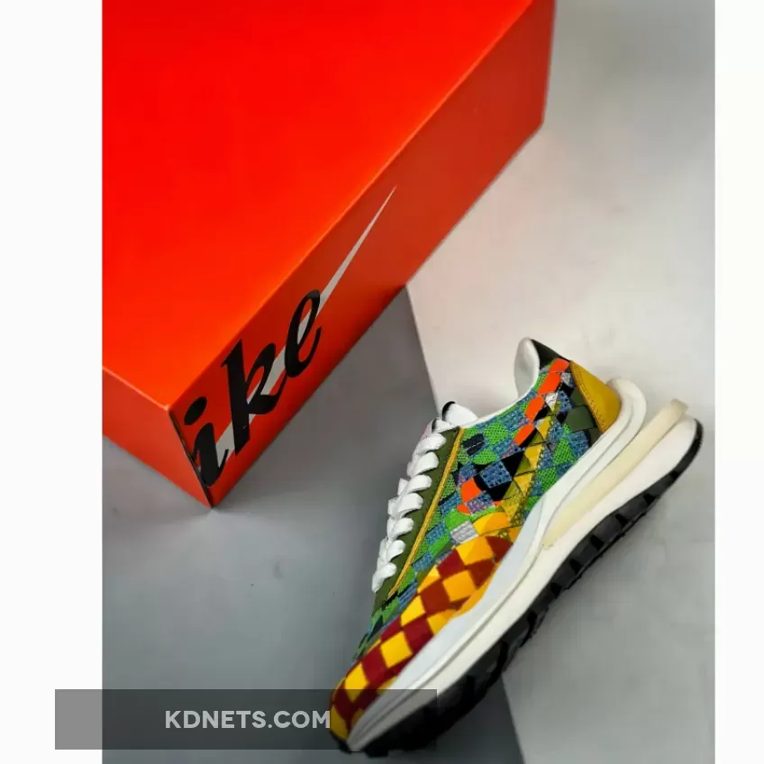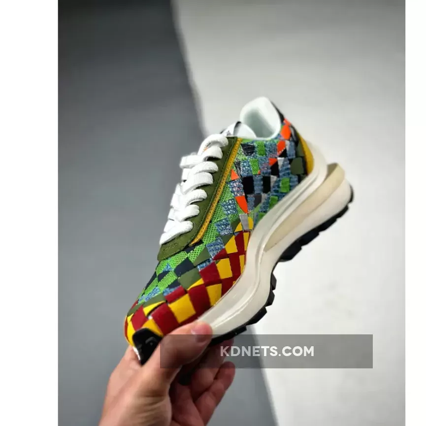 Leather and mesh are woven in a combo of green, red, yellow, and brown near the mudguard and between the upper and sole unit while the base layer features a green mesh spotted throughout the checkerboard design. Suede eyestays host a set of white rope laces that sit atop the doubled tongue which features two hits of sacai x Nike branding.