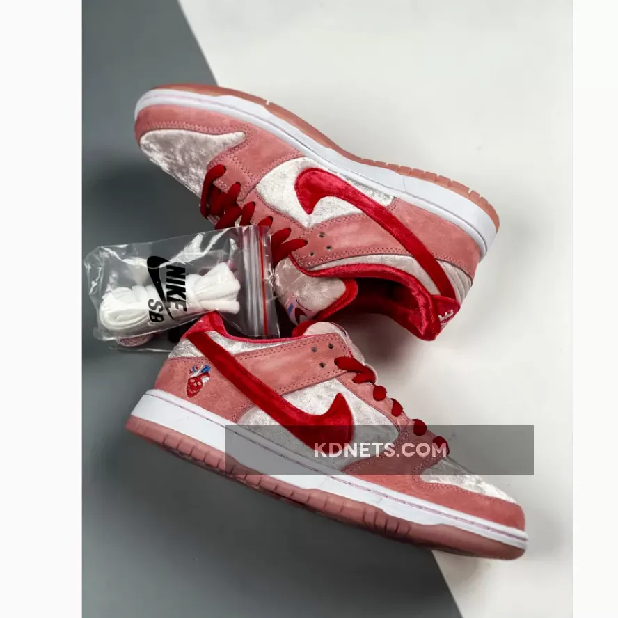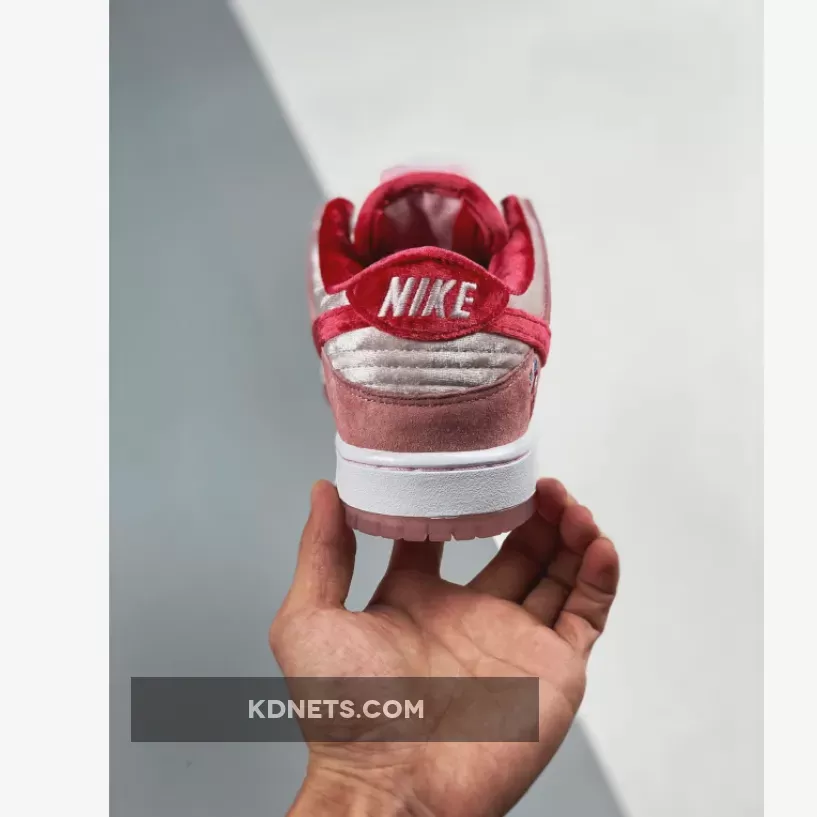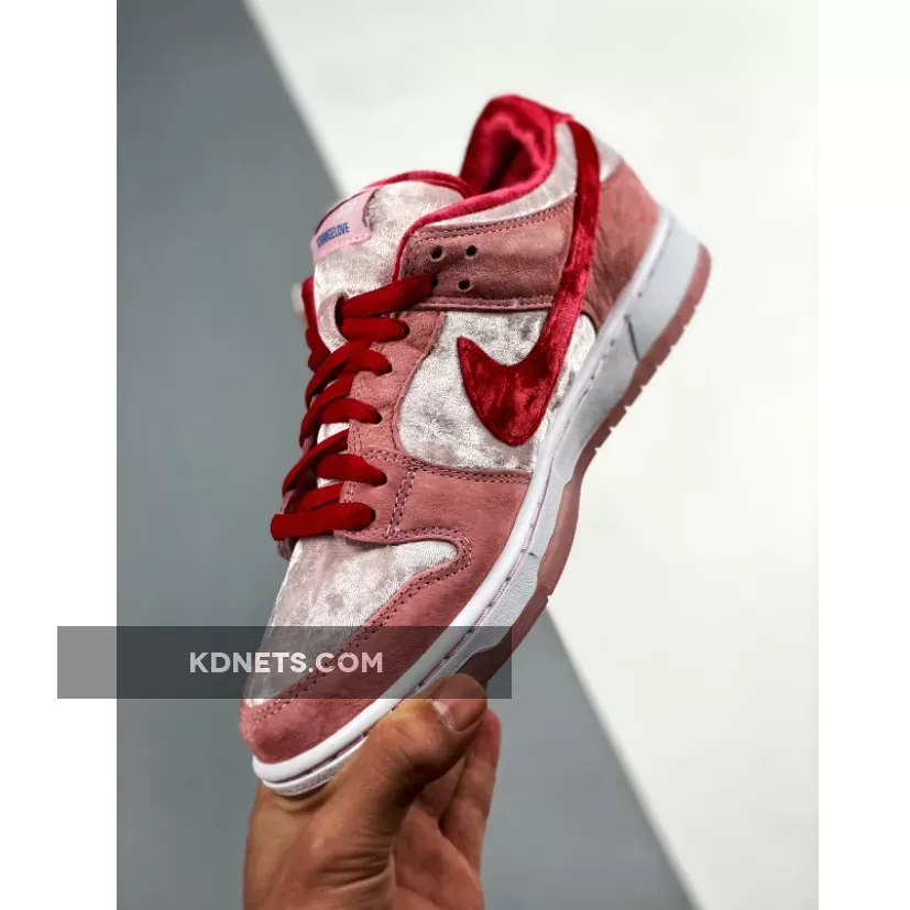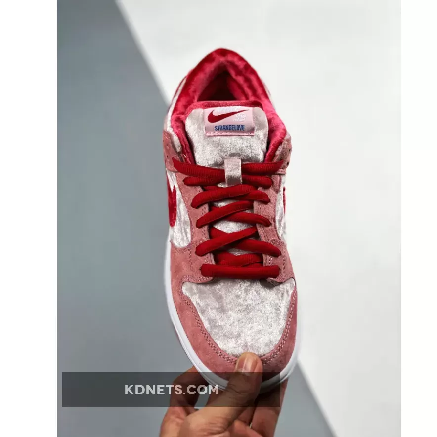 This SB Dunk Low is composed of a pink velvet upper with suede overlays and a red velvet Swoosh. Strangelove branding on the tongue, insole, and translucent outsole completes the design. These sneakers released in February of 2020 and retailed for $100.