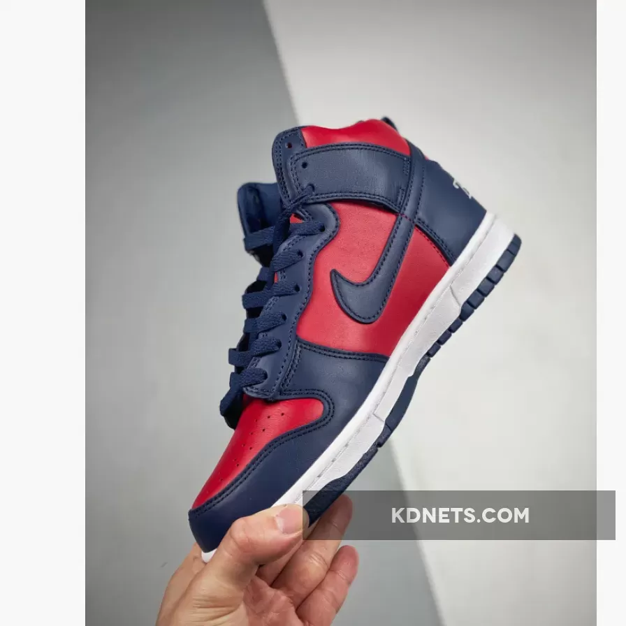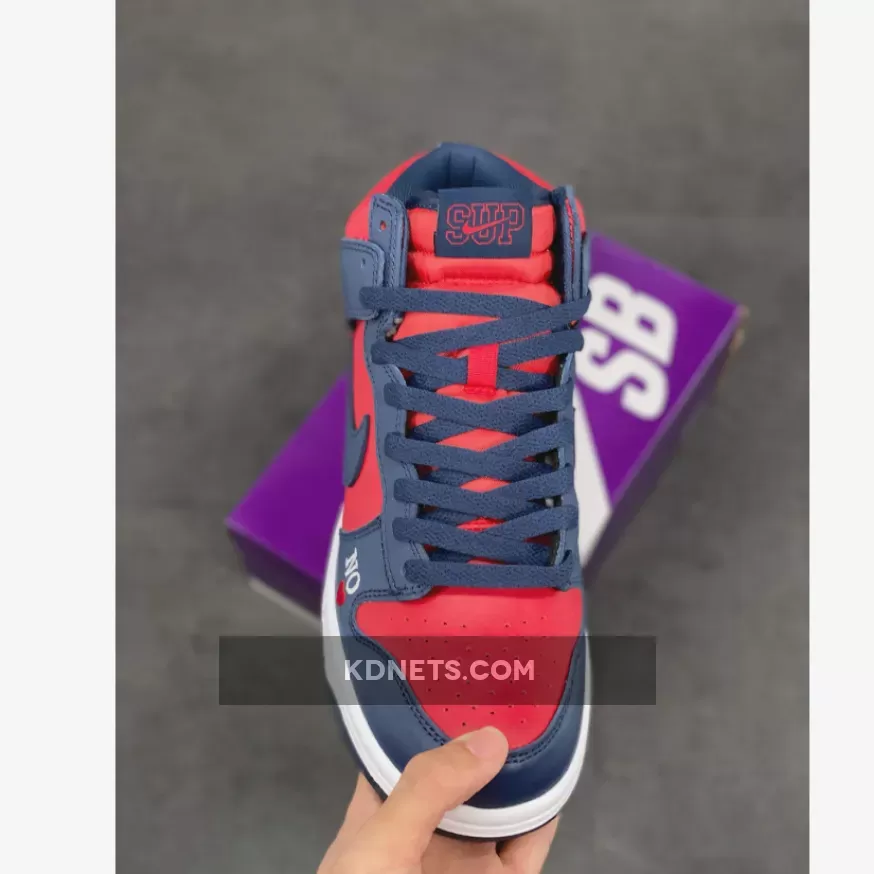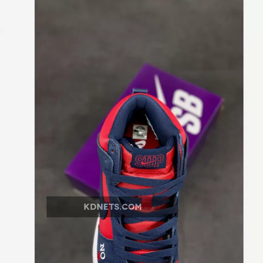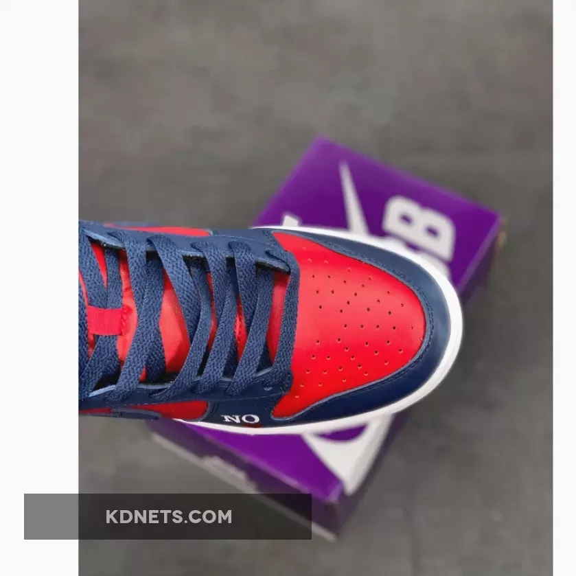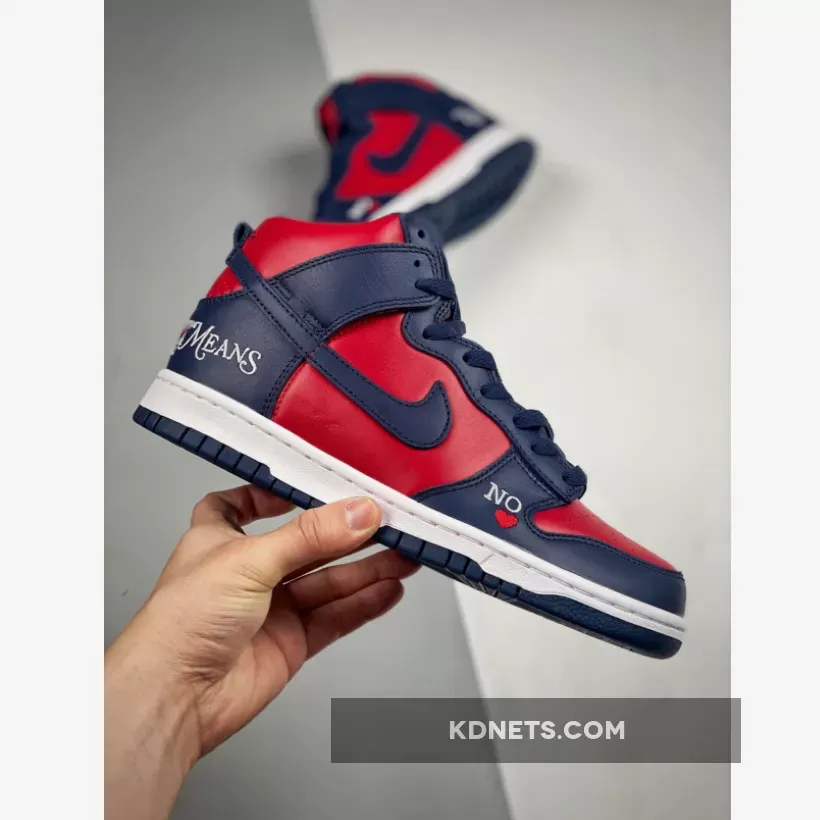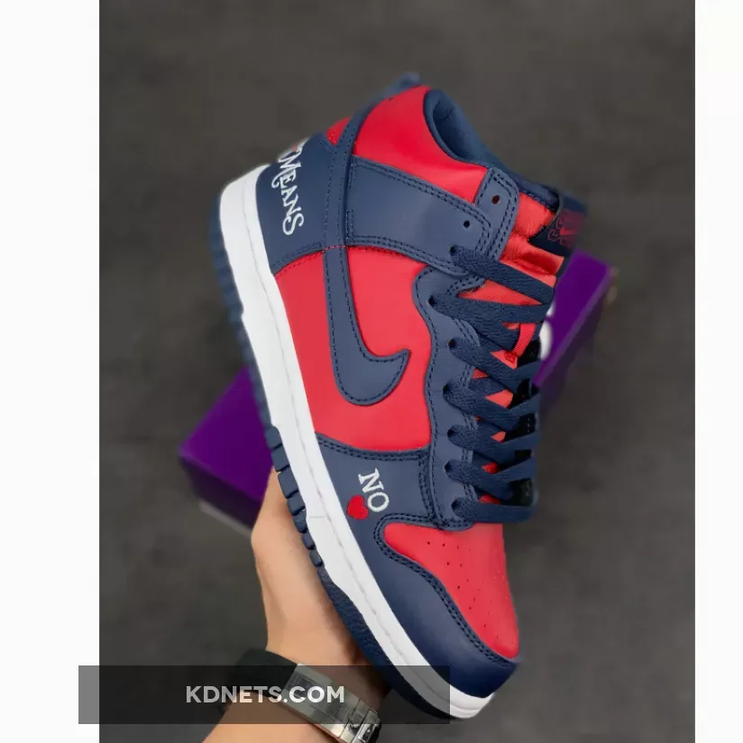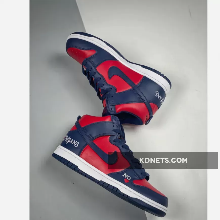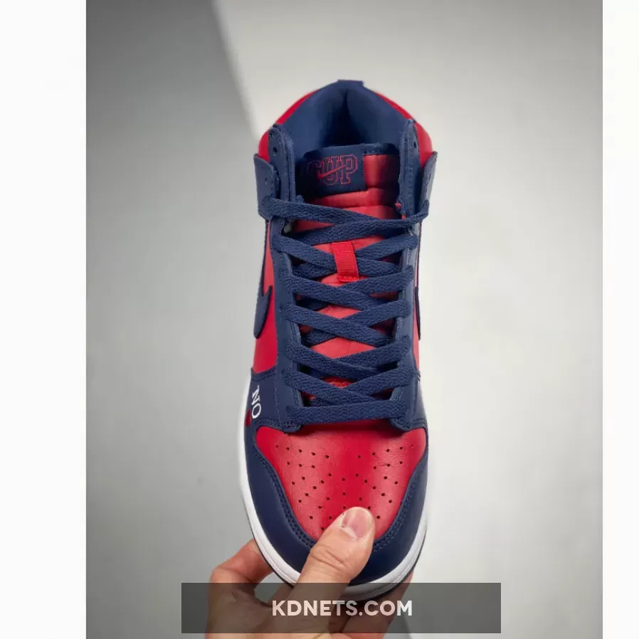 Look effortlessly bold and striking in an instant with the Supreme x Nike Dunk High Navy Red. This pair from the “By Any Means” trio collection delights with a smooth red leather base that animates the perforated toe box, side panels and collar. Contrasting it are navy overlays that cover the toe, throat, heel and ankle areas.
