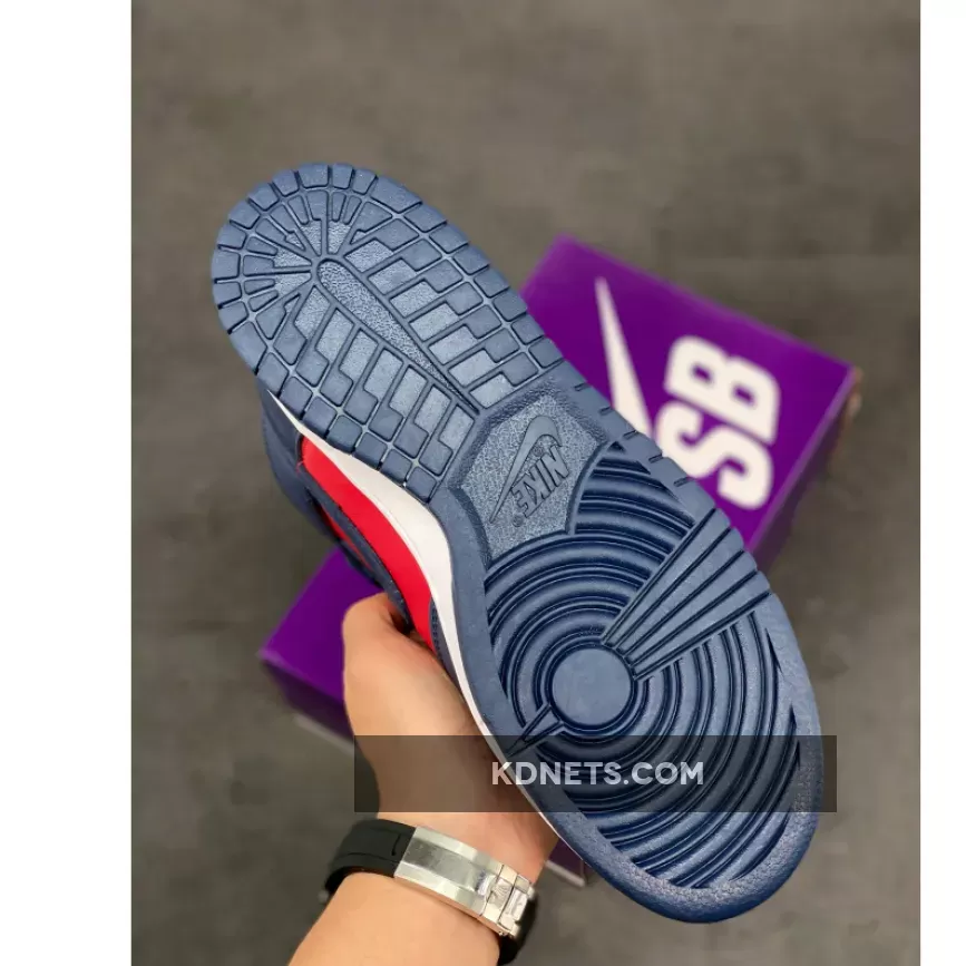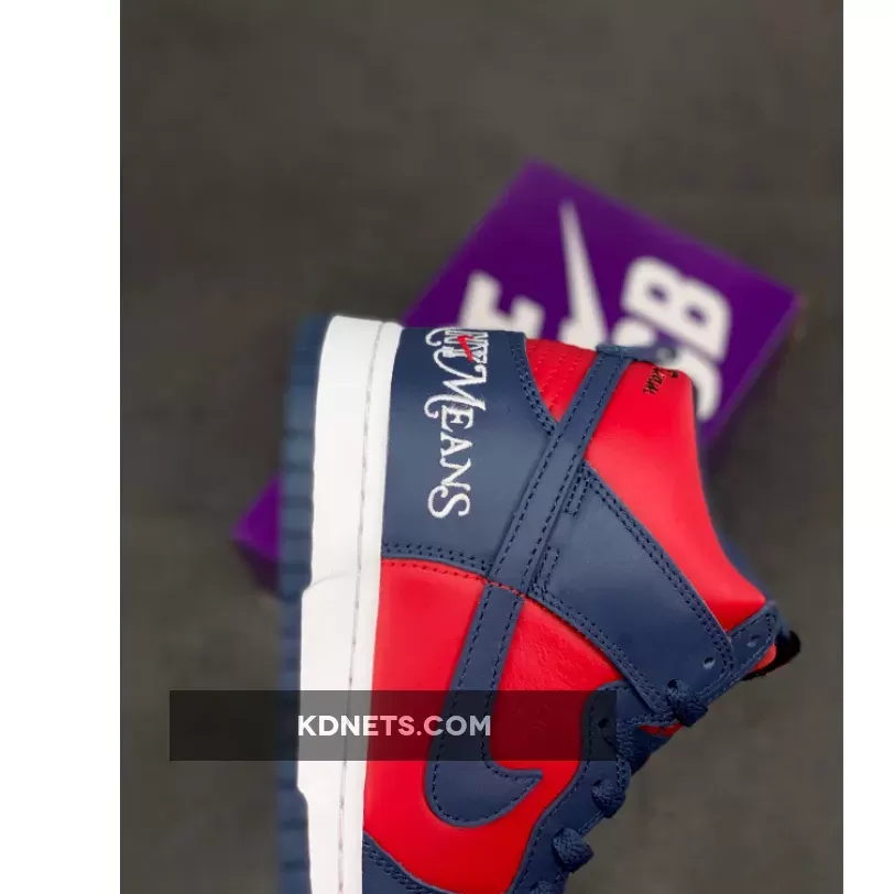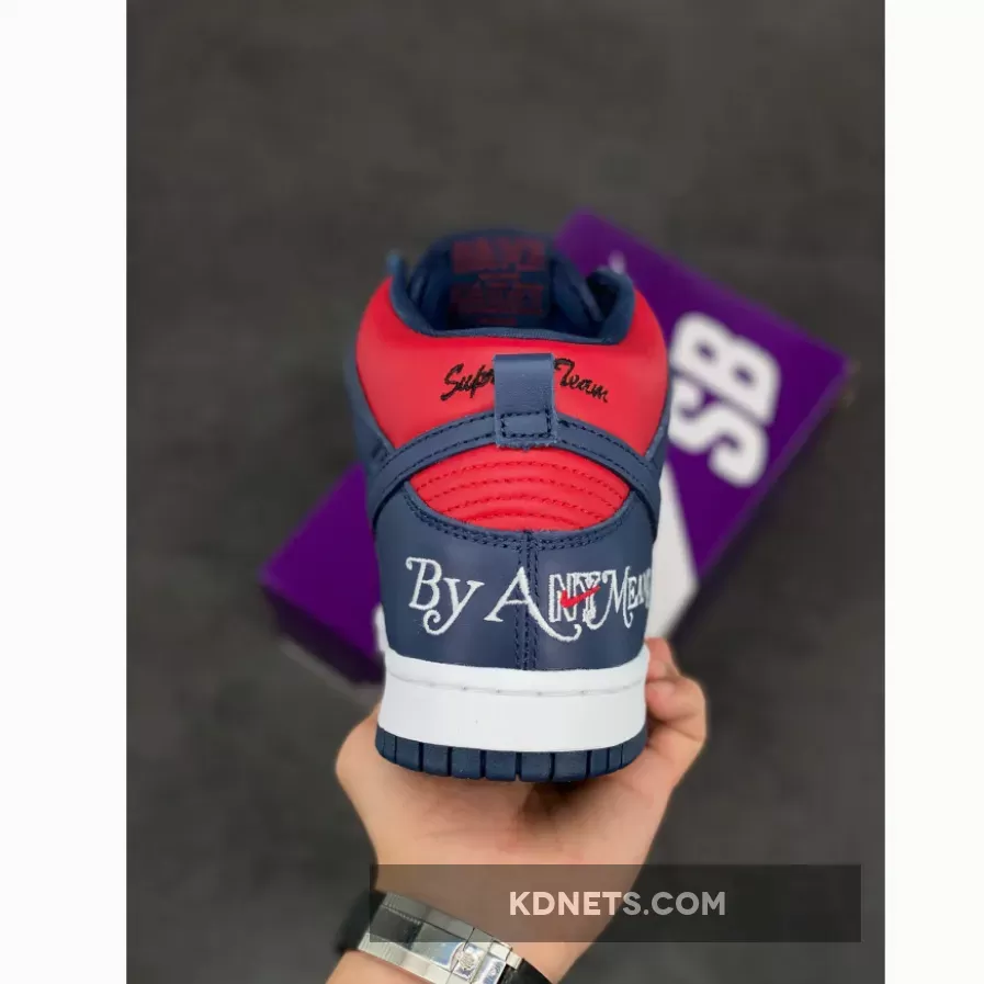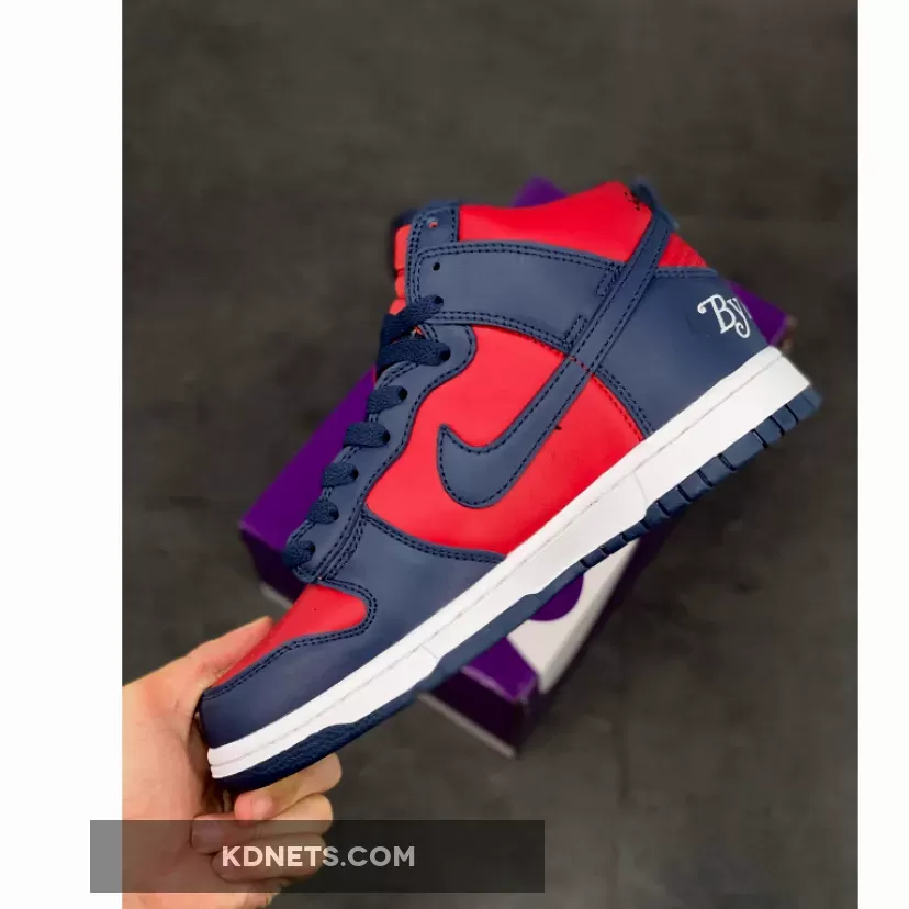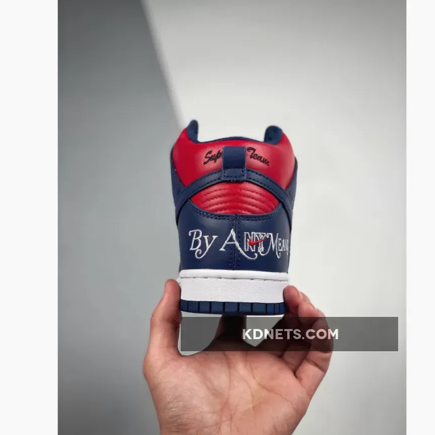 Sleek Supreme design meets classic Nike SB Dunks. Love the navy & red combo, the intricate embroideries & the comfy leather. Perfect for skate or street style! #SupremeNike #SBDunkHigh #ByAnyMeans