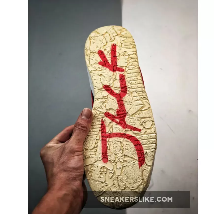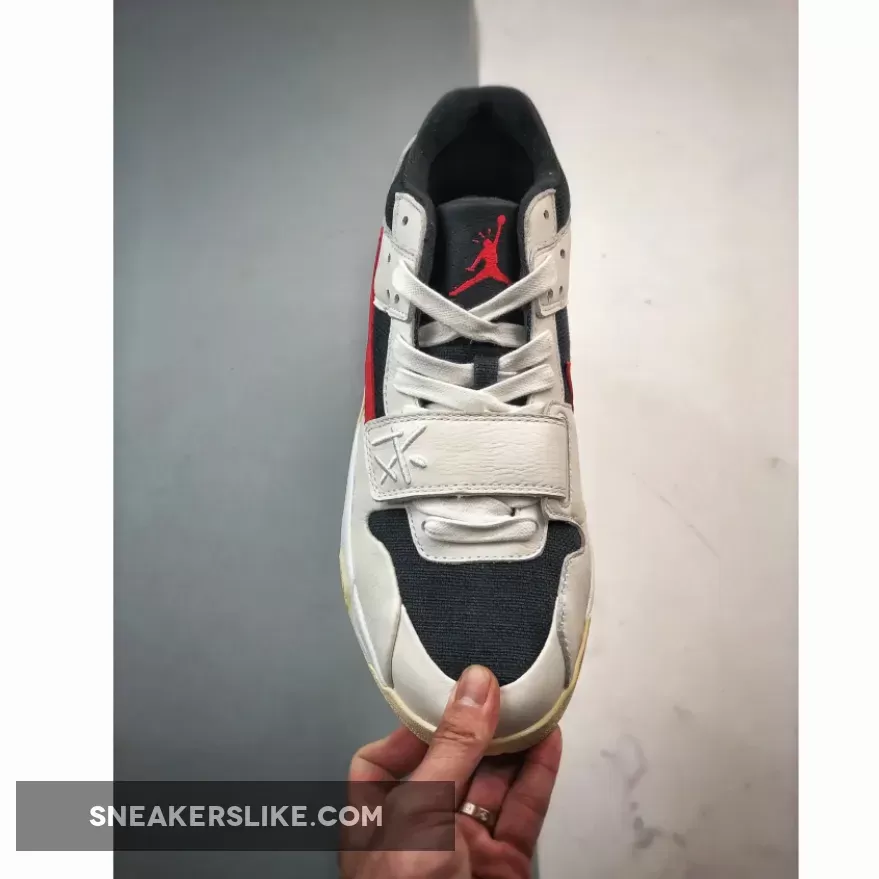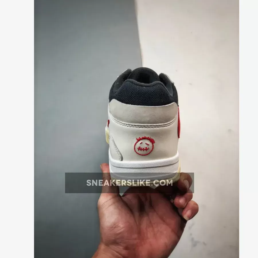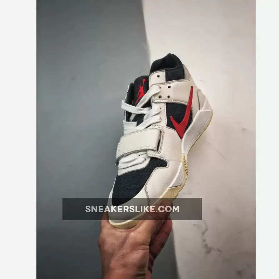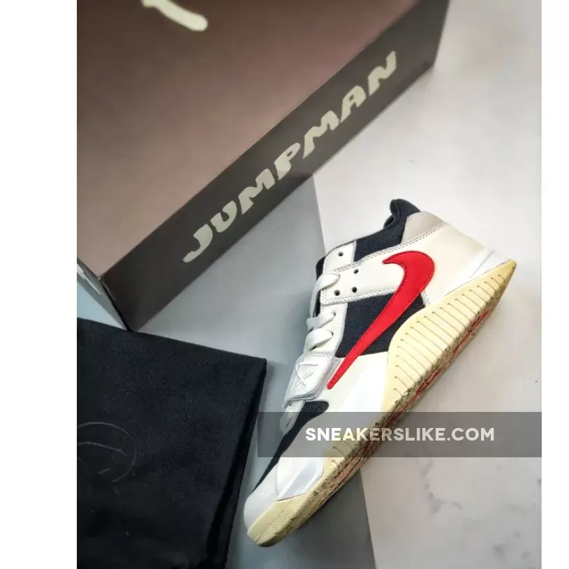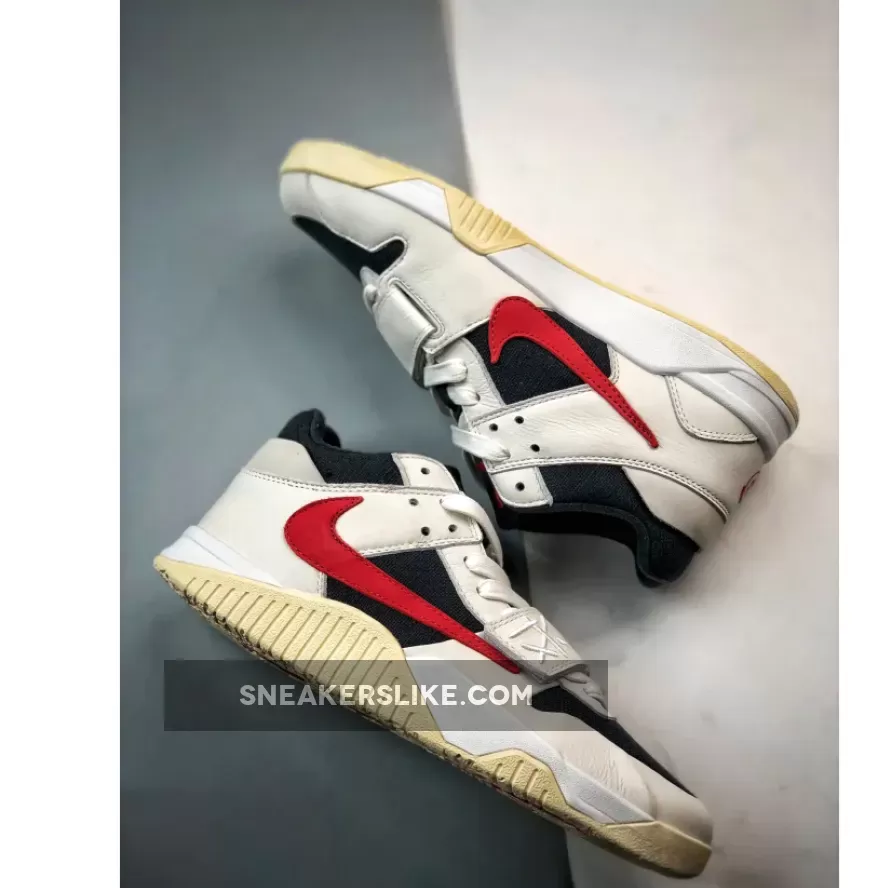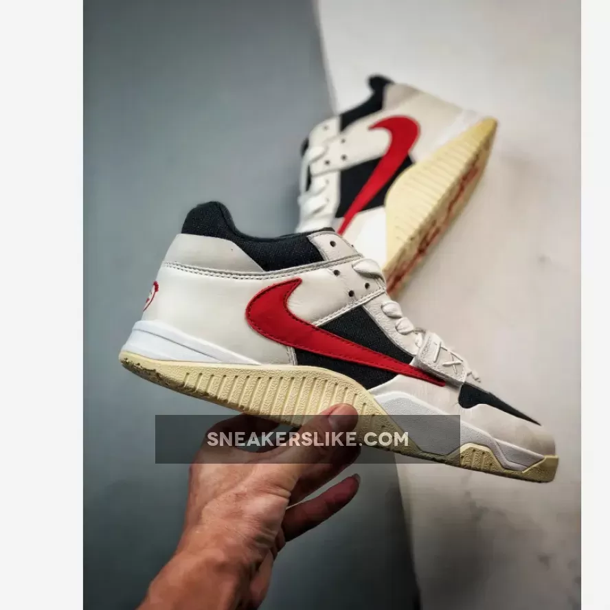 This pair has just been unveiled, sporting “University Red” at its Swooshes, the tongue’s Jumpman logo and the embroidered Cactus Jack face logo at the heel. Similar to the aforementioned “Sail” pair, a textile base is joined by leather overlays with this colorway utilizing black and white at the two areas respectively. Its signature midfoot strap is also featured in white leather while the sole unit pairs a white midsole with an off-white outsole.