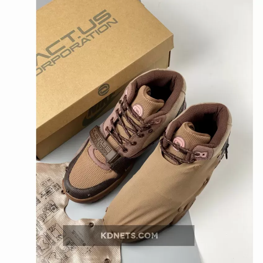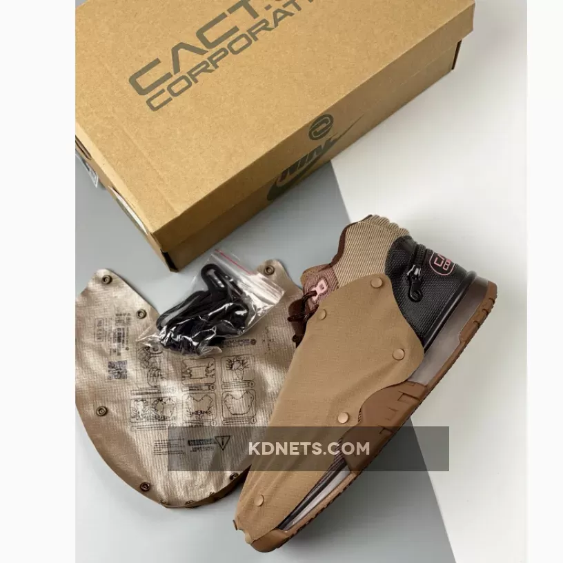 the model is defined by its canvas/corduroy-like construction, while other design elements consist of a removable protective sheath, a zipper across the heel, and CACT.US CORPORATION branding on the forefoot strap, the tongues swap out the usual Nike logos for Scott’s latest signature logo.