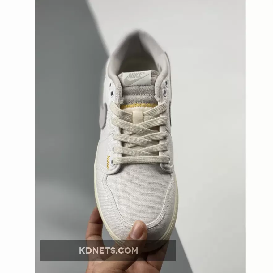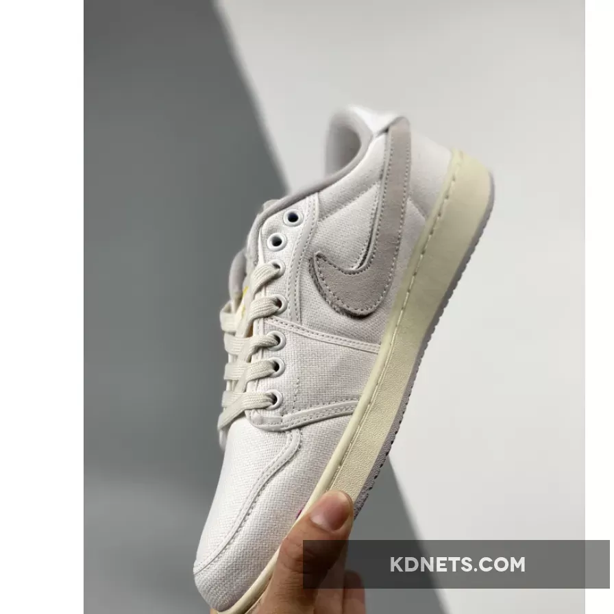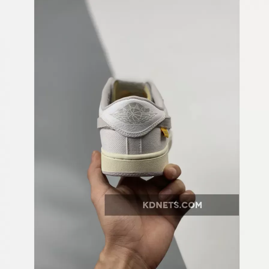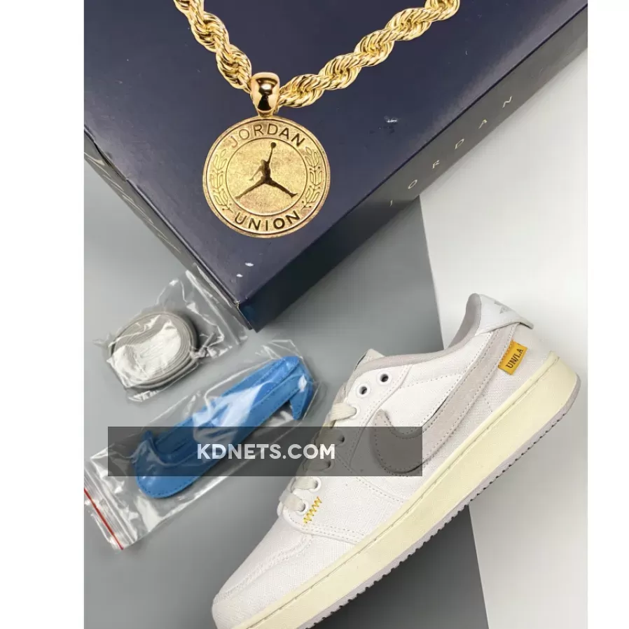 this offering of the Union x Air Jordan 1 KO Low comes dressed in a mix of White, Sail, University Gold, and Neutral Grey, a full canvas upper and a hybrid construction that draws from both the KO and the OG Air Jordan 1 Low, which is set off with “aged” midsoles, UNION tags that hang from the Swooshes, exposed foam tongues and thick heel badges. However, the most interesting detail is served up by the interchangeable swooshes, which come in either grey or sky blue. Each pair also comes packaged in a custom box with an image of a thick gold medallion on its lid.Extra set of laces housed in co-branded packaging completes the design.